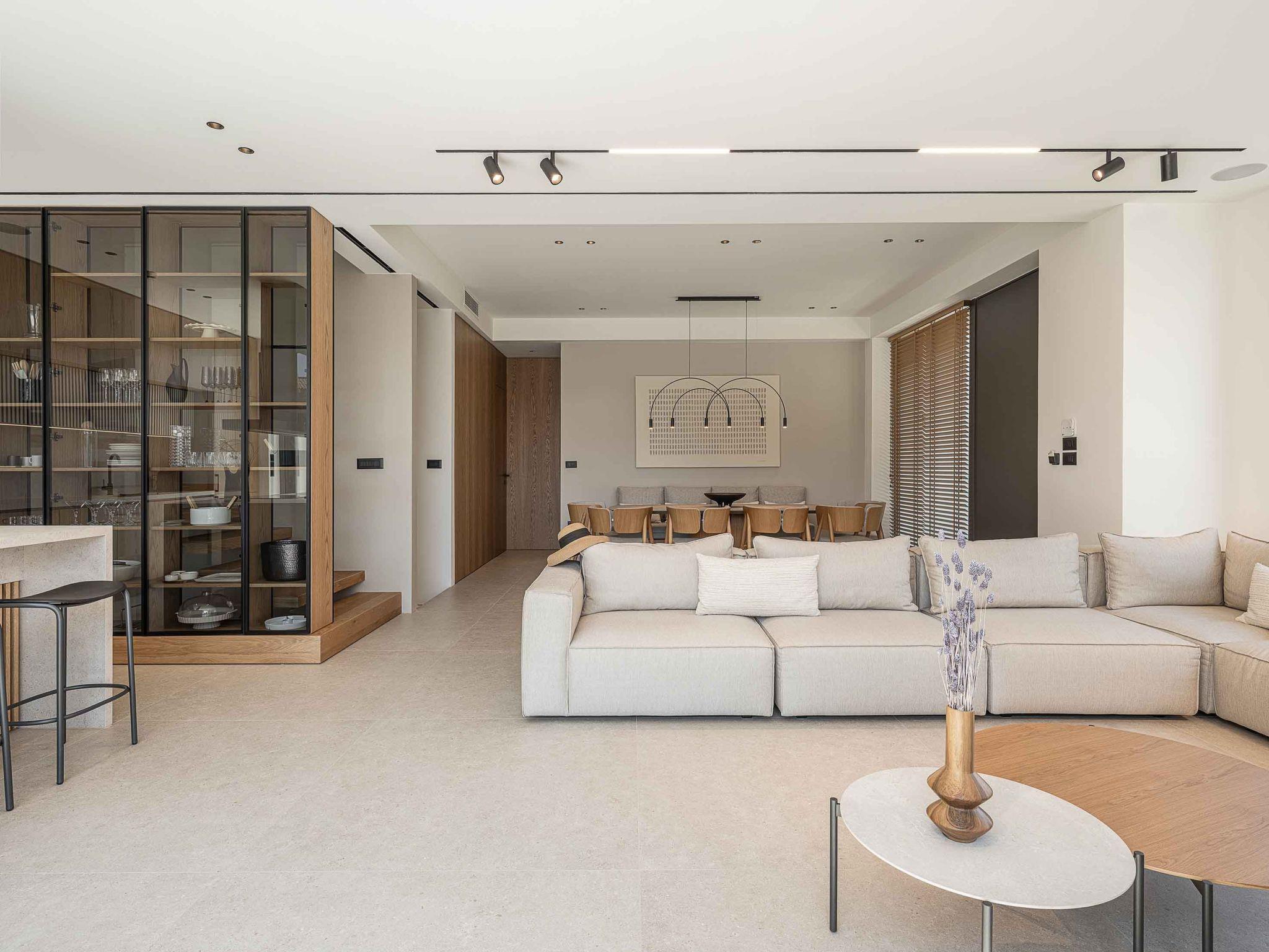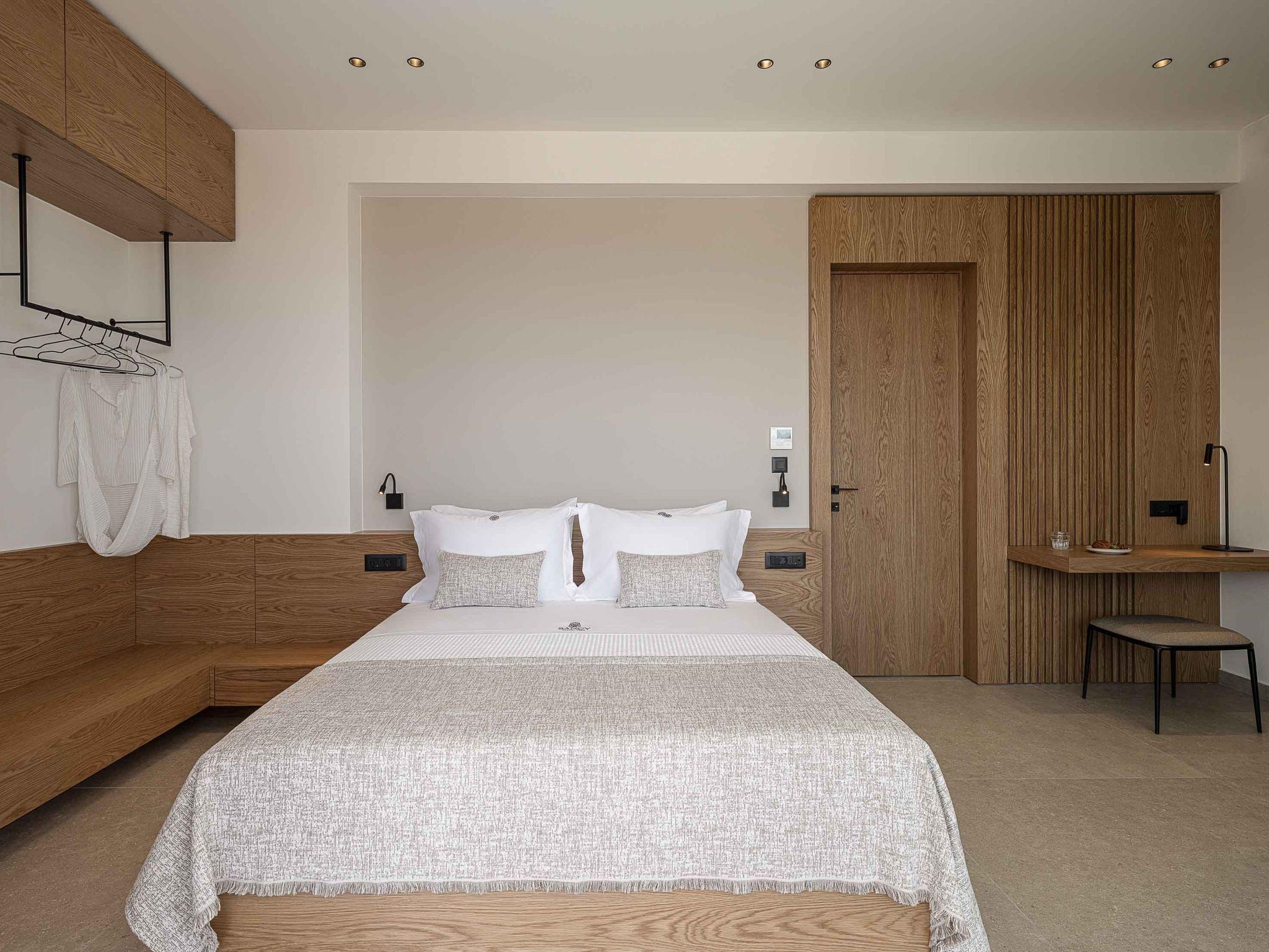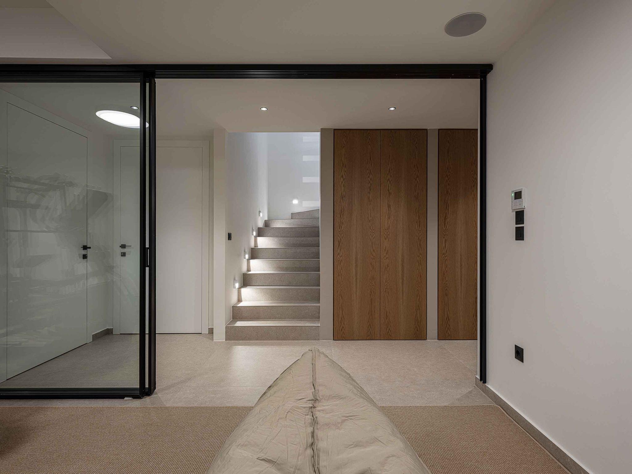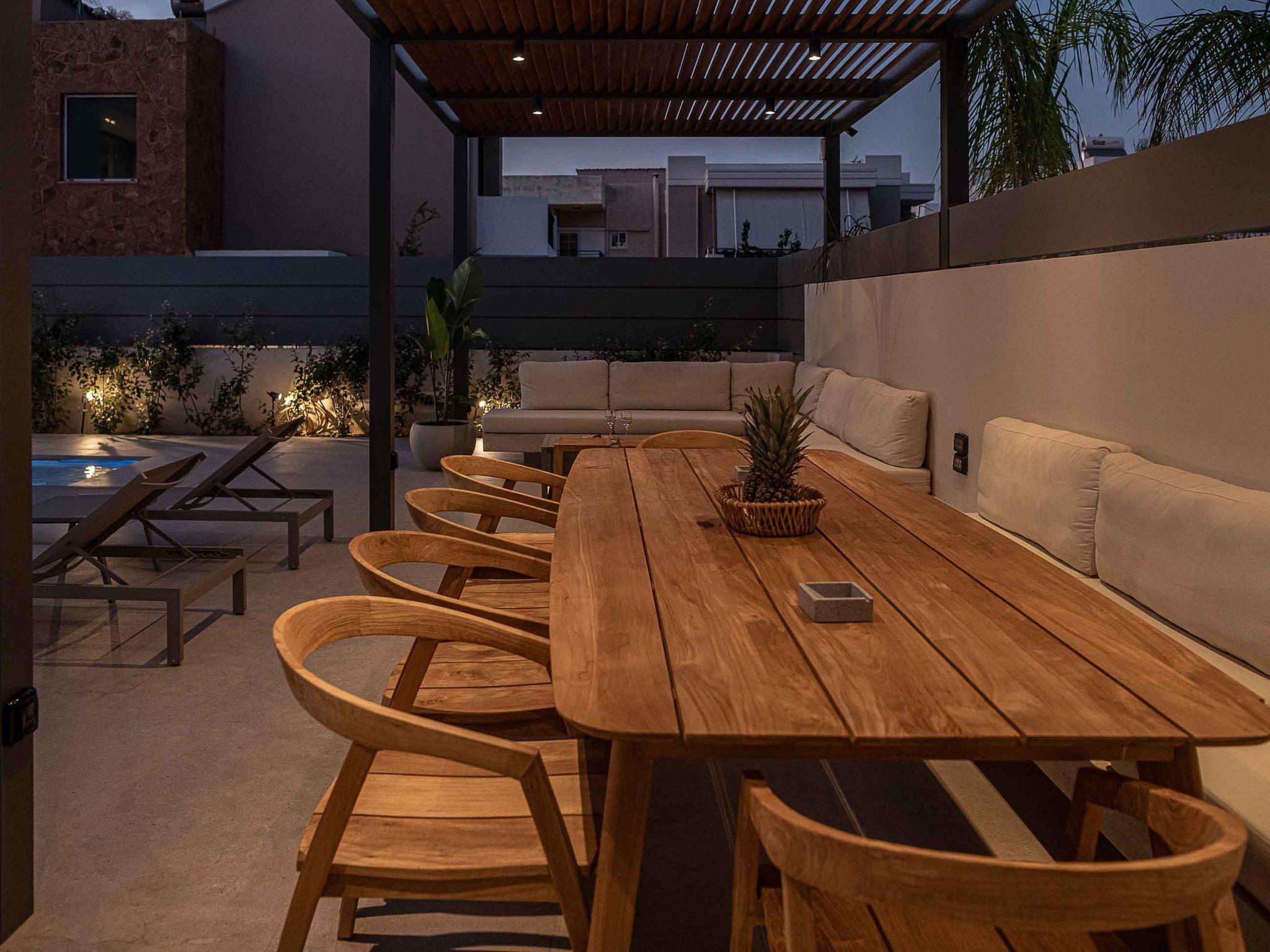 On the lower level, there is one more bedroom with a shower and a double-sized bed. On the same floor, there is a Gym with all the necessary equipment to keep you fit on your vacation. In addition, there is a Playroom with a PlayStation 5 console where your kids can enjoy the games while you enjoy the Creta Sky, full of stars. The minimal furnishing of the house, the neutral palette of colours and the use of wood create the perfect haven for you to lay your hair down and relax away from the fast pace of life. Every little detail in this residence is specifically selected and designed to create a very friendly but at the same time comfortable and luxurious environment for our guests.