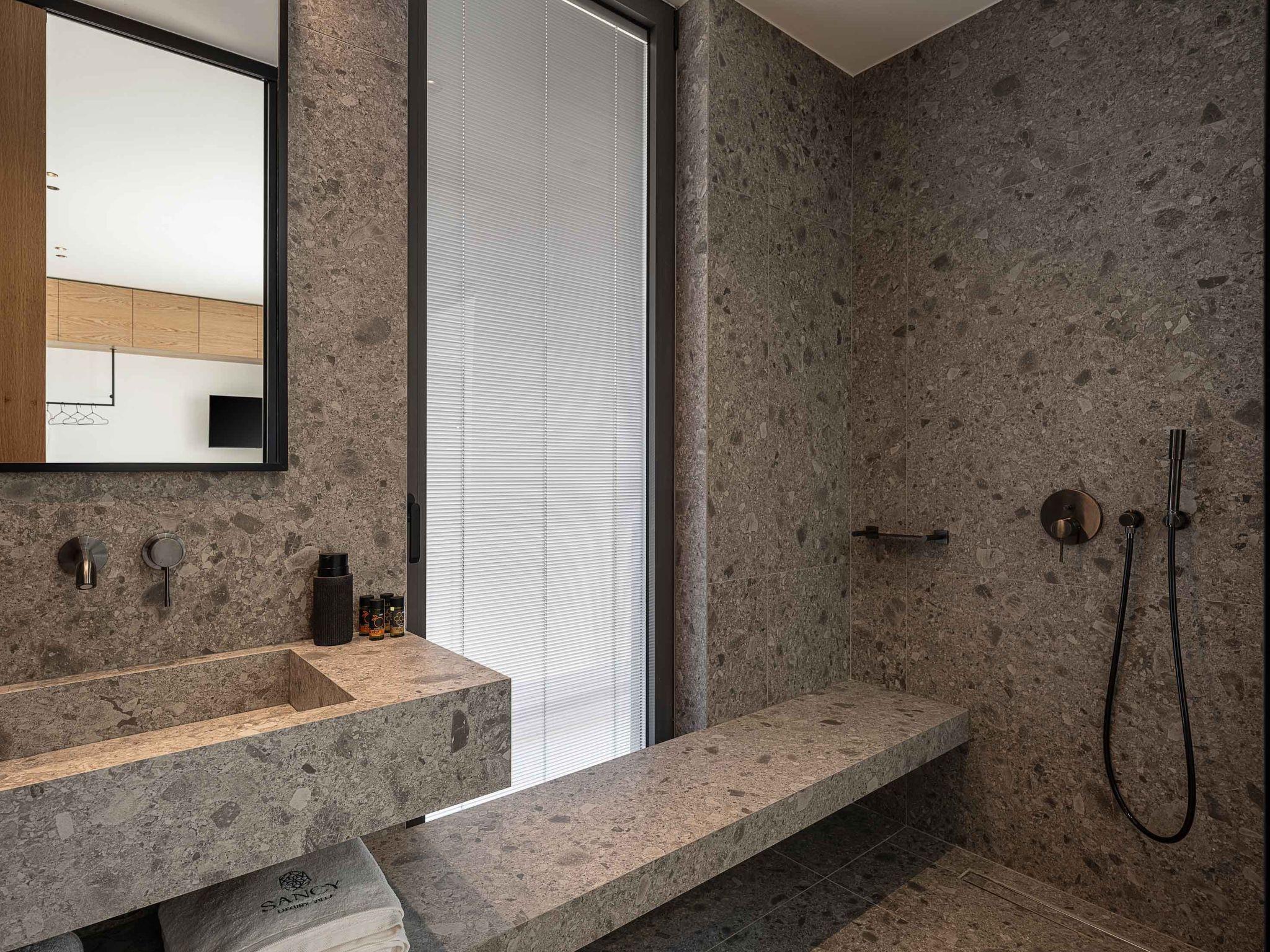 Sancy Villa is a three-floor building of 300 sqm, which can host up to 12 people, ideal for family or friends. The real heart of the home is the open-concept kitchen which is situated on the ground floor, fully equipped with branded appliances and facilities, making holiday cooking a most pleasurable experience. and a dining table for 12 people. Right next to the kitchen, there is an airy living room with a flat-screen ’’ TV and an amazing view of the exterior area of the villa. The large windows create the illusion of transparency and provide a seamless transition between the indoor and outdoor areas. The villa has direct access to the pool from the living room. On the same floor, there are two spacious bedrooms with twin-size beds which can be converted into a double. These two bedrooms offer tranquillity to our guests. One of the bedrooms offers an ensuite bathroom with a shower. On the same floor, there is a communal bathroom for all the guests with a shower.