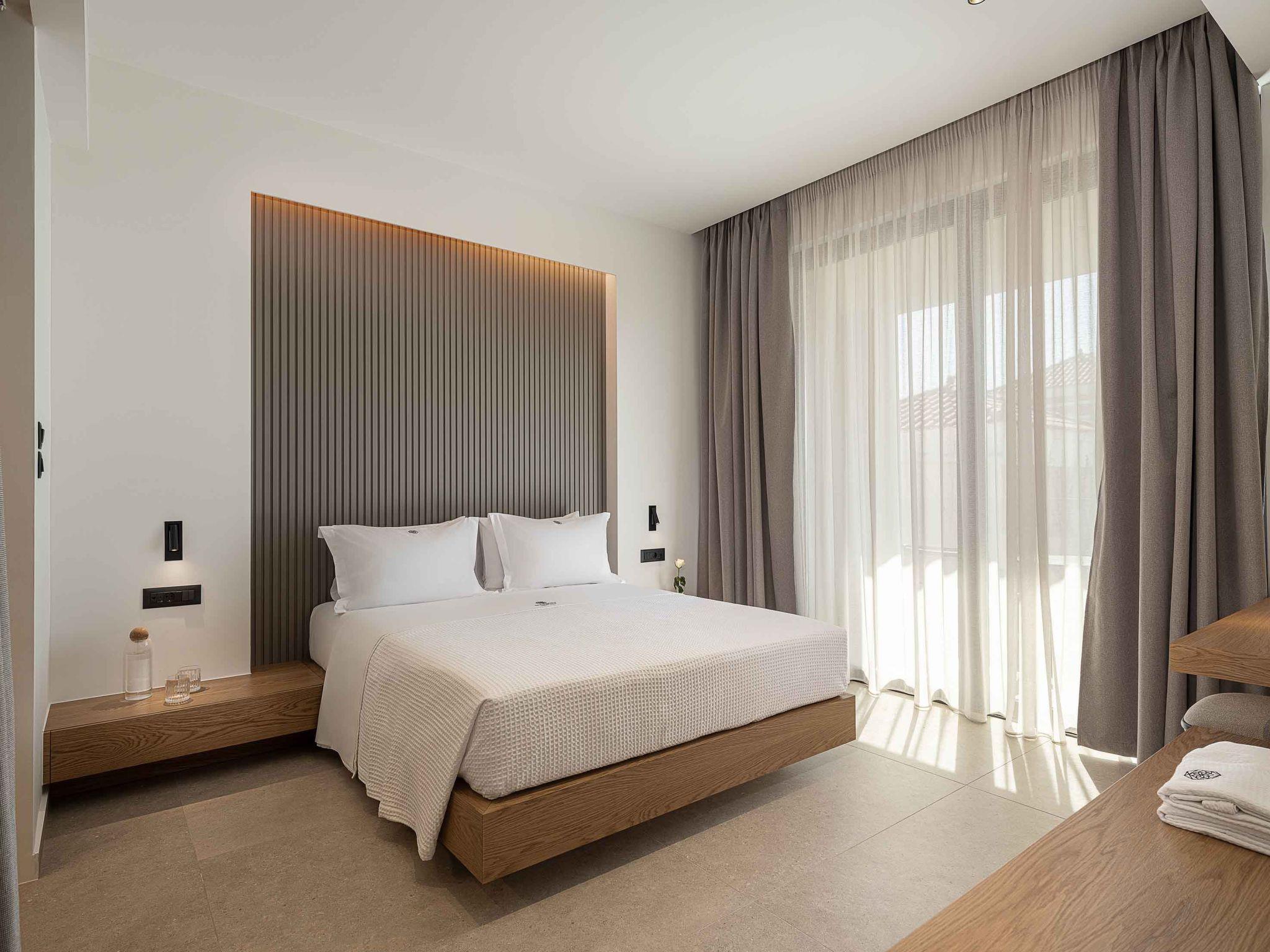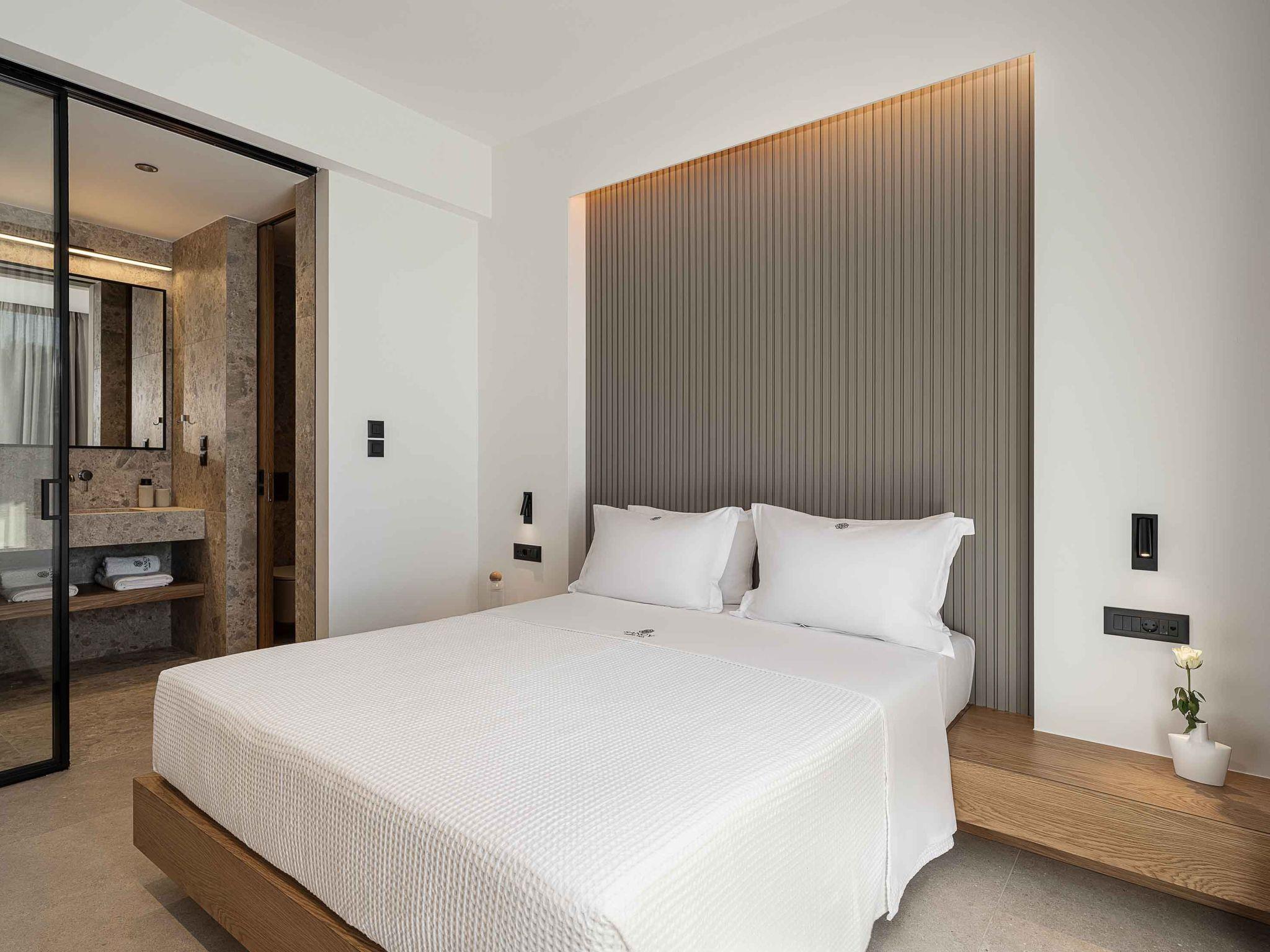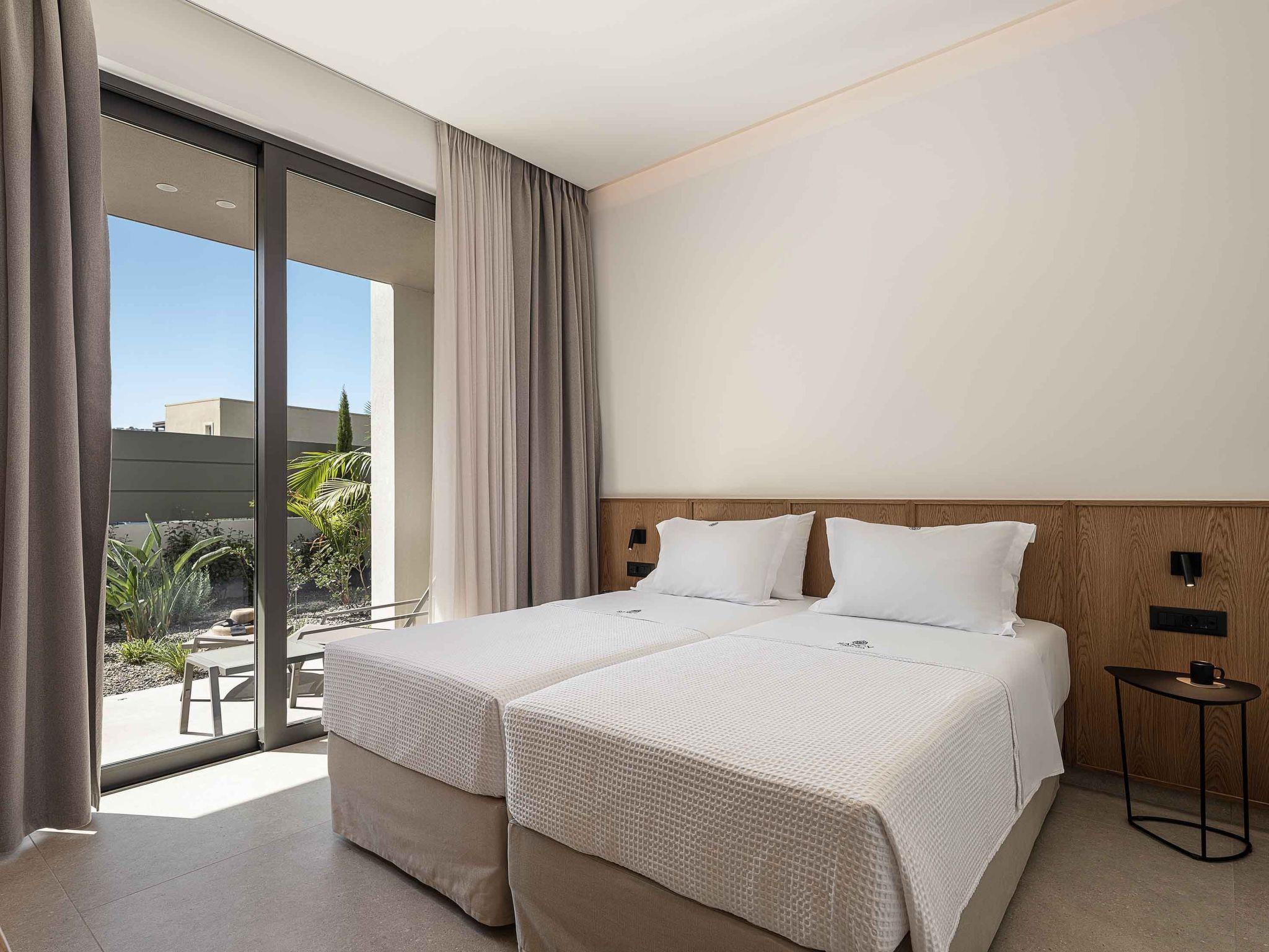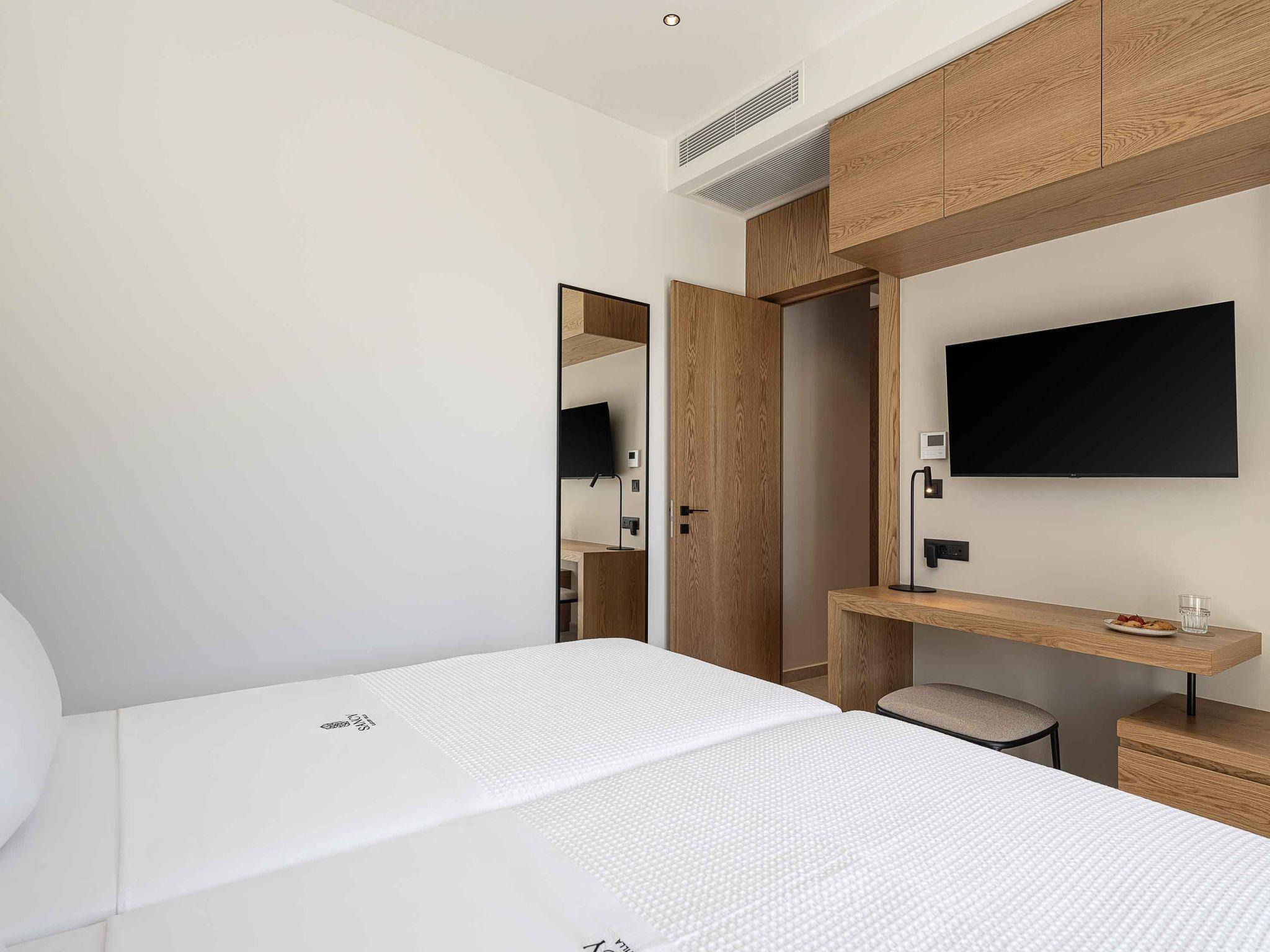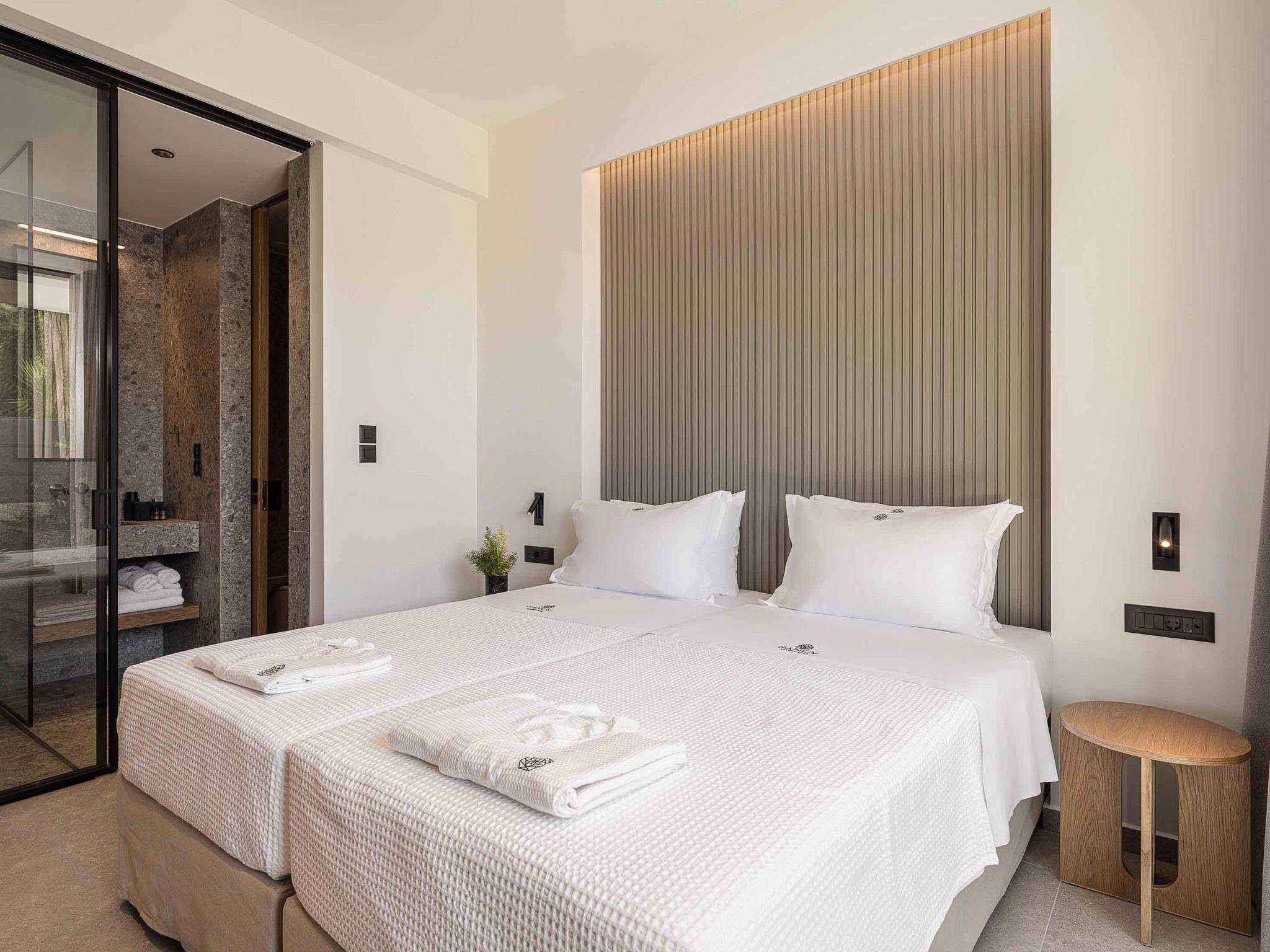 Bedroom 1: Twin-size beds (0,90*2.00) that can be converted into a double one with Coco-Mat mattress, ensuite bathroom with shower, A/C, 43’’ Smart TV, direct access to the backyard