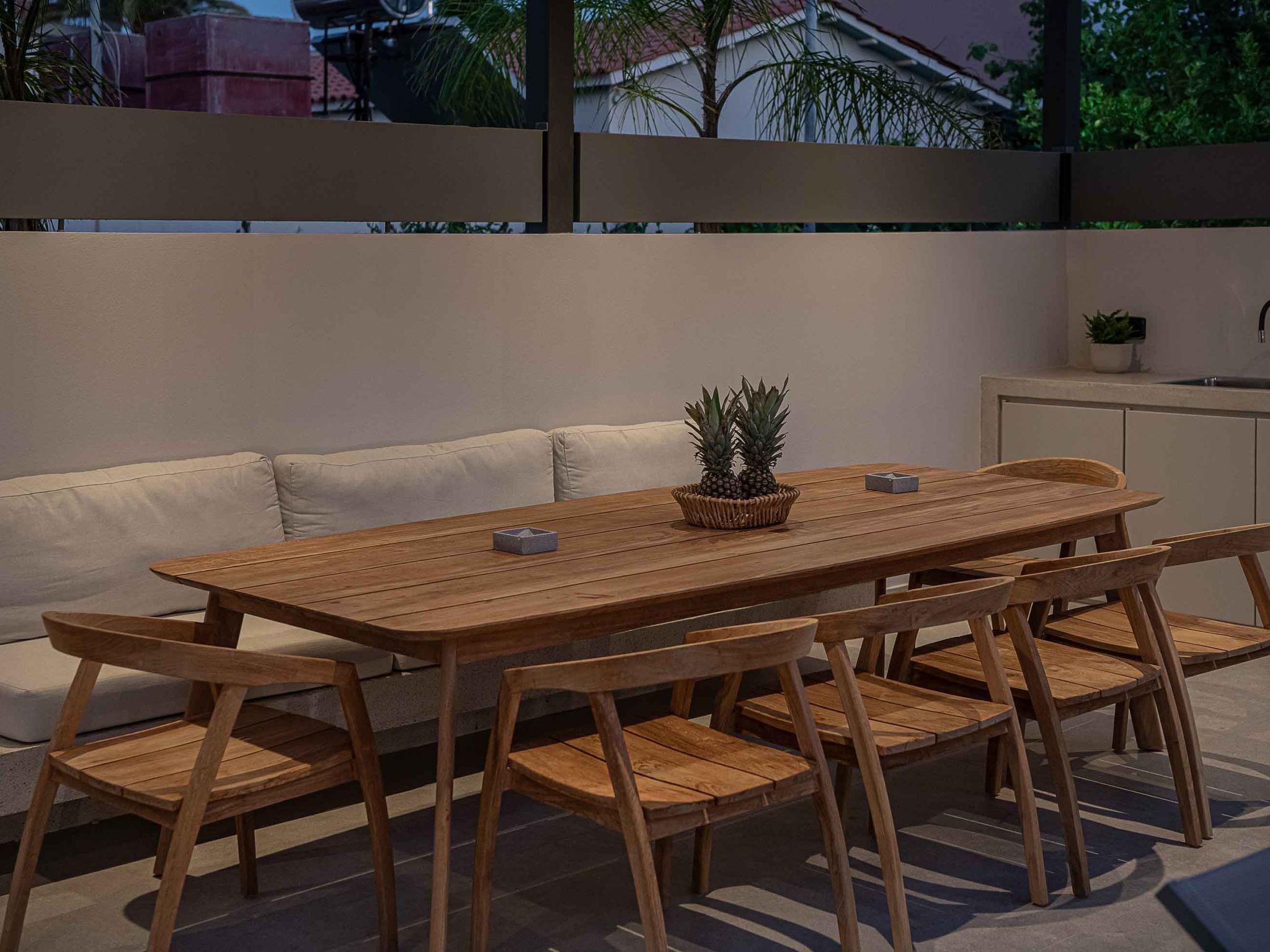 Pergola-protected dining area for 12 guests