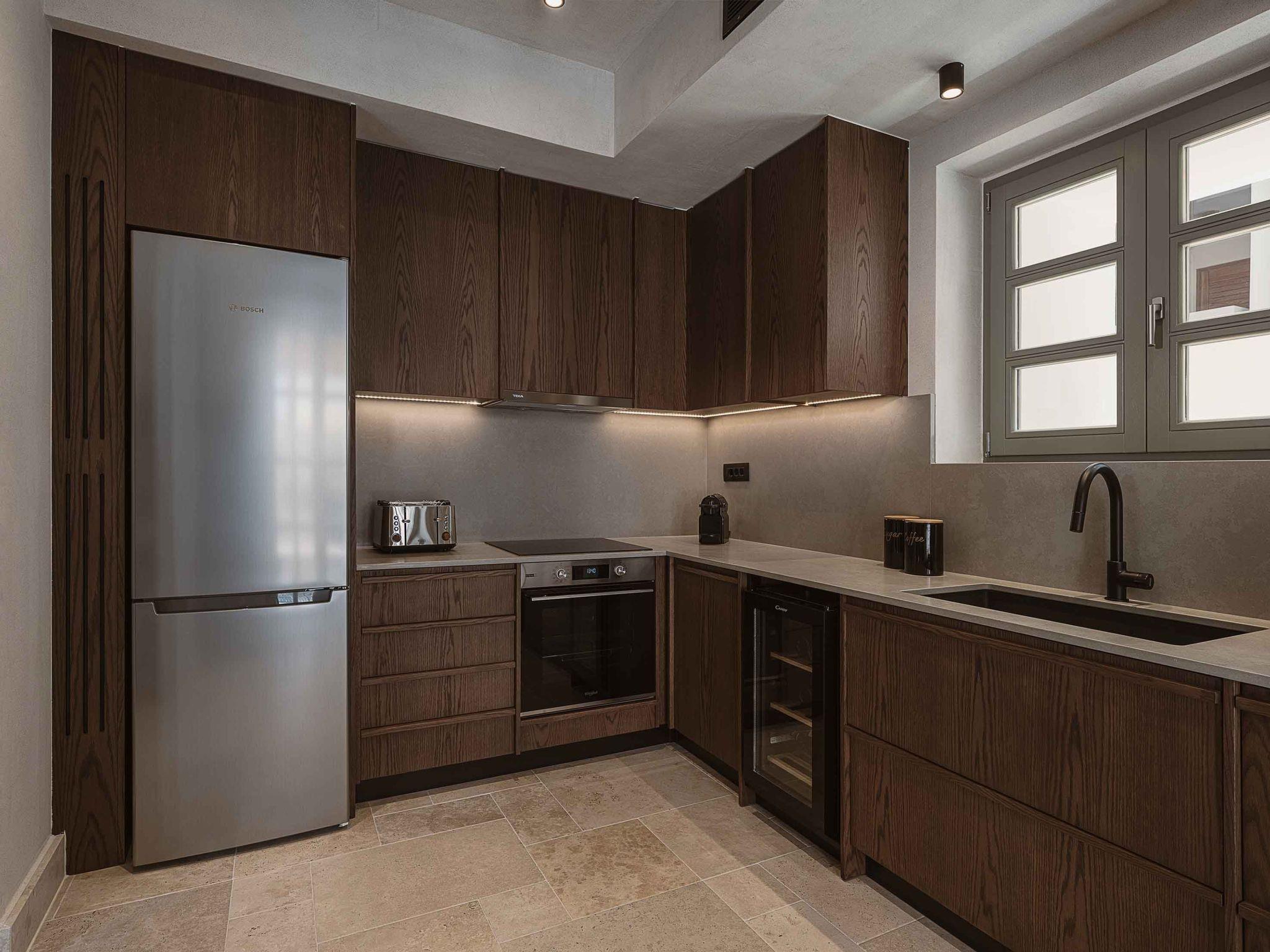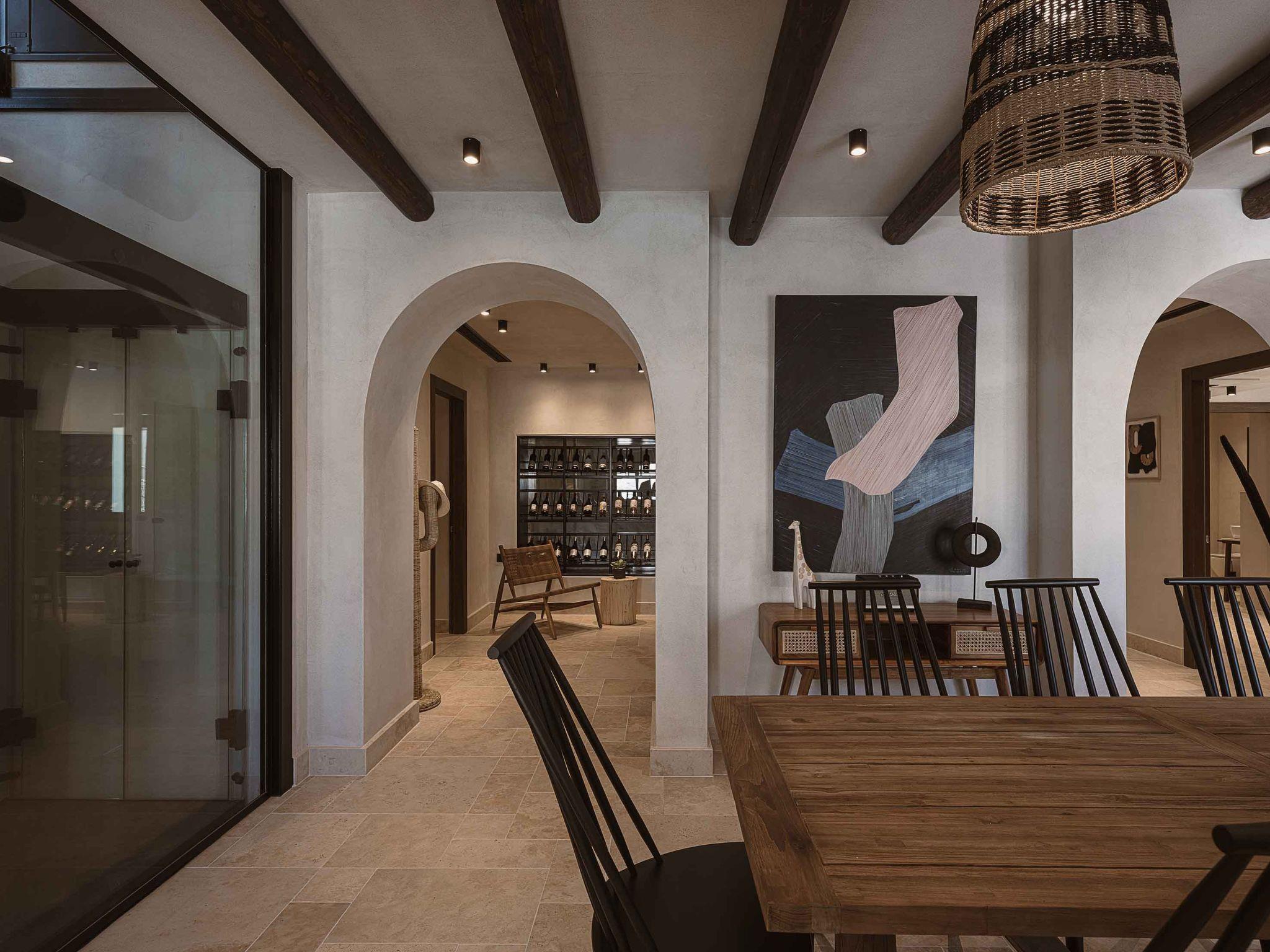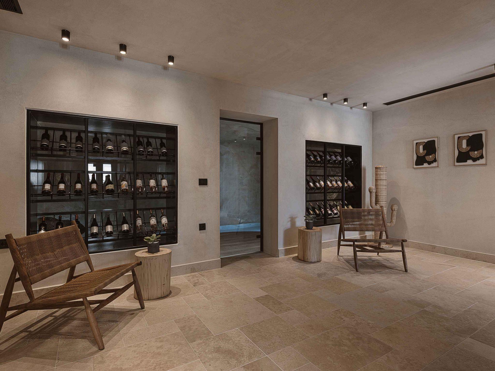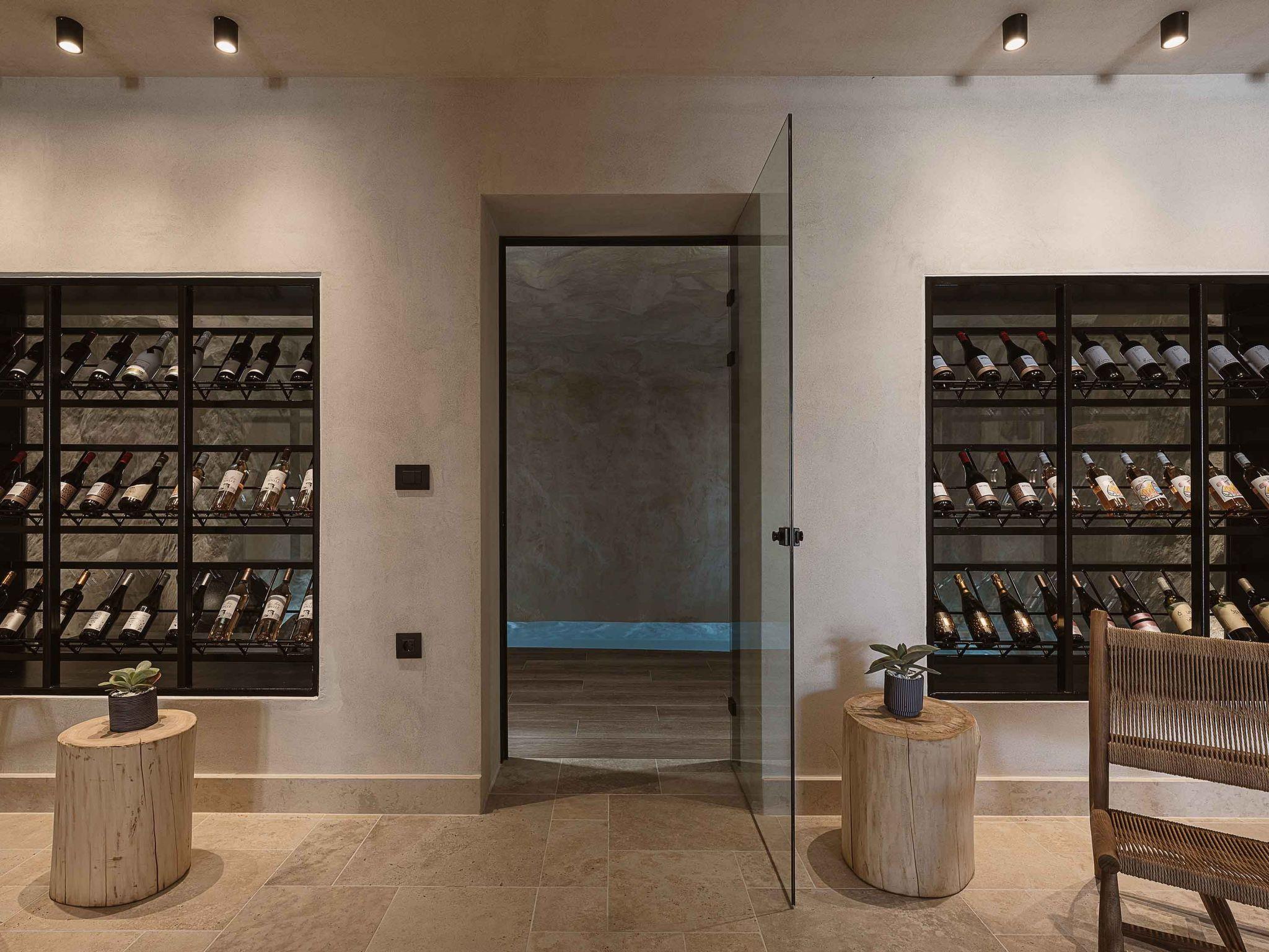 On the lower level is located an indoor pool that offers the ultimate cosiness and next to the pool there is a stylish cellar with elegant details full of bottles of wine for the connoisseurs who like to enjoy their bottles chilled to the perfect temperature. Next, the dining area is located in a second kitchen with all the necessary appliances and amenities where you can prepare your meal and choose a good glass of wine. Unforgettable moments and carefree days! In the kitchen on the lower level, there is a wine cooler. They are USB ports for charging your various electronic devices easily!