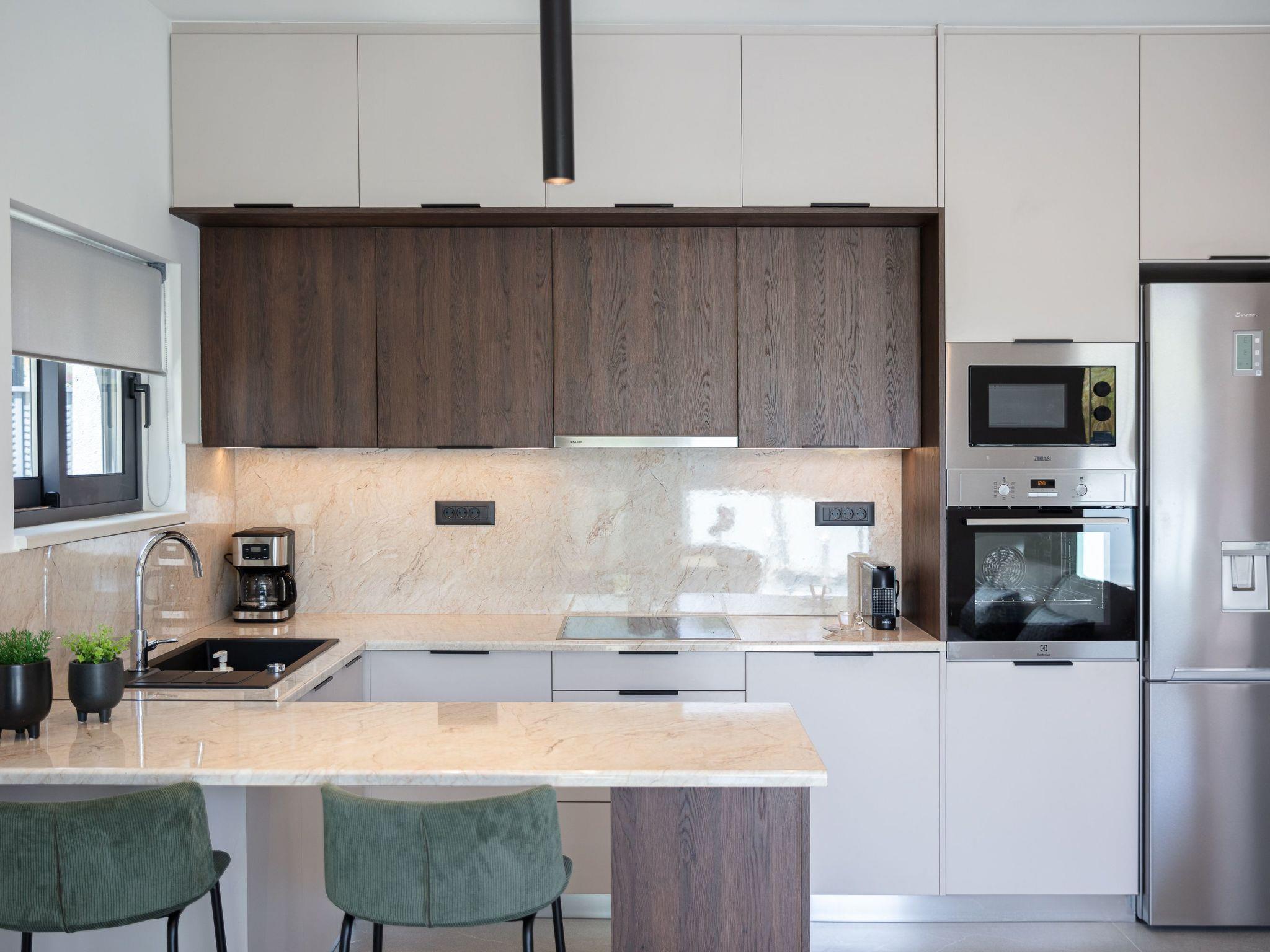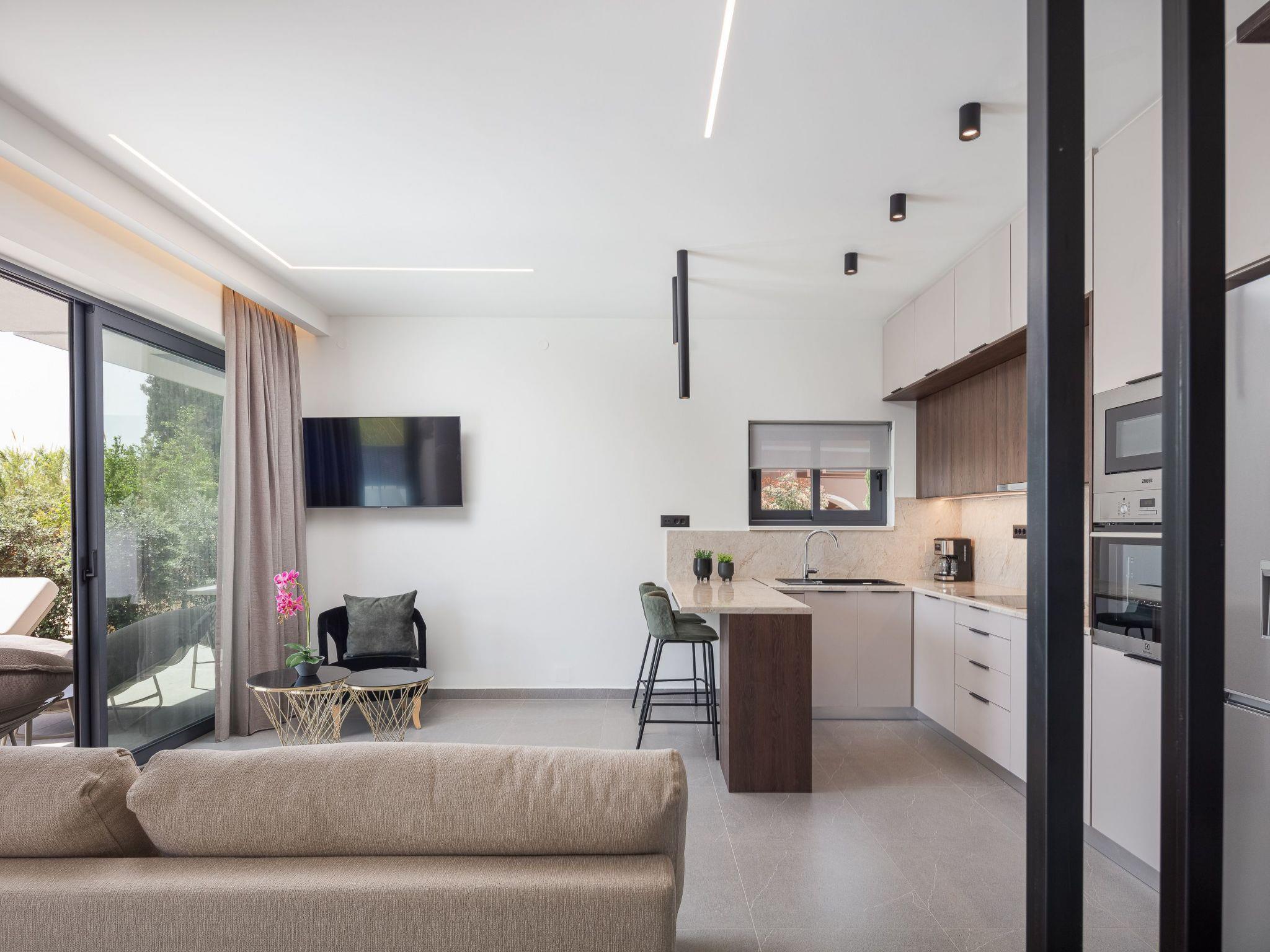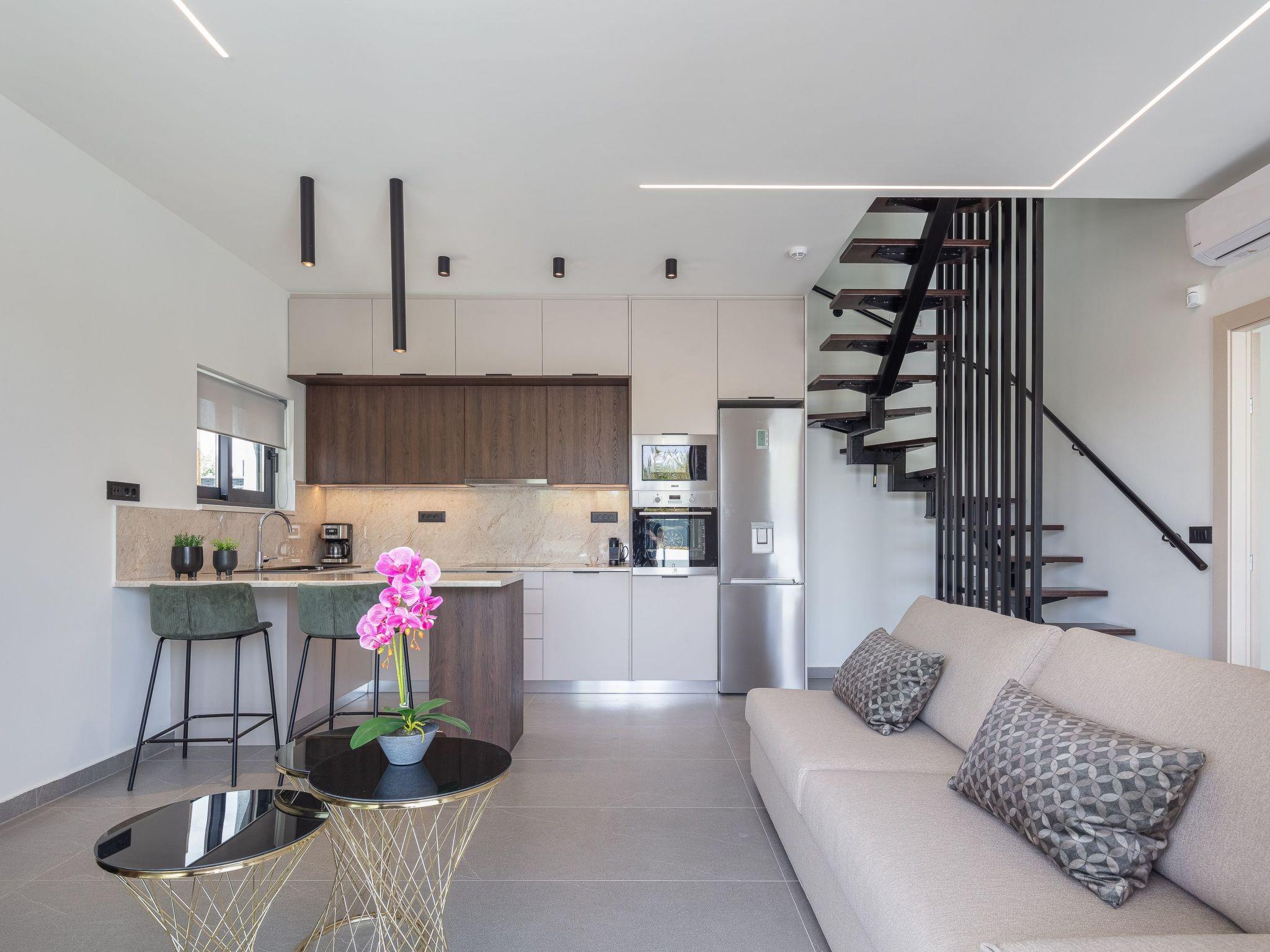 The ground level features a bright open-plan living area with minimalist design and warm neutral tones. The space includes a comfortable sofa, a 50’’ Smart satellite TV, and a Bluetooth speaker, making it ideal for relaxed gatherings. Large glass doors offer seamless access to the pool area, creating a fluid indoor-outdoor living experience. The adjacent fully equipped kitchen includes all modern appliances and a kitchen island with 2 bar stools for casual dining.