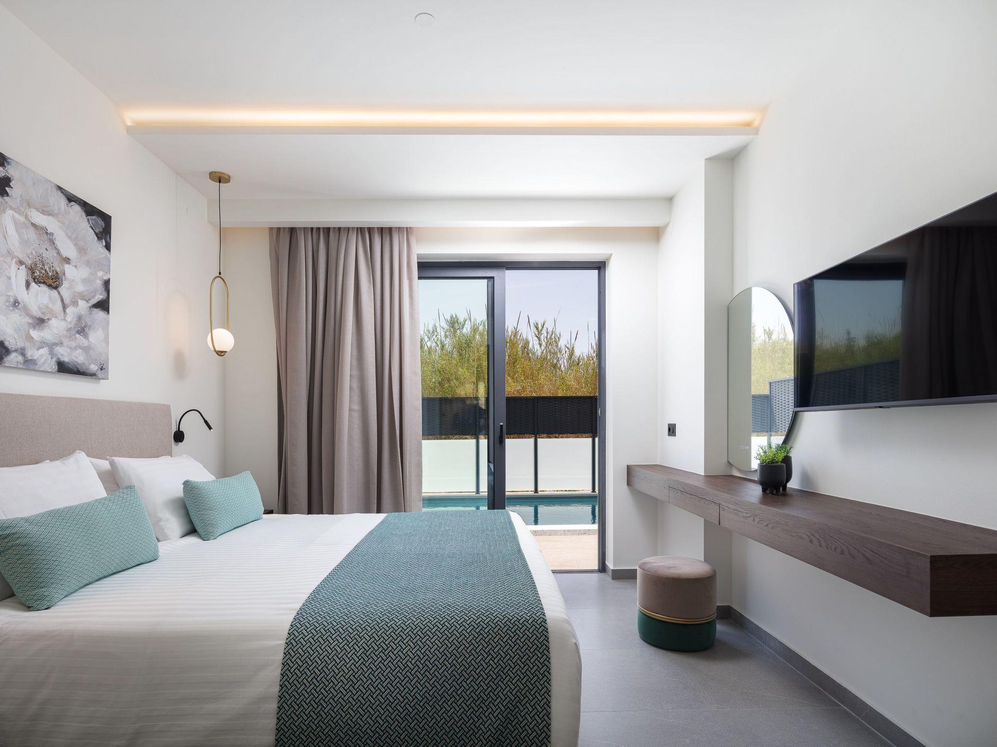 On the same level, Bedroom 1 offers a king-size bed (1.80 x 2.00m) with a high-quality Coco-Mat mattress, air conditioning, a 44’’ Smart TV, an ensuite bathroom with a walk-in shower, and direct access to the pool.