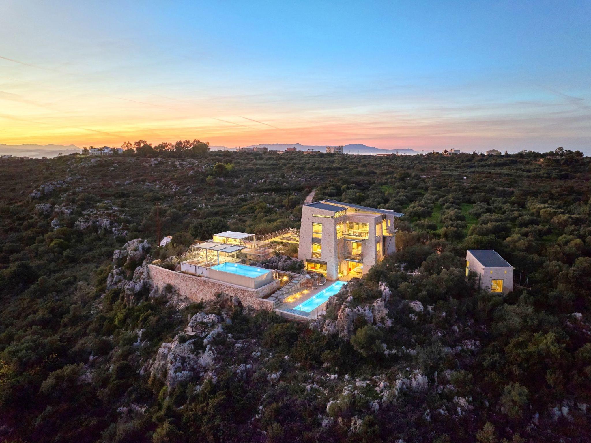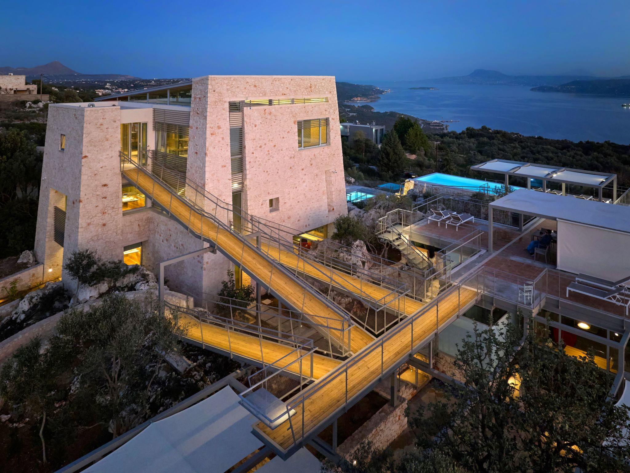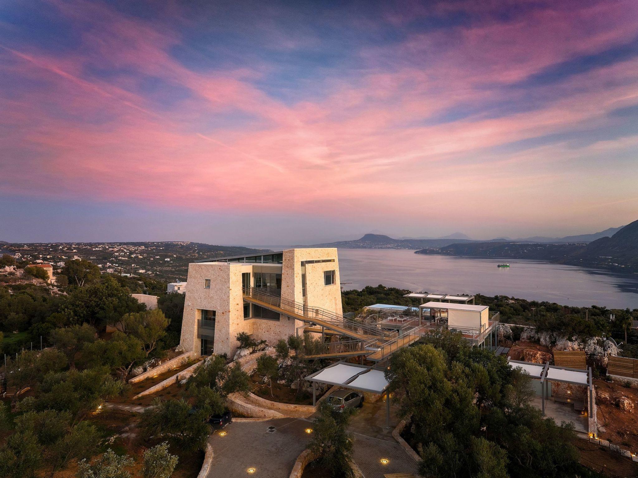 Enjoy the beautifully landscaped outdoor entertainment area with two heated pools, a fully equipped outdoor kitchen, a BBQ, a shaded dining area, and sun loungers, all with sweeping views over Souda Bay.