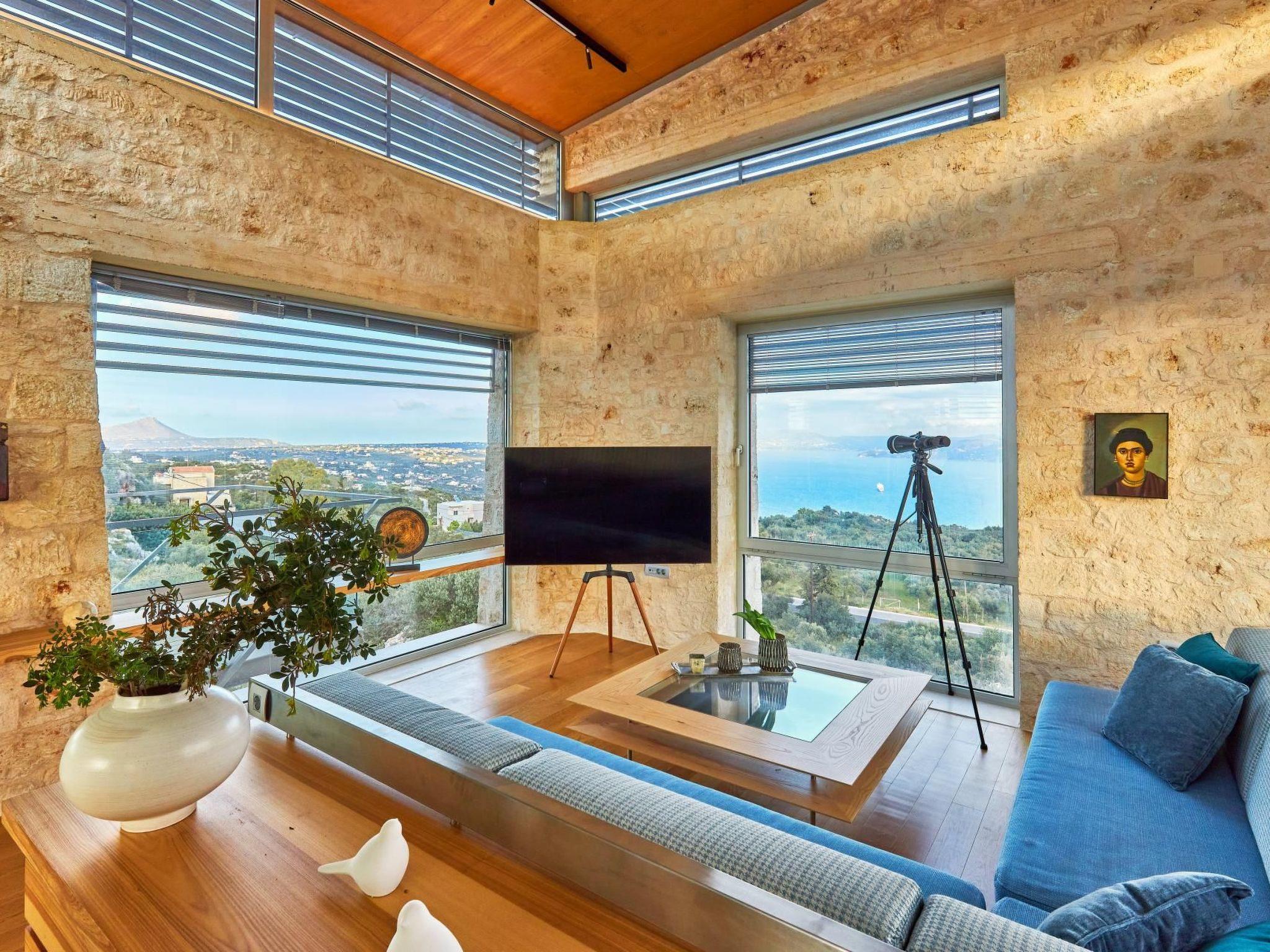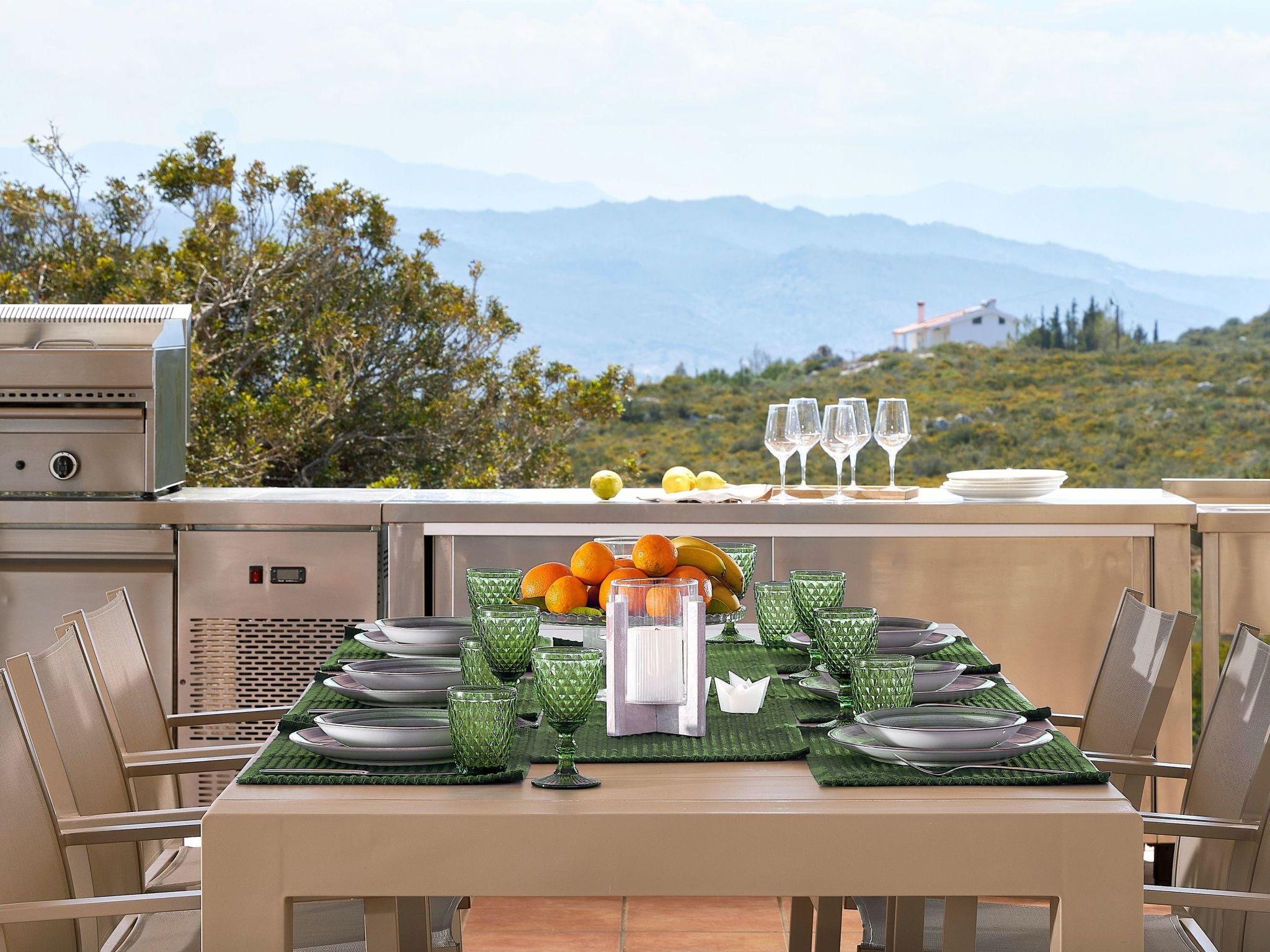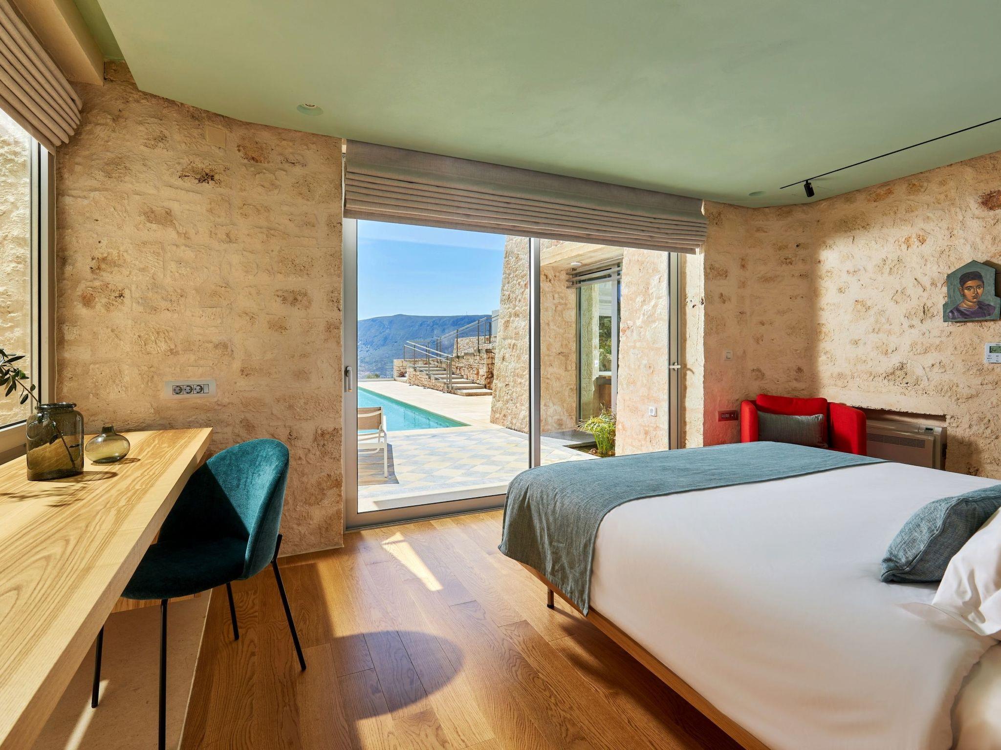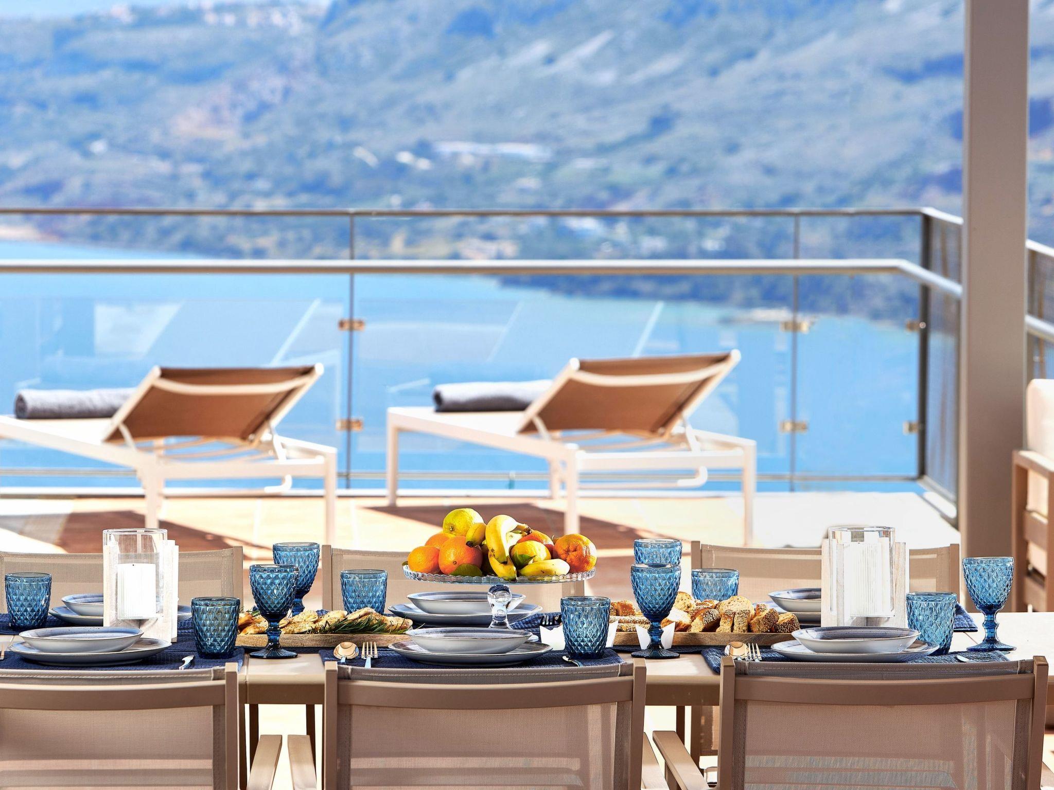 Enjoy the beautifully landscaped outdoor entertainment area with two heated pools, a fully equipped outdoor kitchen, a BBQ, a shaded dining area, and sun loungers, all with sweeping views over Souda Bay.