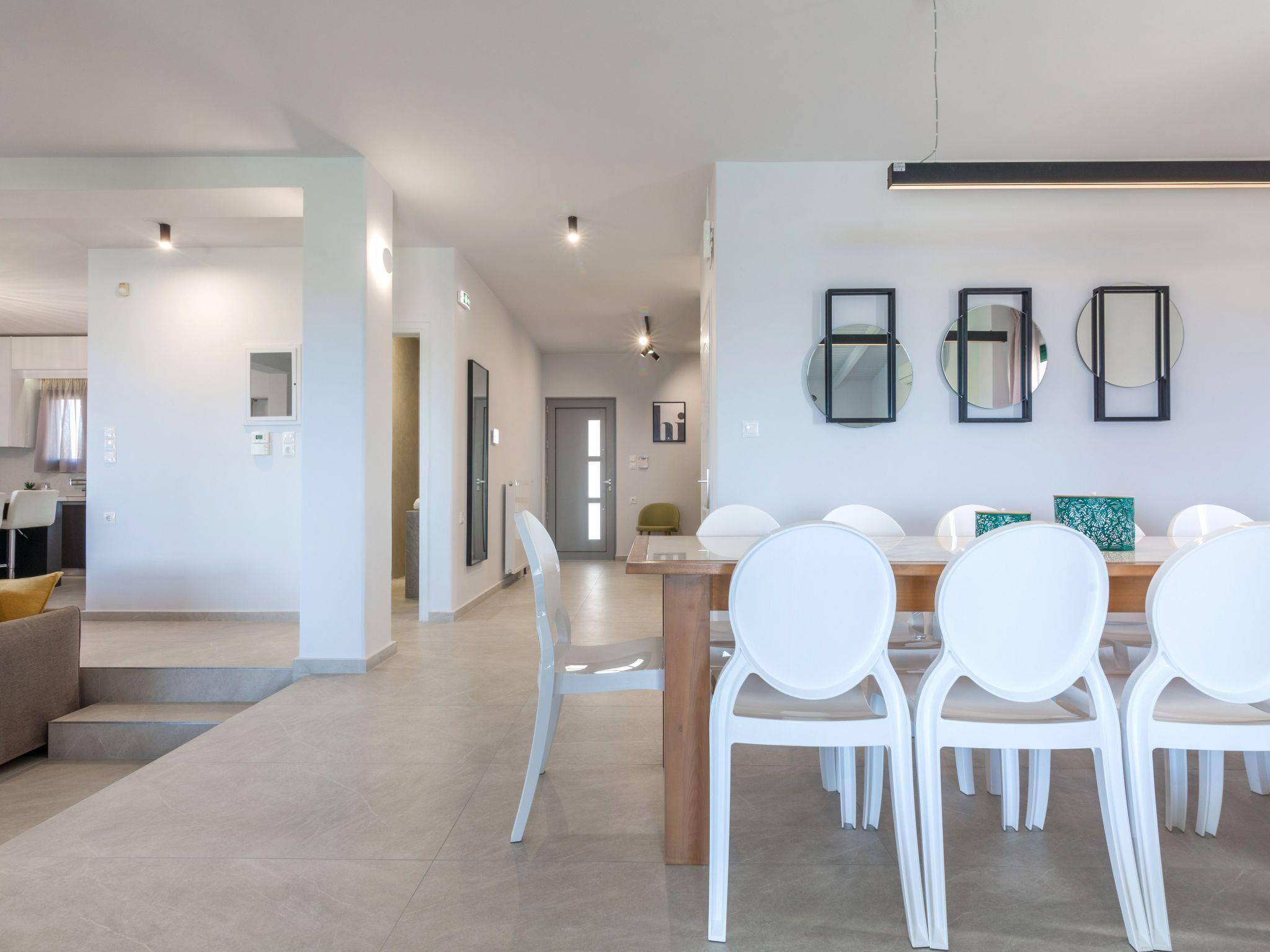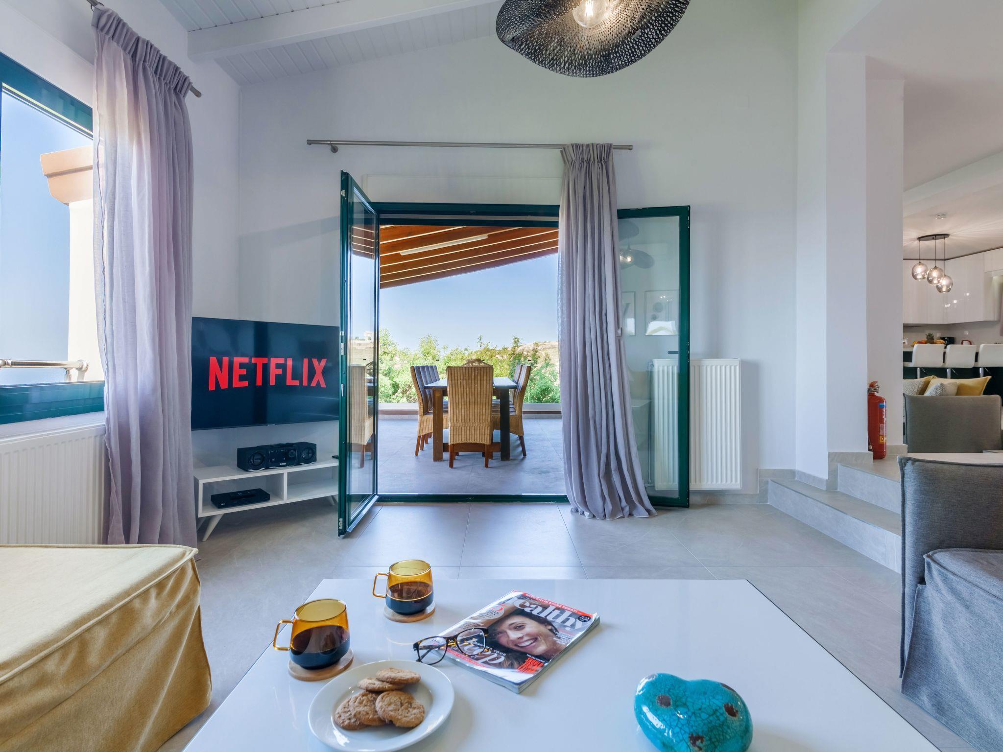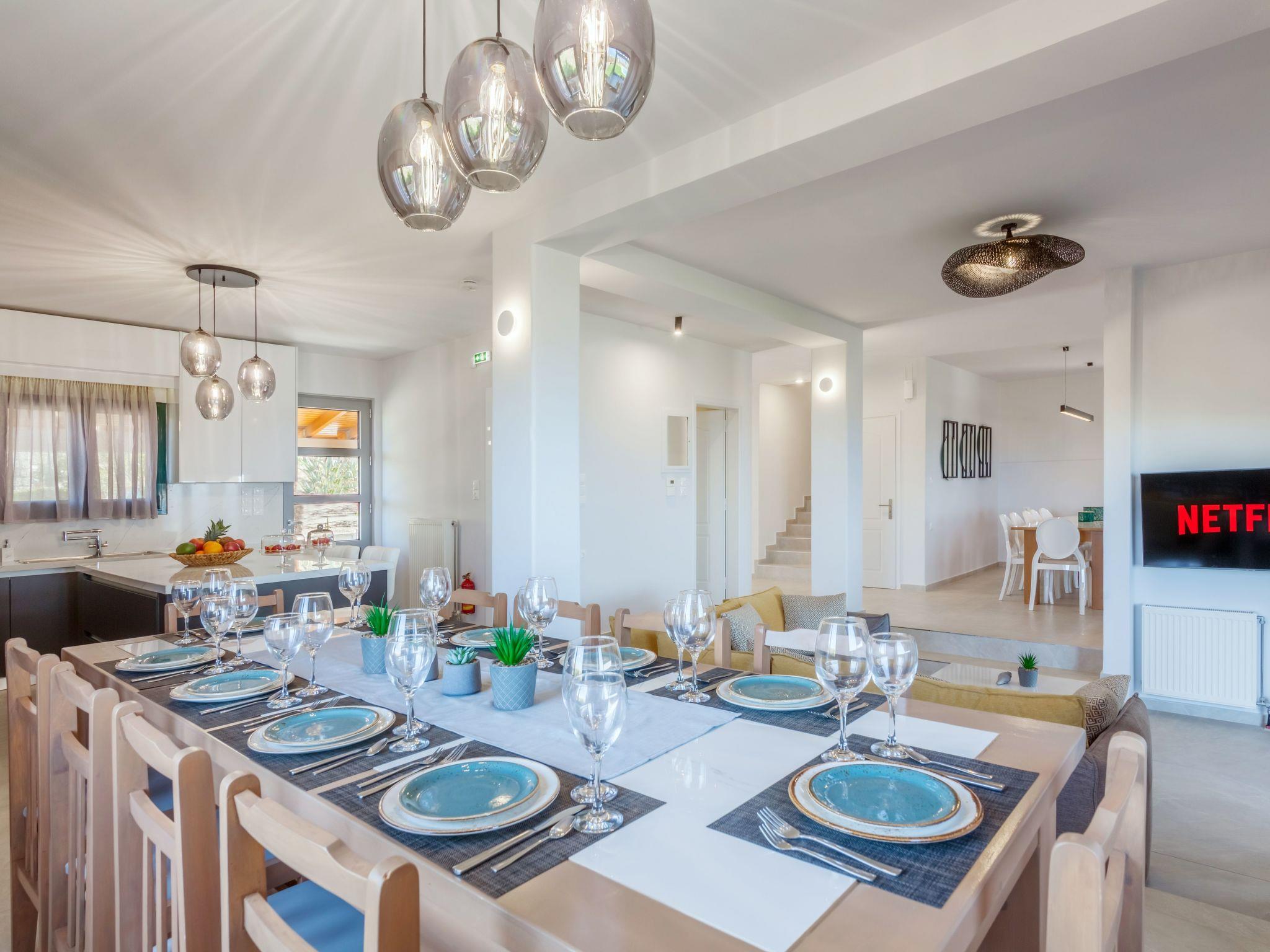 A second living room is located on the same level that provides a smart TV with satellite channels and Netflix App and a corner sofa bed, which can accommodate an extra person. Both living rooms have direct access to a shared balcony with a large dining table for twelve people, with view and access to the pool area as well as, sea view.