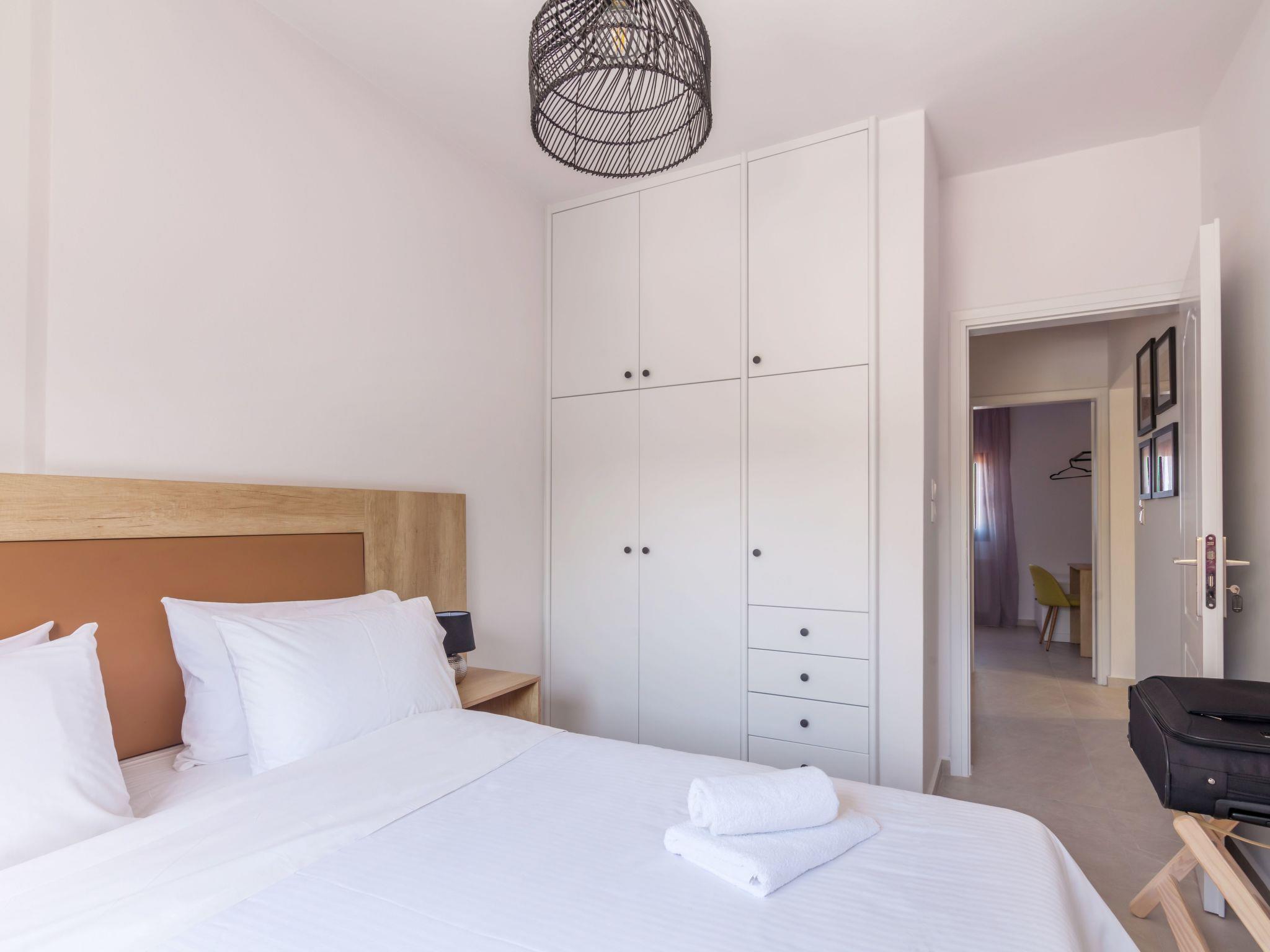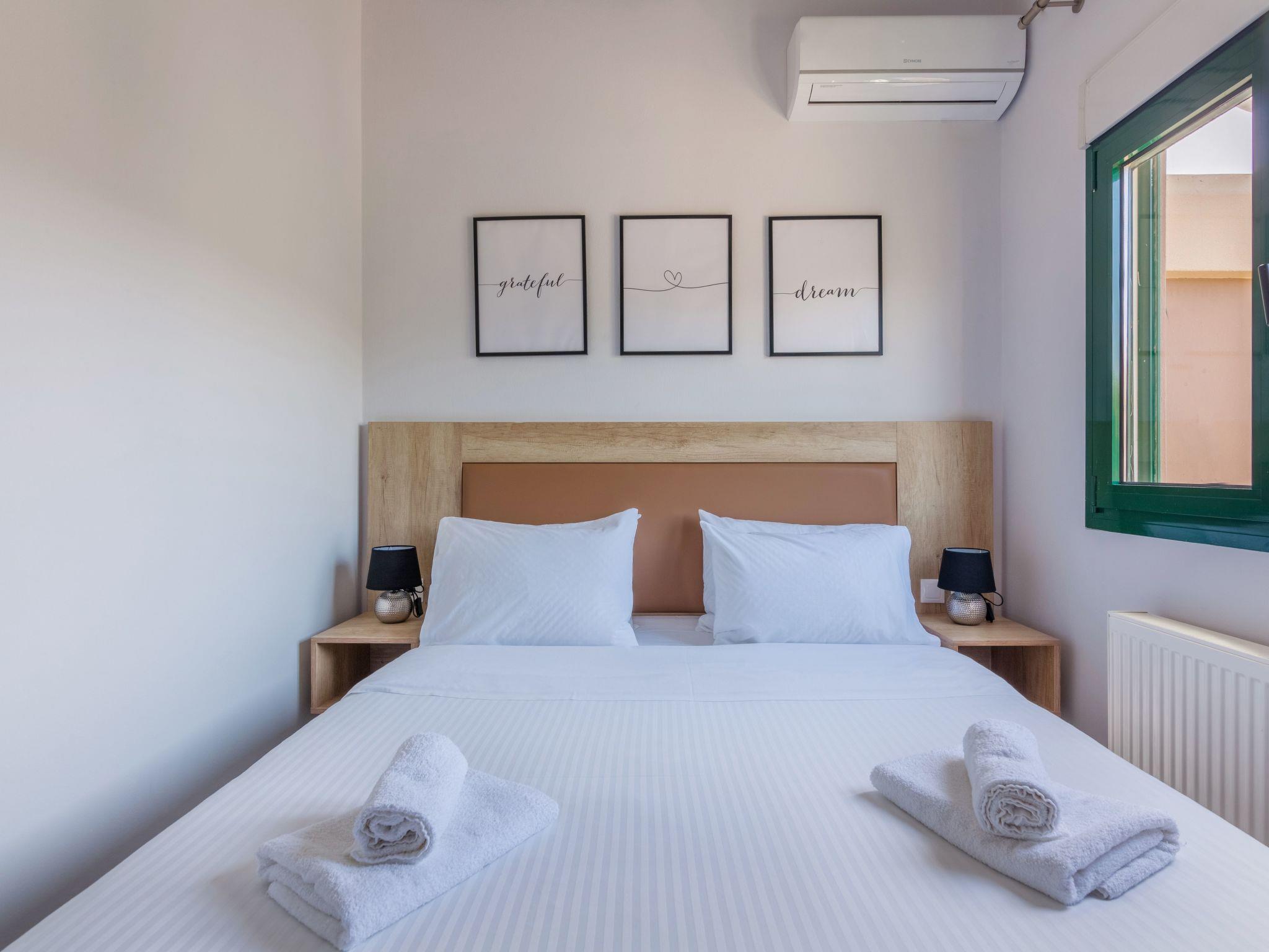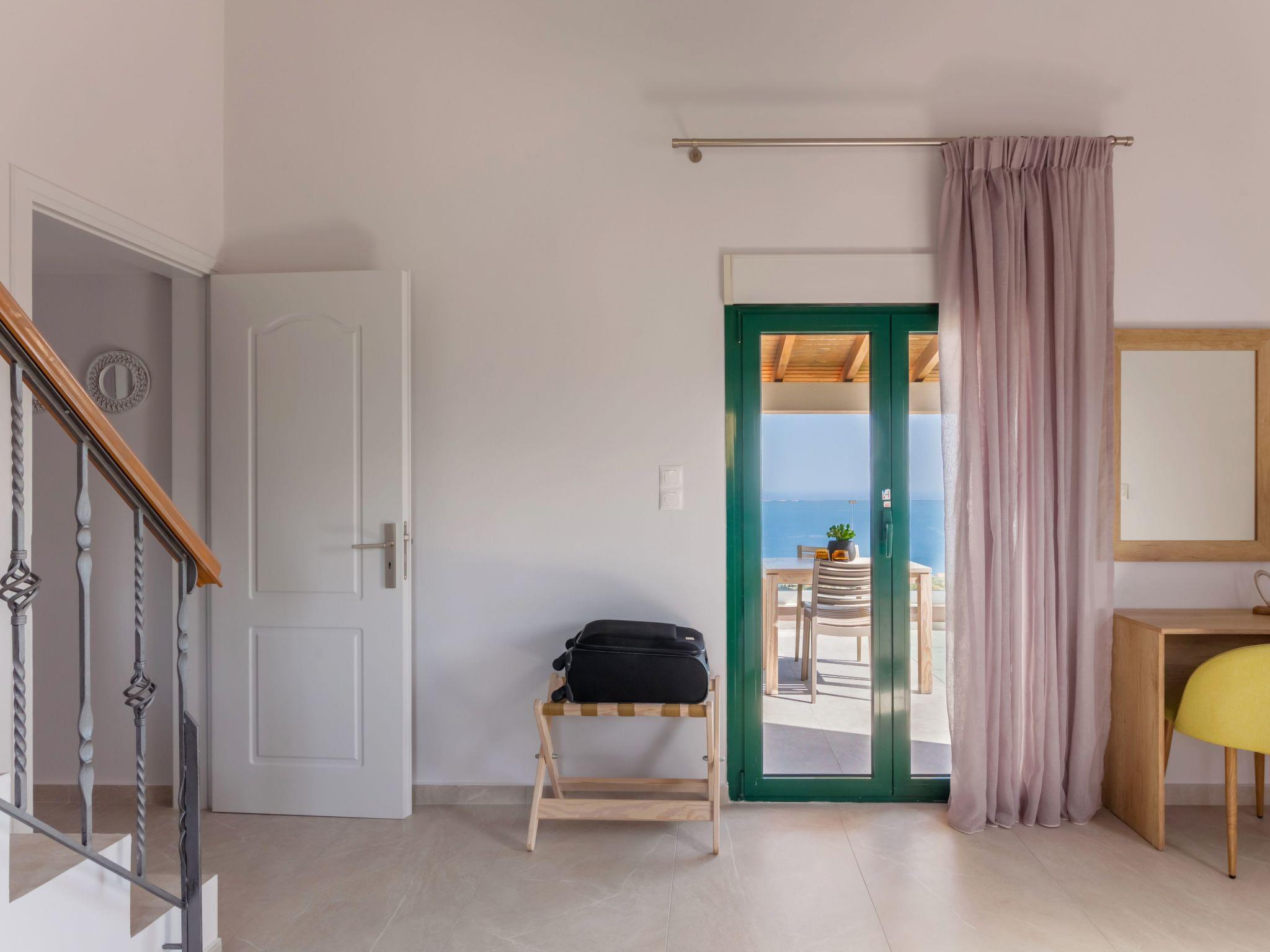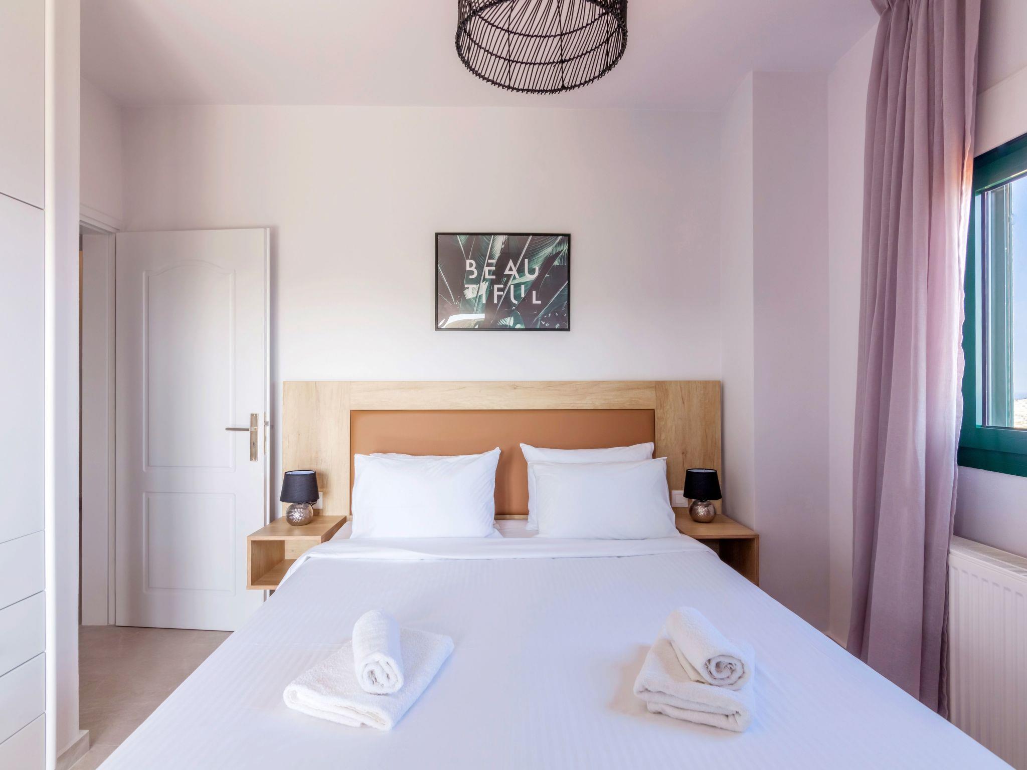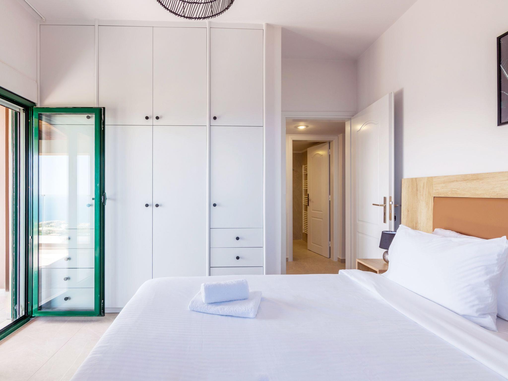 Next to “Vasilis” bedroom, there is “Chysi” bedroom. It also has a Queen bed, air-conditioning, one window with sea view and access to a balcony that is shared with the next bedroom, “Fenia”. “Fenia” bedroom is the largest one, has a Queen bed, two windows, as well as the access to the shared balcony with “Chrysi” bedroom, over-looking to the pool area and the sea.