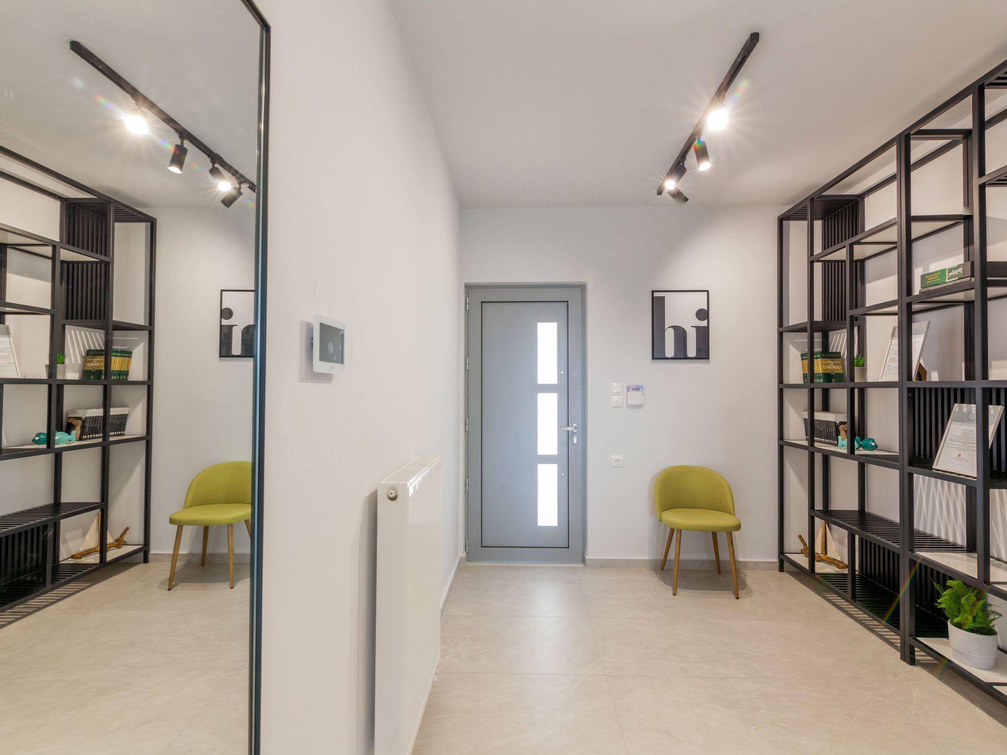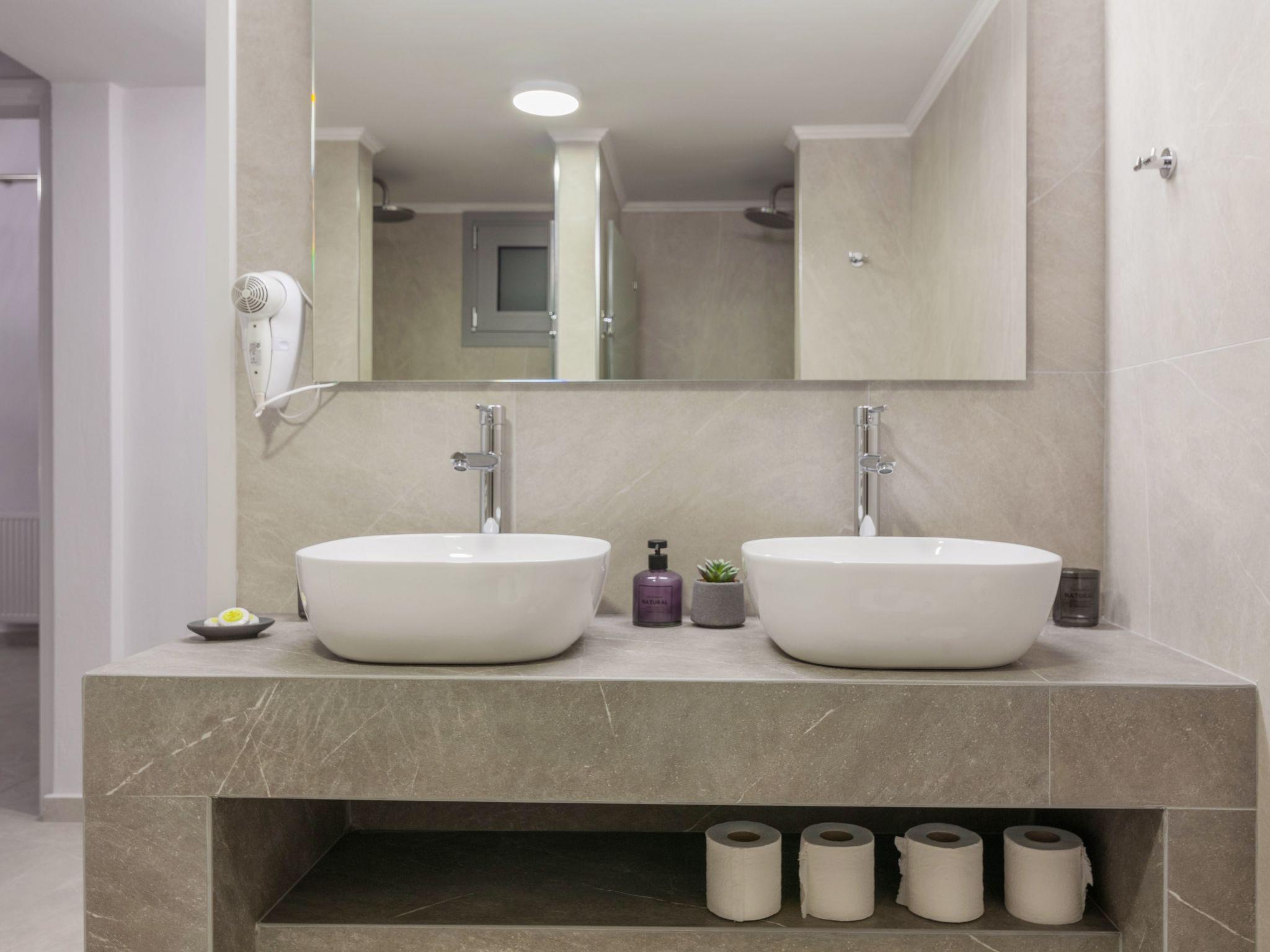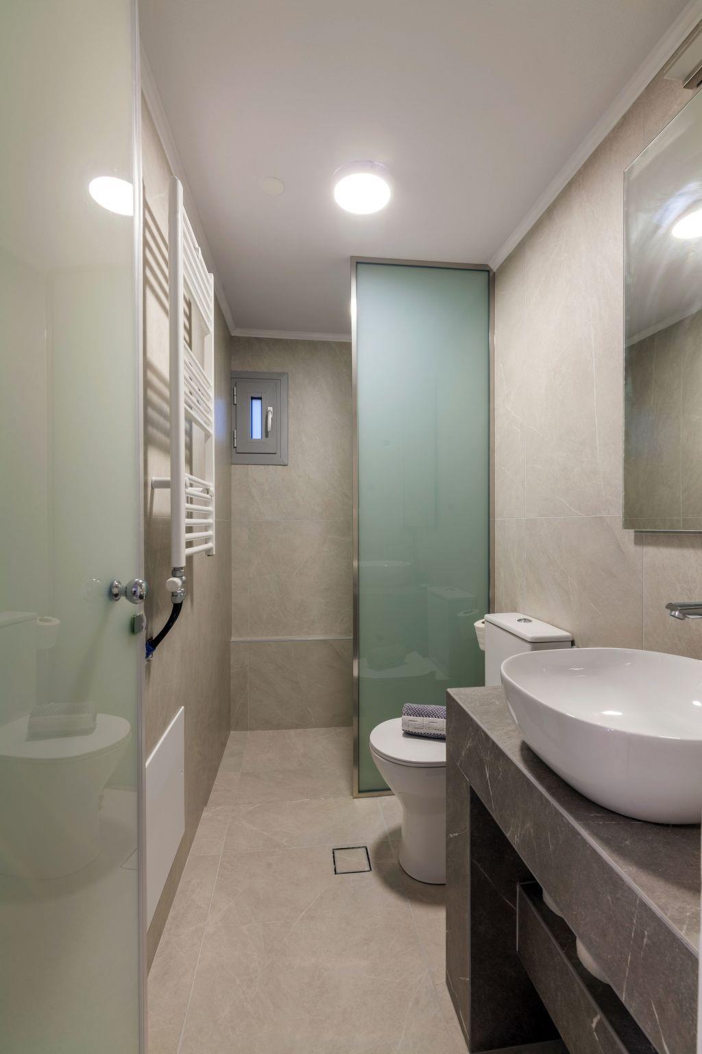 On this level (pool level) there is “Pantelis” bedroom, a separate bathroom for all the guests, a low ceiling storage room and the engine room of the house which is “staff only” accessible for safety reasons. “Pantelis” bedroom has access both from inside the house through some stairs and from a separate private entrance from the back yard, that is wheelchair accessible.