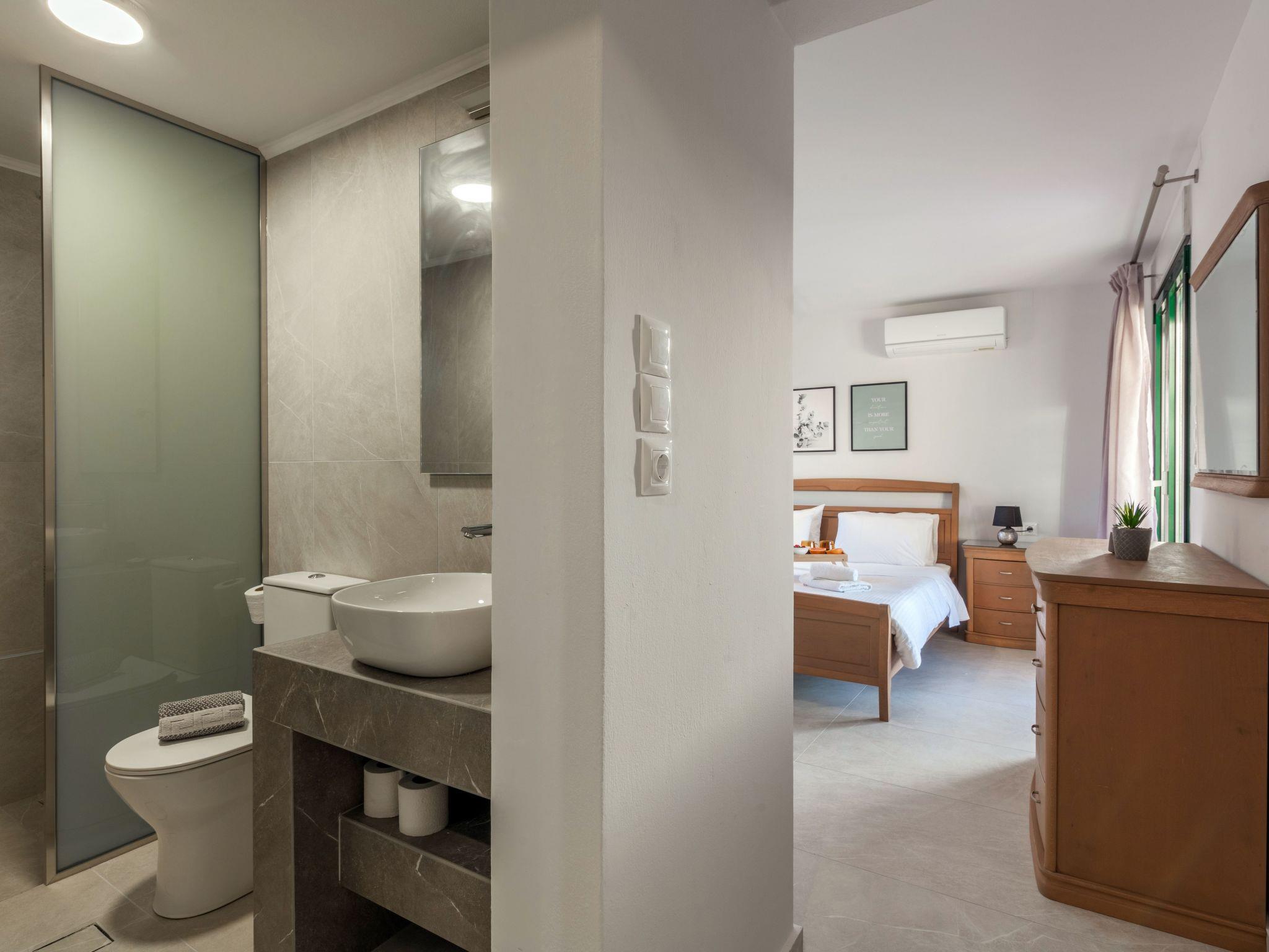 “Pantelis” bedroom has a Queen bed, air-conditioning, one hairdryer and its en-suite has a shower room, a toilet and a hand basin. Moreover this bedroom has a large veranda door that leads you to the sitting area in front of the garden and the pool. This en-suite bedroom is ideal for couples.