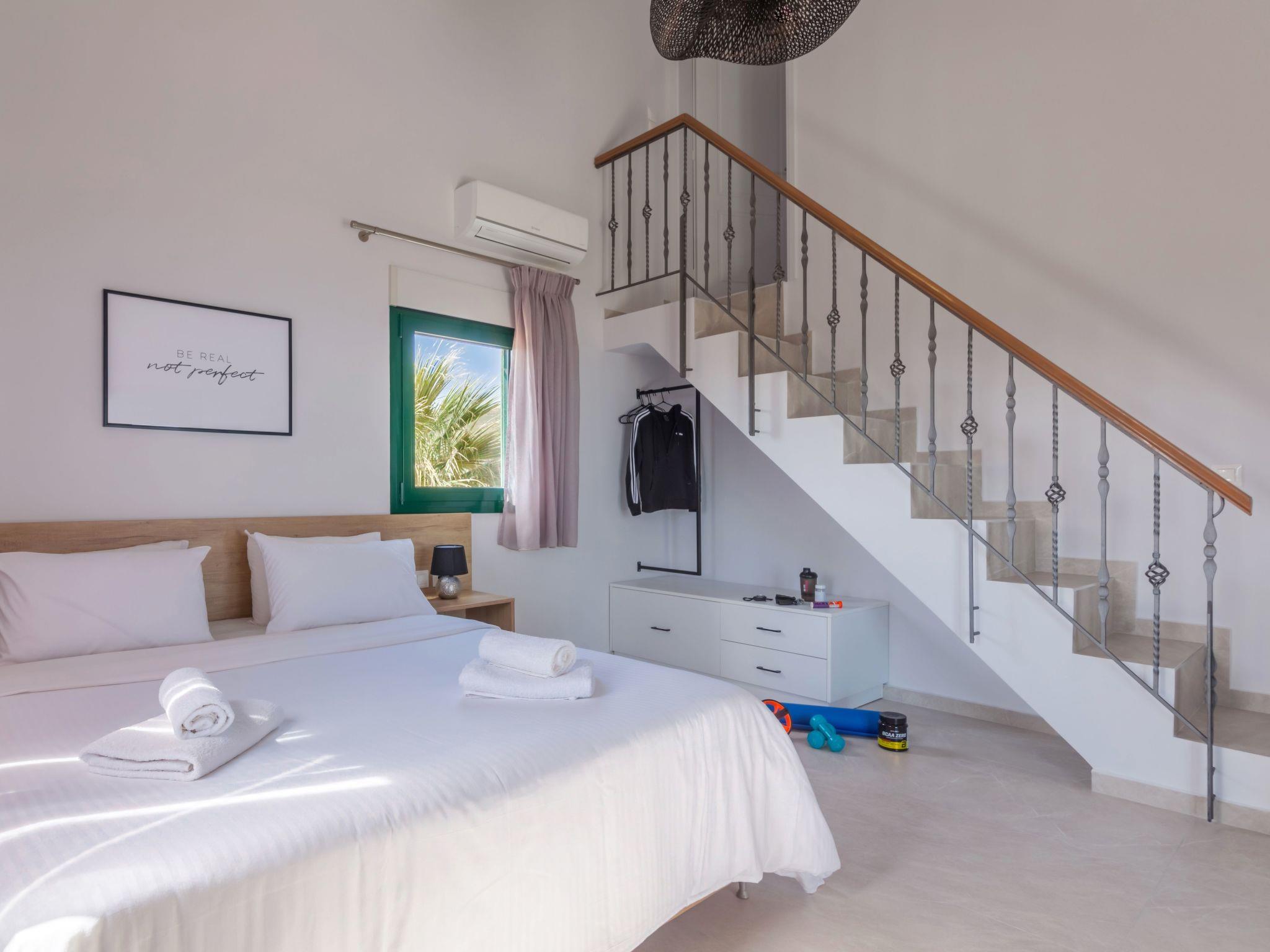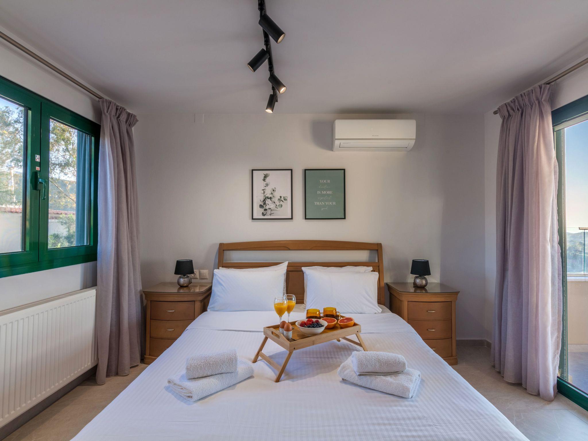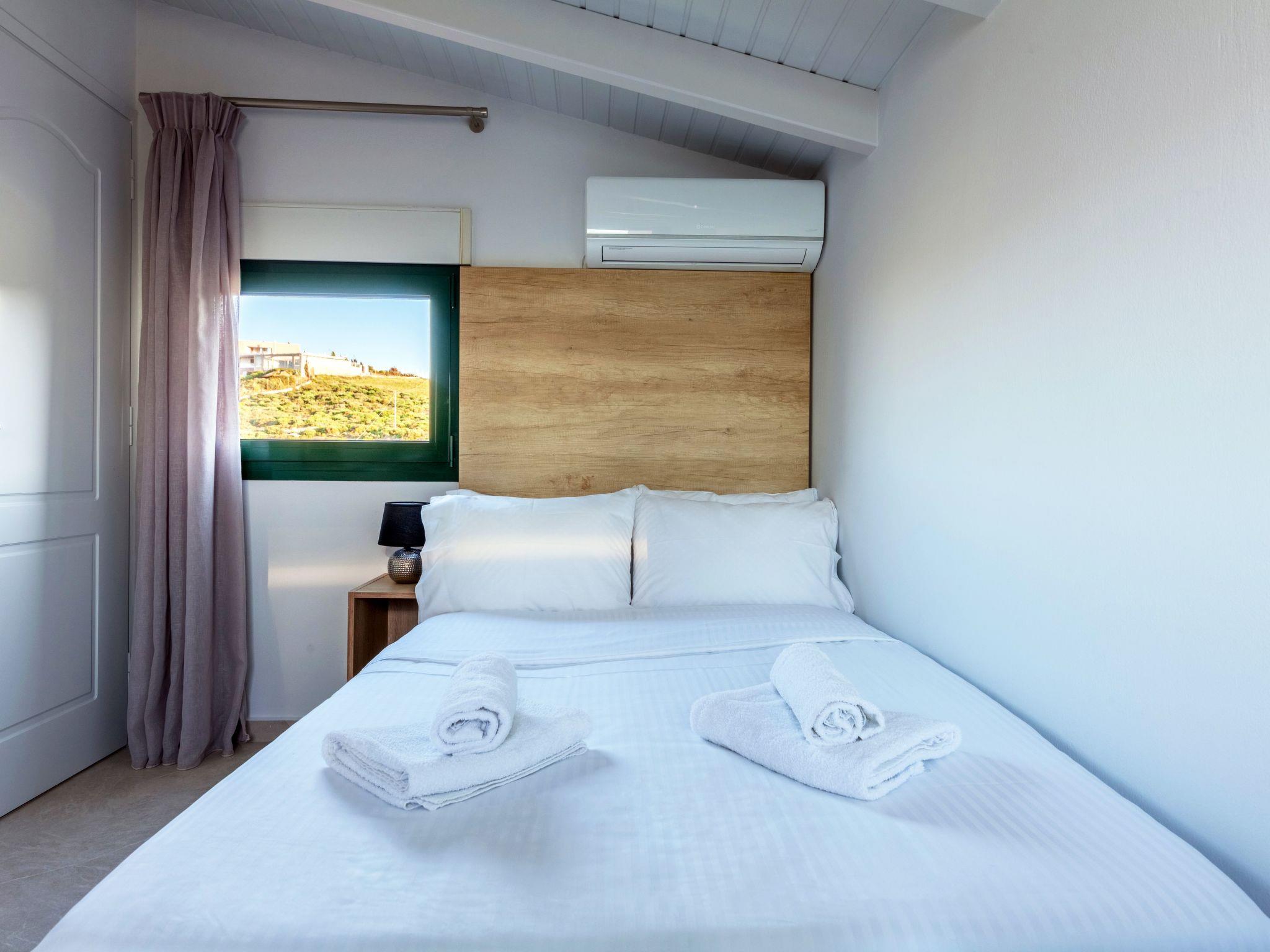 On the second level there are in total seven bedrooms. Bedroom “Vasilis” is the first that you see on your left as you enter this level. It has a Queen bed, air-conditioning and two cute windows over-looking to the beautiful bay of Ligaria and Agia Pelagia.