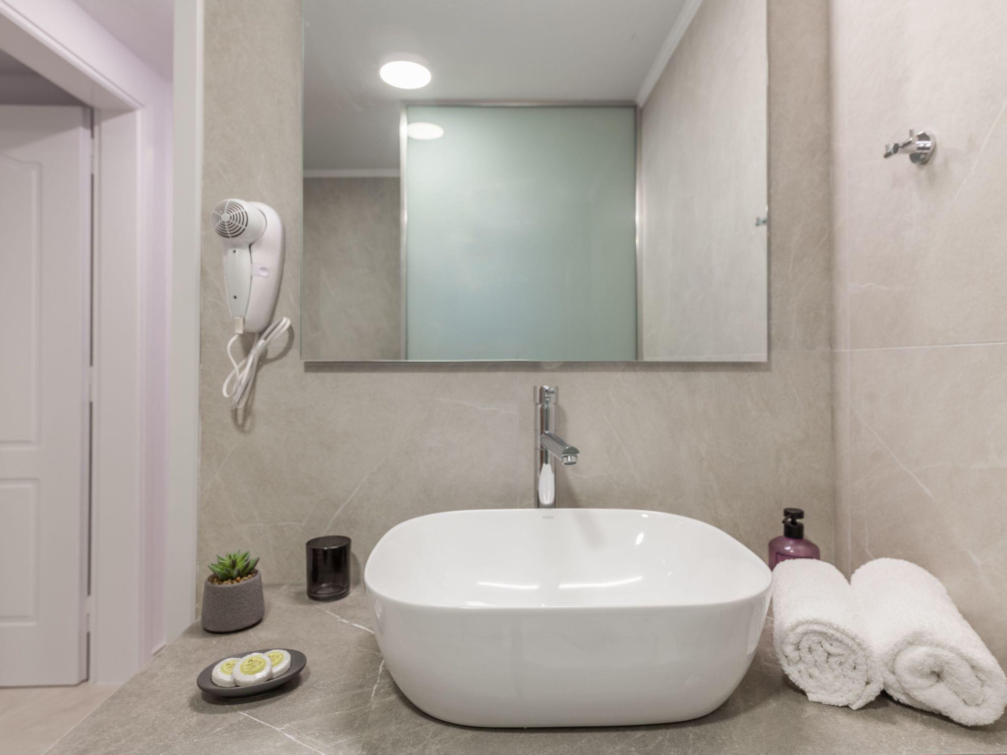 Finally, there is a bathroom with two separate shower rooms with rain showers, double hand basin and one hair dryer. The whole level provides high-speed Wi-Fi, air-conditioning, first aid kit, fire extinguisher, and smoke detector. A bluetooth wireless speaker is also provided.