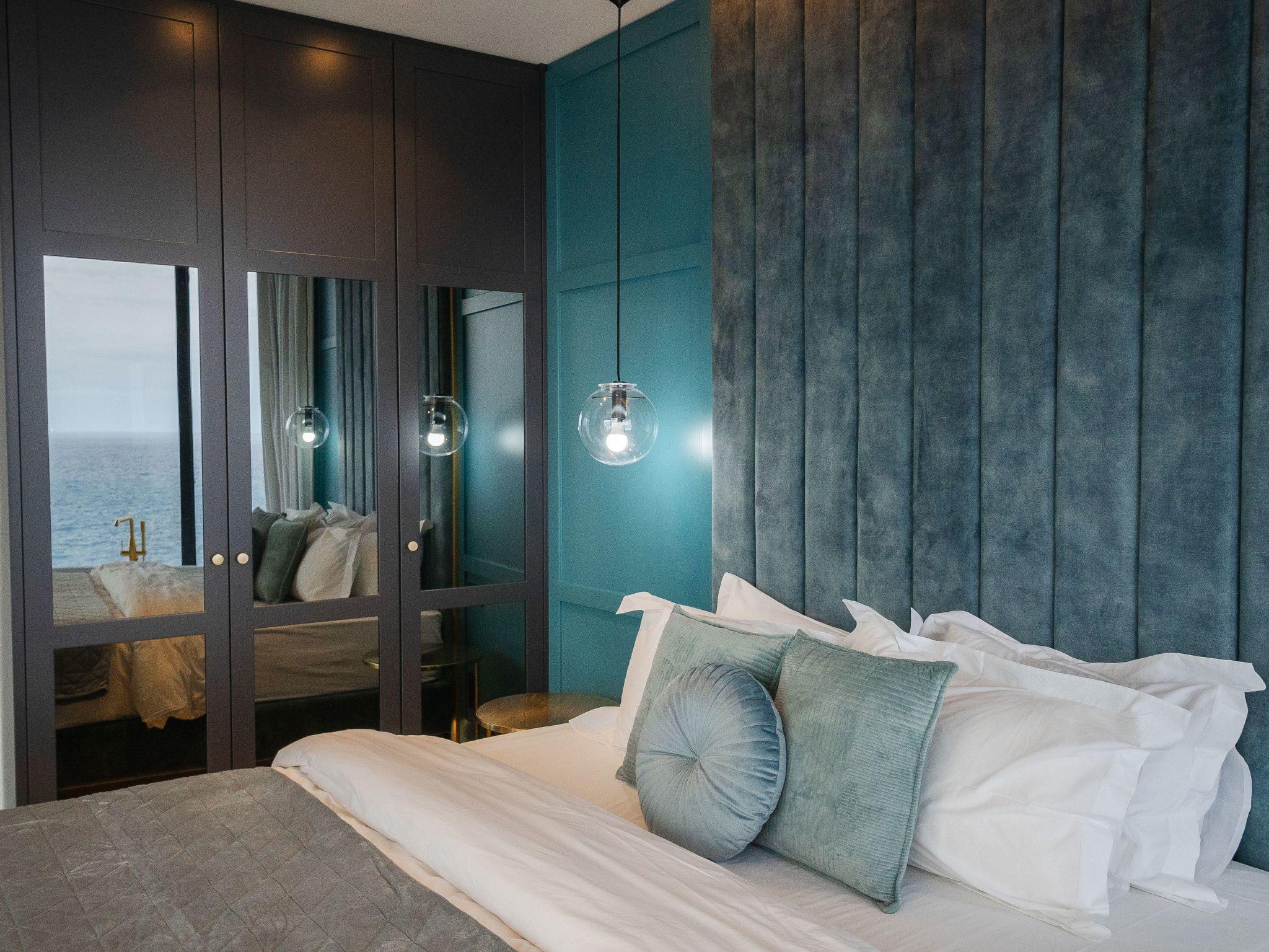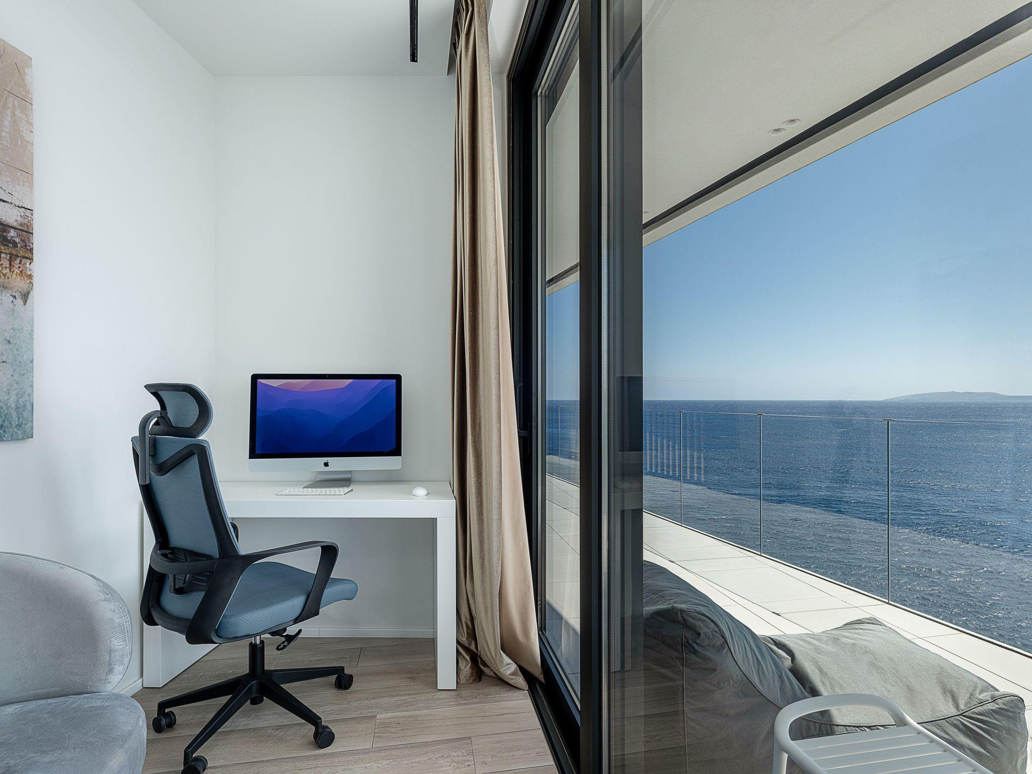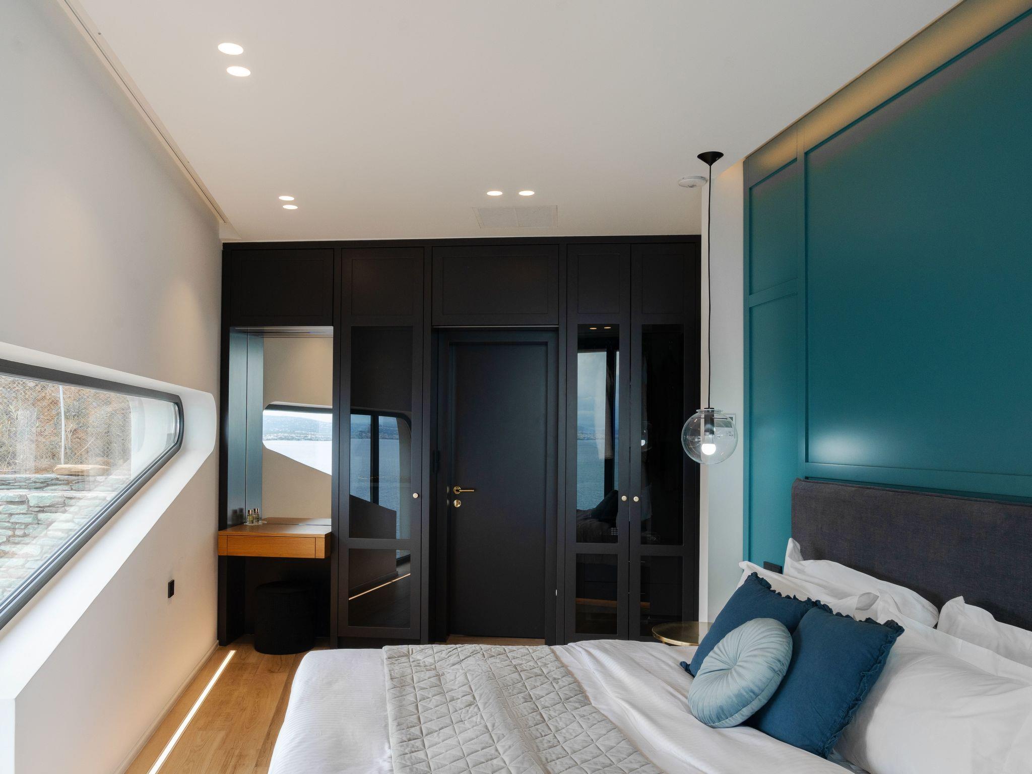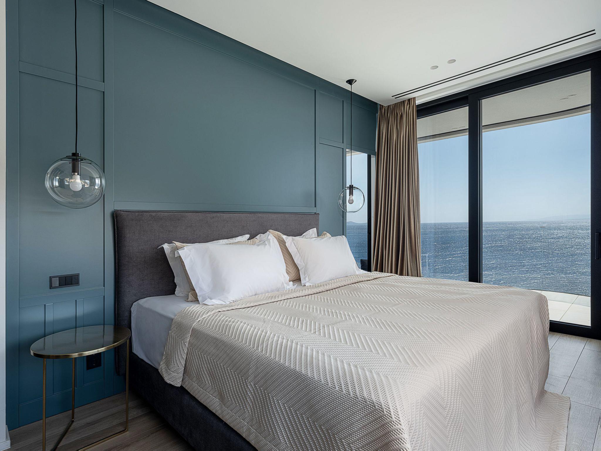 Within the interior, this lavish abode is thoughtfully furnished to ensure the utmost comfort and convenience. A generous living room anchors the ground floor, featuring a cozy fireplace, plush sofa, and a TV, all complemented by a large dining table. The kitchen is fully equipped to cater to all culinary needs. The villa hosts six well-appointed bedrooms, each designed to provide an oasis of tranquility. Two master bedrooms offer king-size beds, private bathrooms with luxurious bathtubs, and spectacular sea views from expansive balconies. Additional bedrooms are meticulously arranged, including one with a unique underground setup boasting a private kitchen.
