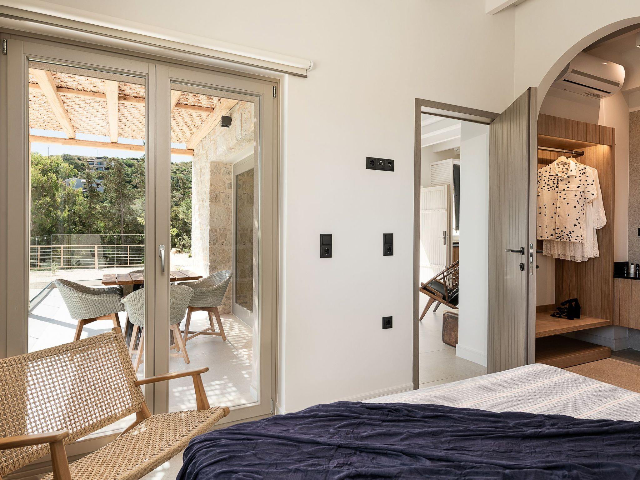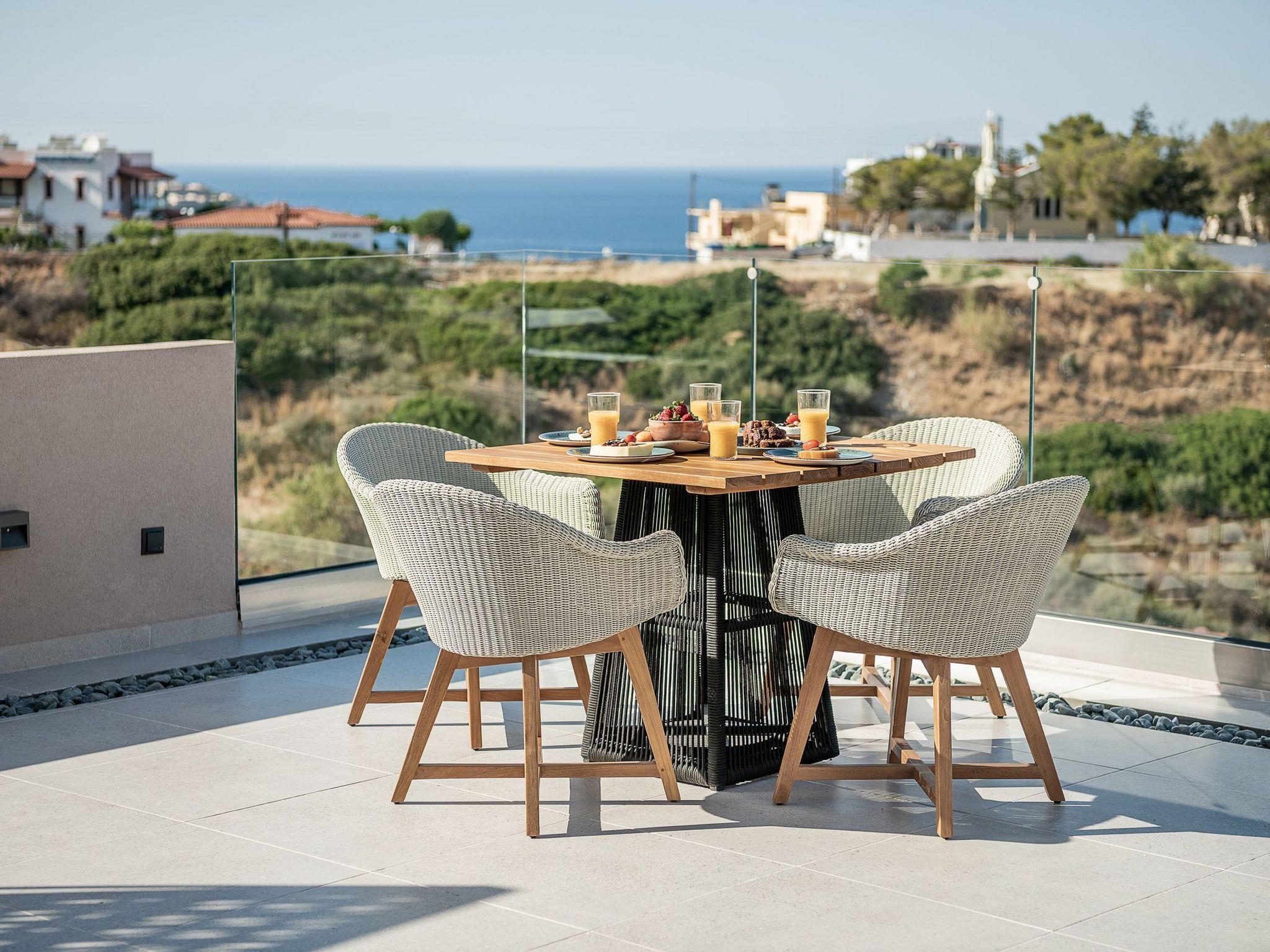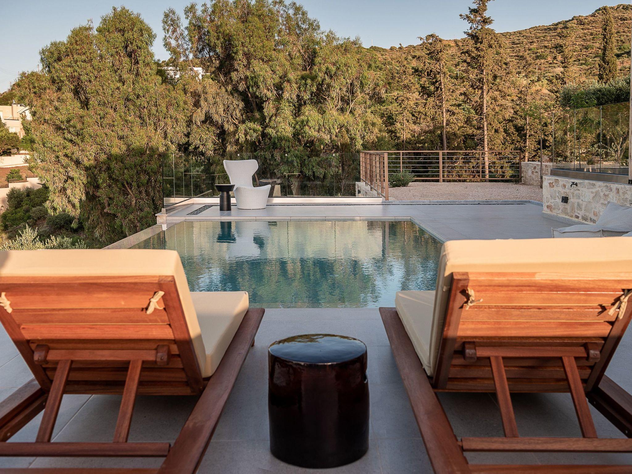 Kokomo Villas are located on a hill overlooking the bay of Lygaria in the greater area of Agia Pelagia. It can be reached from Heraklion/Heraklion Airport in about 25 minutes. It is easily accessible from the Highway and ideal as a base for exploring places of interest. Although close to various magnificent beaches, restaurants and supermarkets, it is also perfect for relaxing in privacy.The villa is characterized by high aesthetics and stunning panoramic views of the Cretan Sea. The earthy tones of the spaces merge into the deep blue of the sea and sky, offering an unforgettable sense of harmony and gentleness. Every aspect, material and element has been carefully selected to wrap you in a state of calmness and satisfaction. All you need to do is enjoy.Villa Gaia hosts 2 bedrooms, both with king size beds and ensuite bathrooms with showers. The front bedroom offers panoramic sea view and direct access to the front veranda. The back bedroom offers direct access to the beautiful backyard. The living-room with a gorgeous view of the sea is connected to a fully equipped open kitchen and dining room and opens out to the veranda. The front outdoor area is exceptionally spacious and the view is a delight to the eyes. It offers a private swimming pool with sunbeds, an outdoor shower, lounge poufs, barbeque (gas) and dining area.Furthermore, Kokomo Villas has solar panels installed to provide some of the energy needed in the property through them. IMPORTANT NOTICE: This property is not suitable for children from 2 to 7 years old, since there is an infinity pool and some not covered areas