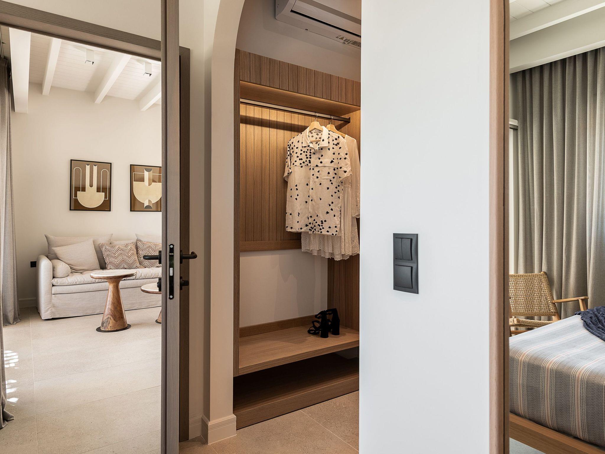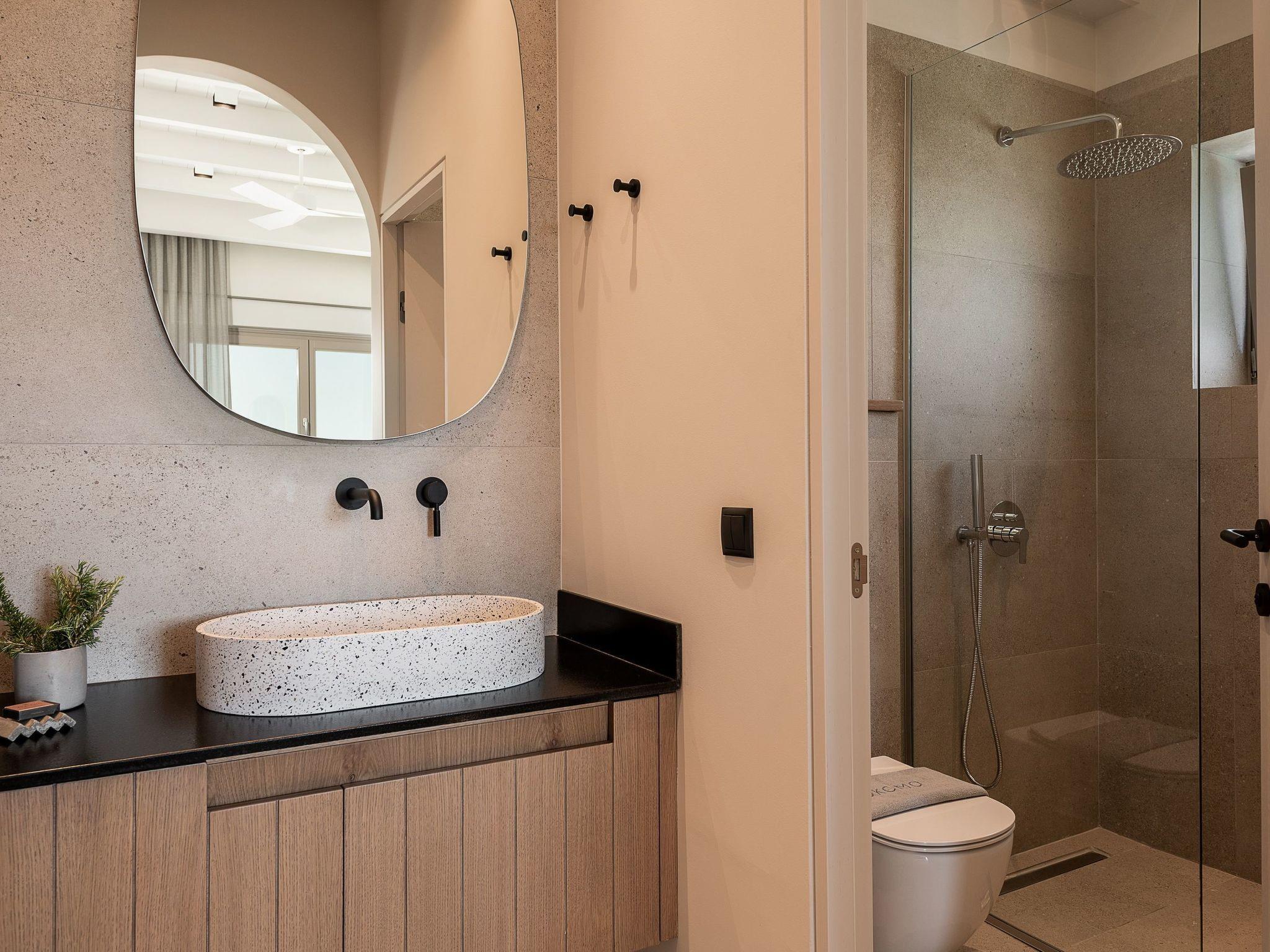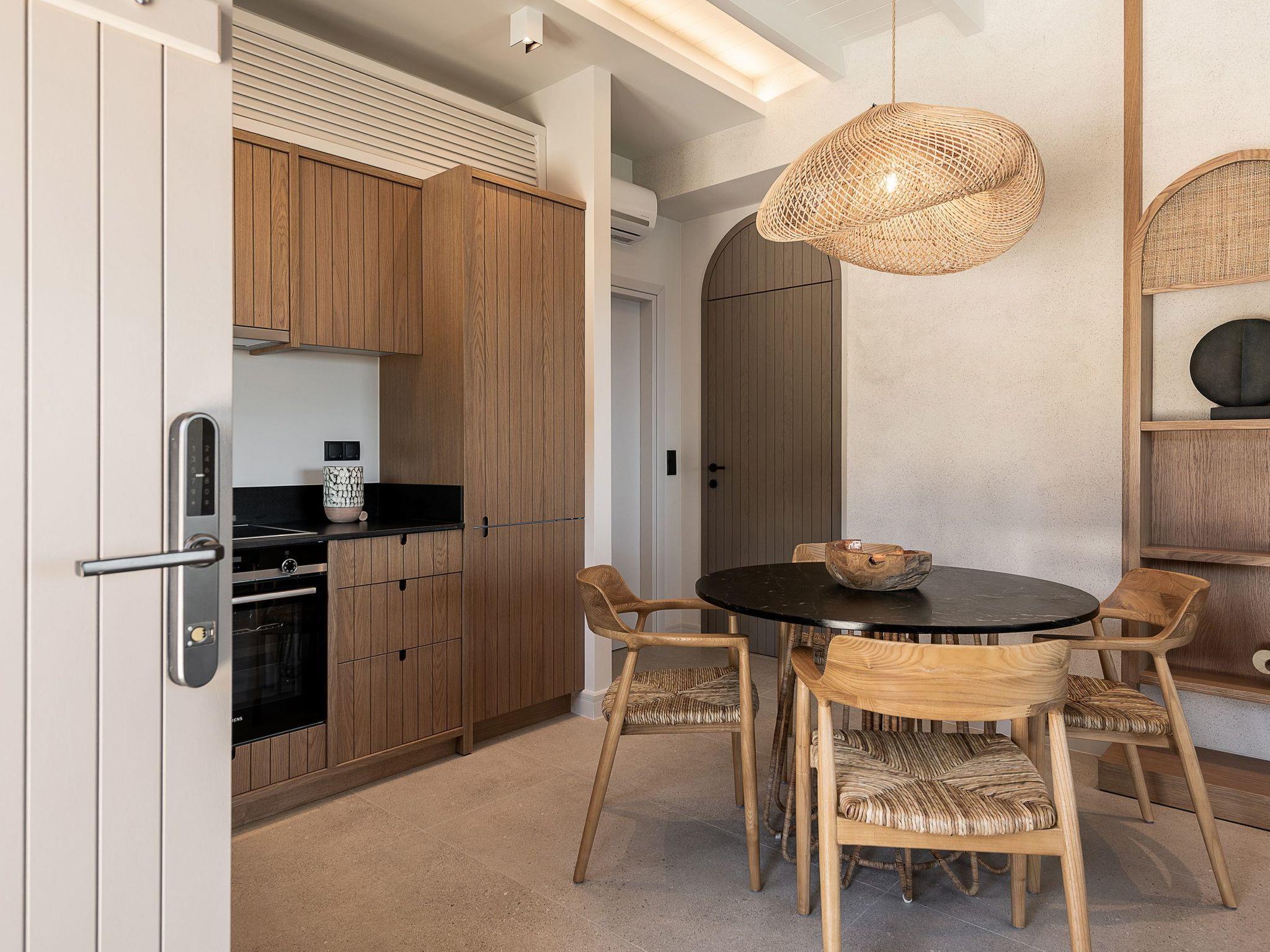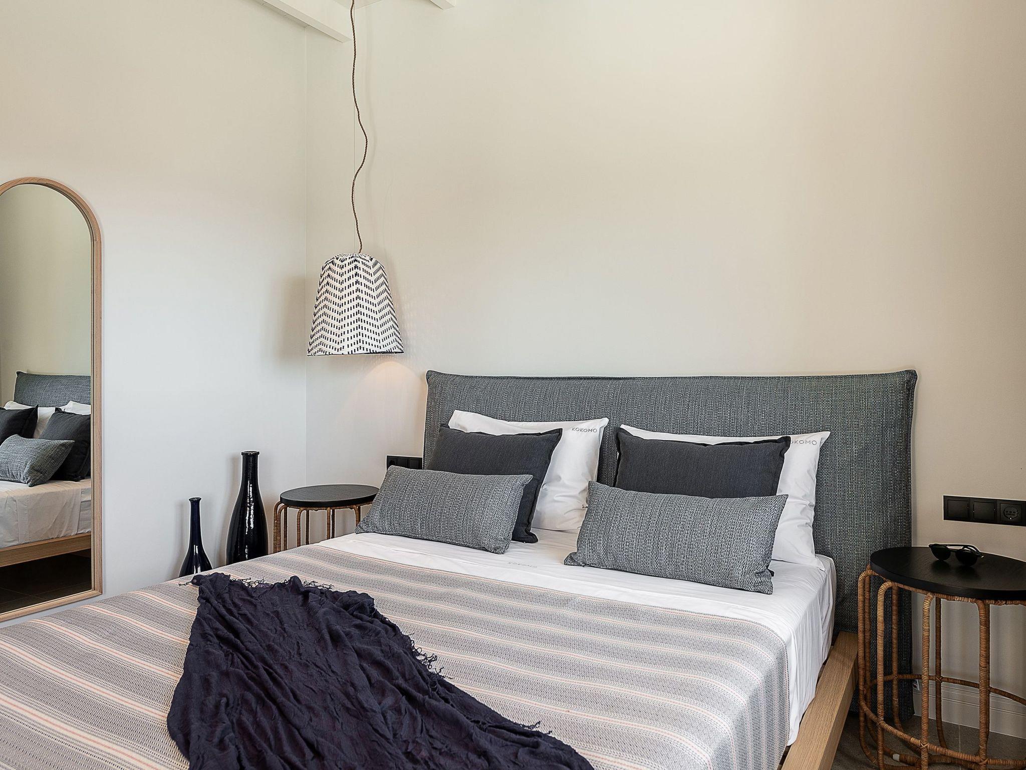 Kokomo Villas are located on a hill overlooking the bay of Lygaria in the greater area of Agia Pelagia. It can be reached from Heraklion/Heraklion Airport in about 25 minutes. It is easily accessible from the Highway and ideal as a base for exploring places of interest. Although close to various magnificent beaches, restaurants and supermarkets, it is also perfect for relaxing in privacy.The villa is characterized by high aesthetics and stunning panoramic views of the Cretan Sea. The earthy tones of the spaces merge into the deep blue of the sea and sky, offering an unforgettable sense of harmony and gentleness. Every aspect, material and element has been carefully selected to wrap you in a state of calmness and satisfaction. All you need to do is enjoy.Villa Gaia hosts 2 bedrooms, both with king size beds and ensuite bathrooms with showers. The front bedroom offers panoramic sea view and direct access to the front veranda. The back bedroom offers direct access to the beautiful backyard. The living-room with a gorgeous view of the sea is connected to a fully equipped open kitchen and dining room and opens out to the veranda. The front outdoor area is exceptionally spacious and the view is a delight to the eyes. It offers a private swimming pool with sunbeds, an outdoor shower, lounge poufs, barbeque (gas) and dining area.Furthermore, Kokomo Villas has solar panels installed to provide some of the energy needed in the property through them. IMPORTANT NOTICE: This property is not suitable for children from 2 to 7 years old, since there is an infinity pool and some not covered areas