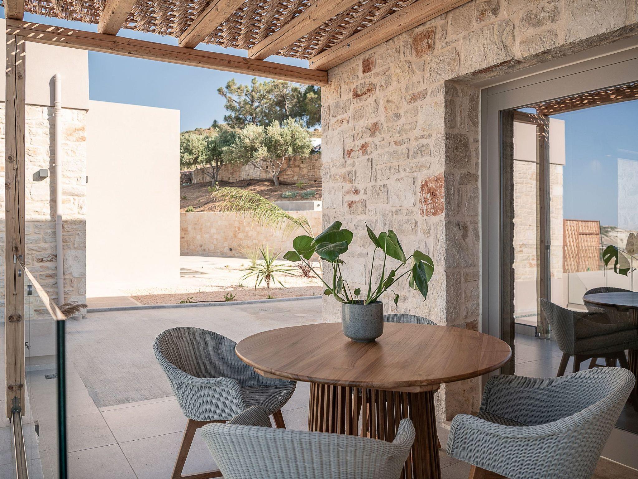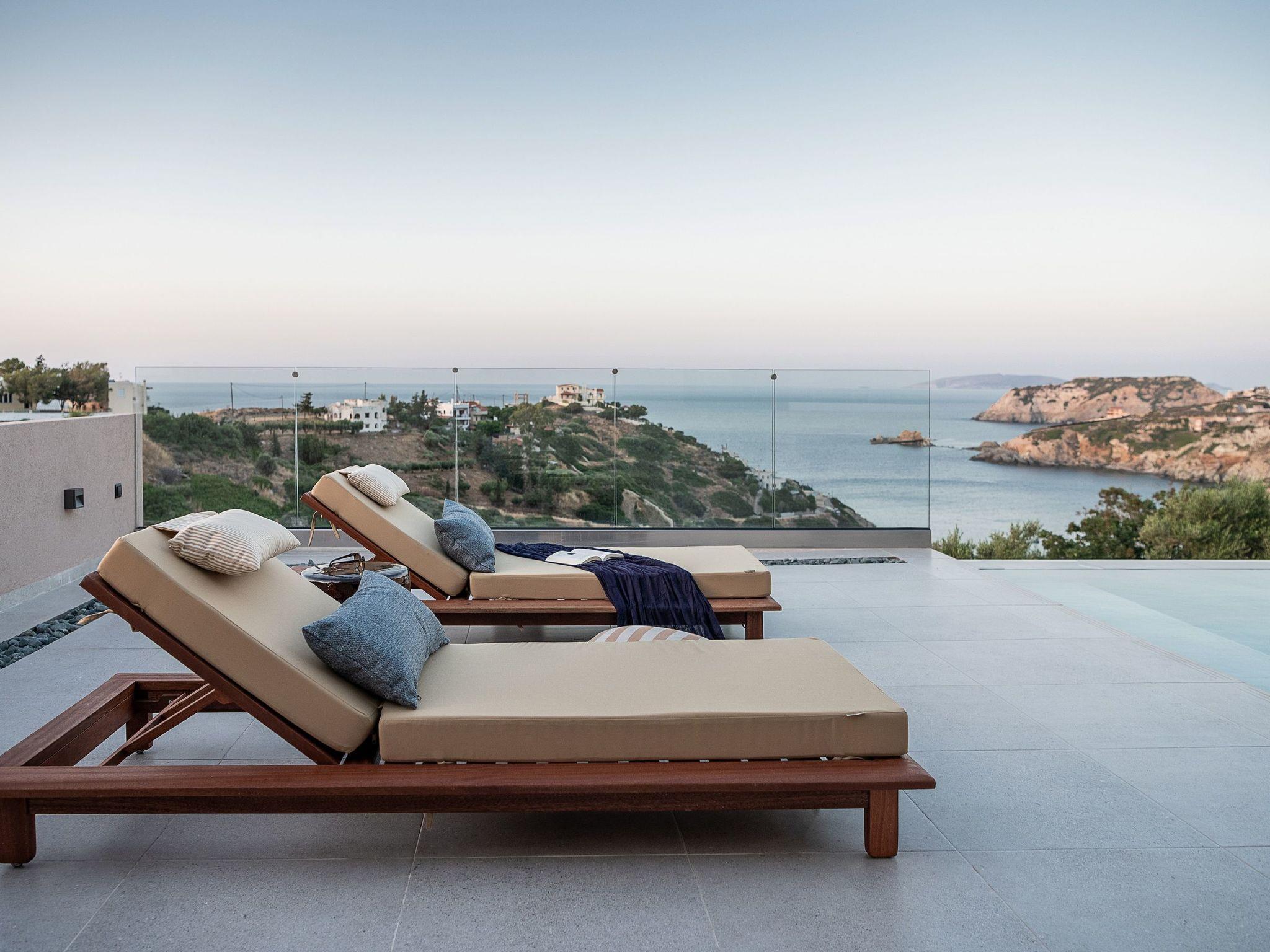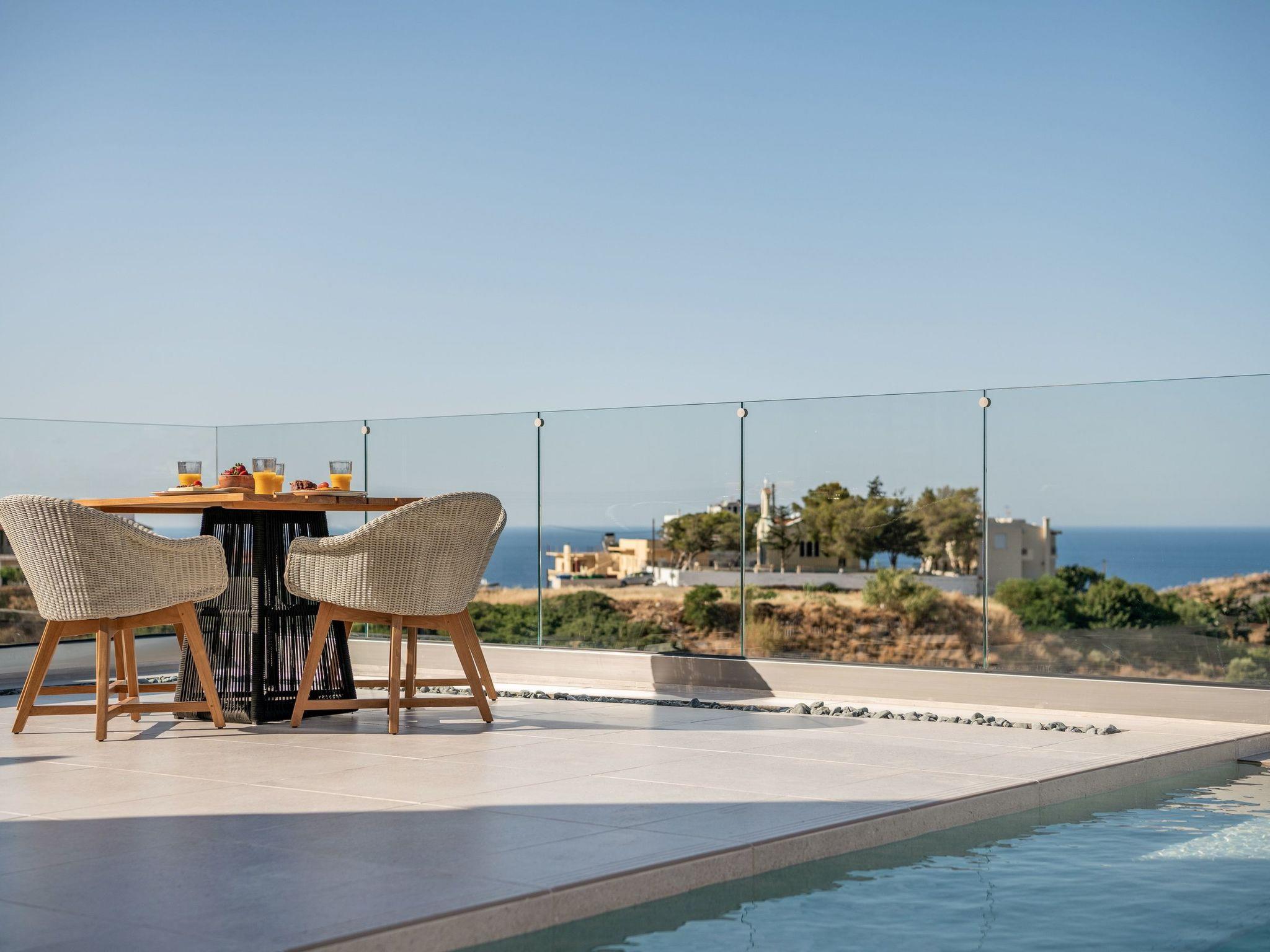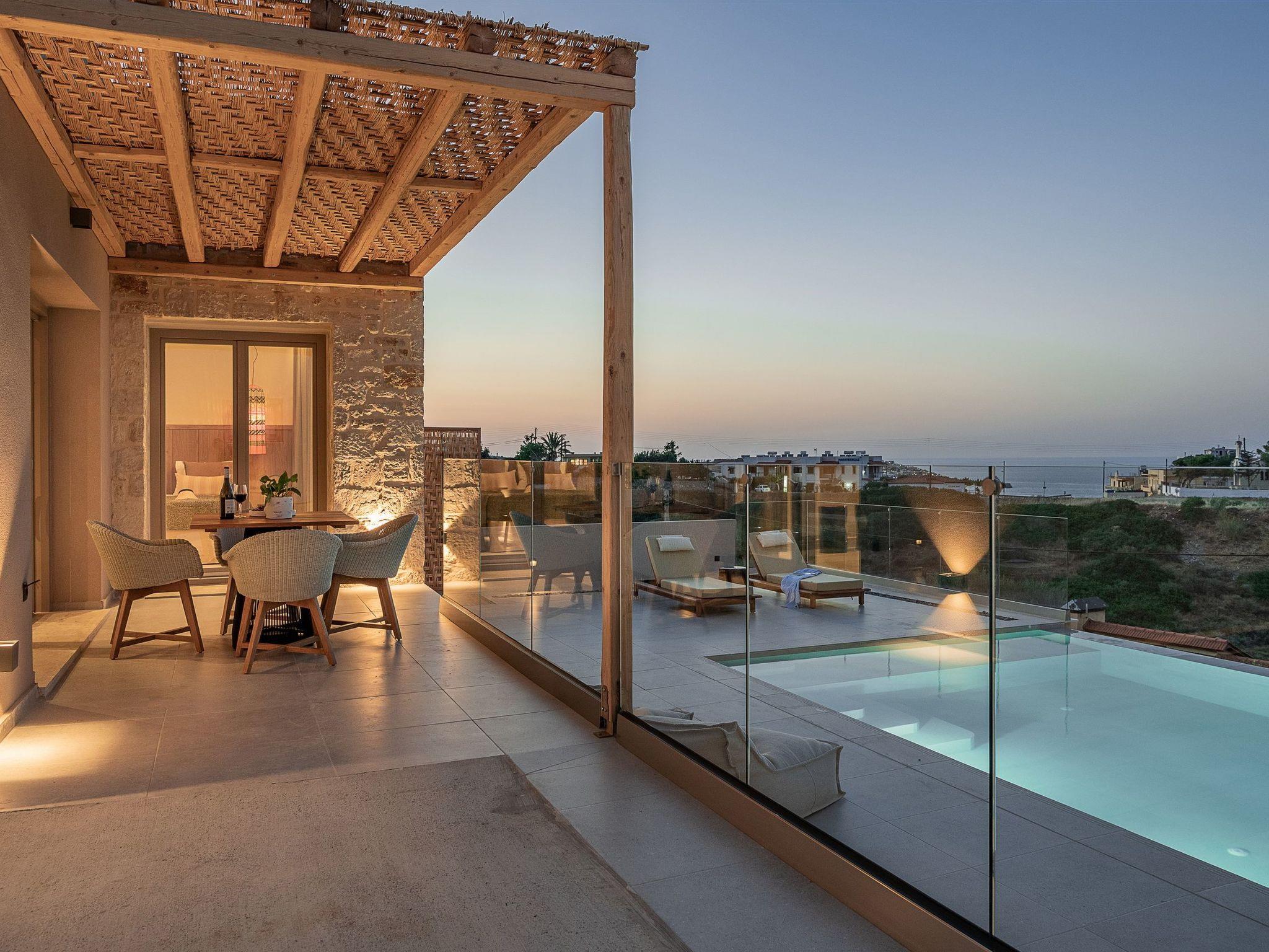 Kokomo Villas are located on a hill overlooking the bay of Lygaria in the greater area of Agia Pelagia. It can be reached from Heraklion/Heraklion Airport in about 25 minutes. It is easily accessible from the Highway and ideal as a base for exploring places of interest. Although close to various magnificent beaches, restaurants and supermarkets, it is also perfect for relaxing in privacy.The villa is characterized by high aesthetics and stunning panoramic views of the Cretan Sea. The earthy tones of the spaces merge into the deep blue of the sea and sky, offering an unforgettable sense of harmony and gentleness. Every aspect, material and element has been carefully selected to wrap you in a state of calmness and satisfaction. All you need to do is enjoy.Villa Thea hosts 1 bedroom with king size bed and panoramic sea view as well as directs access to the front veranda. Guests will enjoy the lovely stylish bathroom with double sinks and double showers. The spacious living-room with a gorgeous view of the sea is connected to a fully equipped open kitchen and dining room. The living room also opens out to the front veranda, which offers a dining table and barbeque (gas). Just below the veranda, there is the pool area which has a private swimming pool with sunbeds, an outdoor shower and lounge poufs.Furthermore, Kokomo Villas has solar panels installed to provide some of the energy needed in the property through them. IMPORTANT NOTICE: This property is not suitable for children from 2 to 7 years old, since there is an infinity pool and some not covered areas