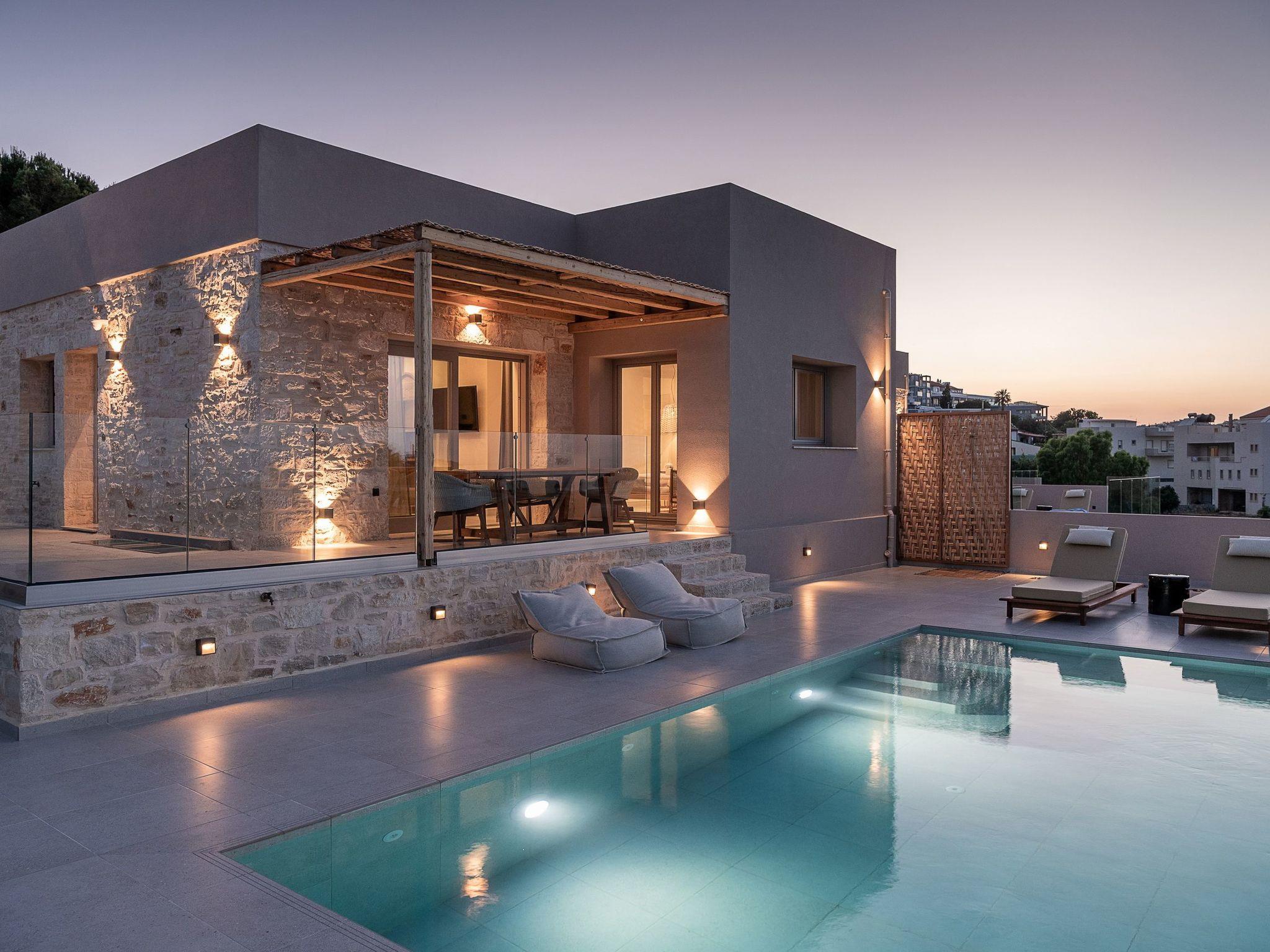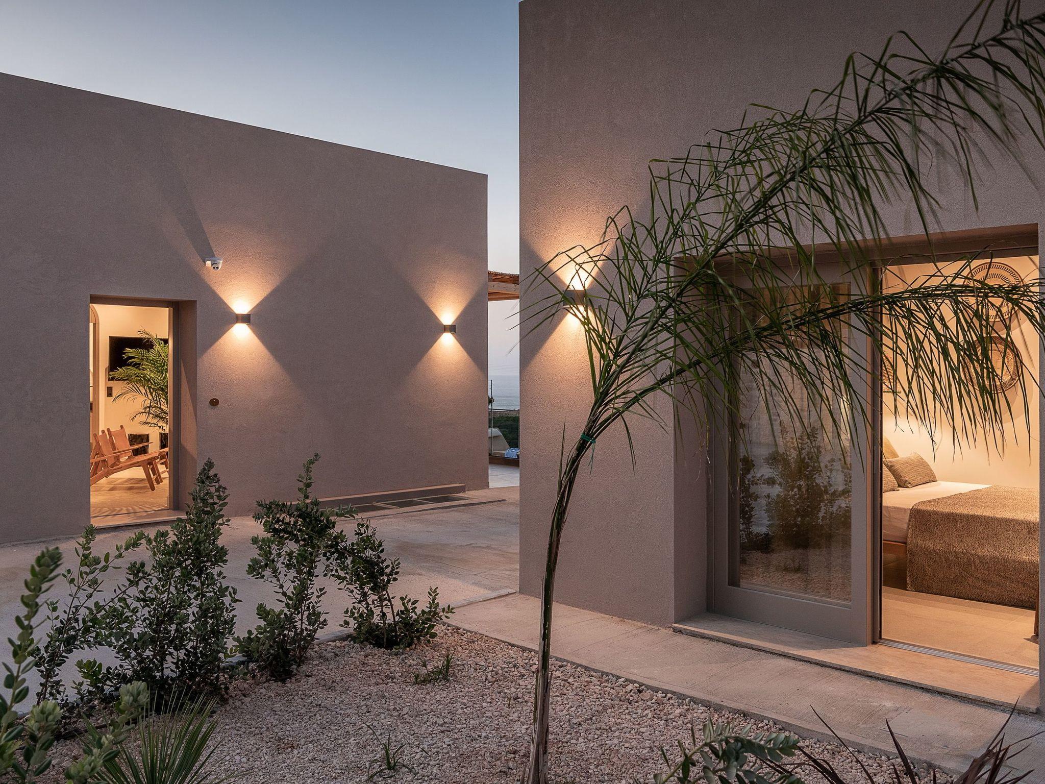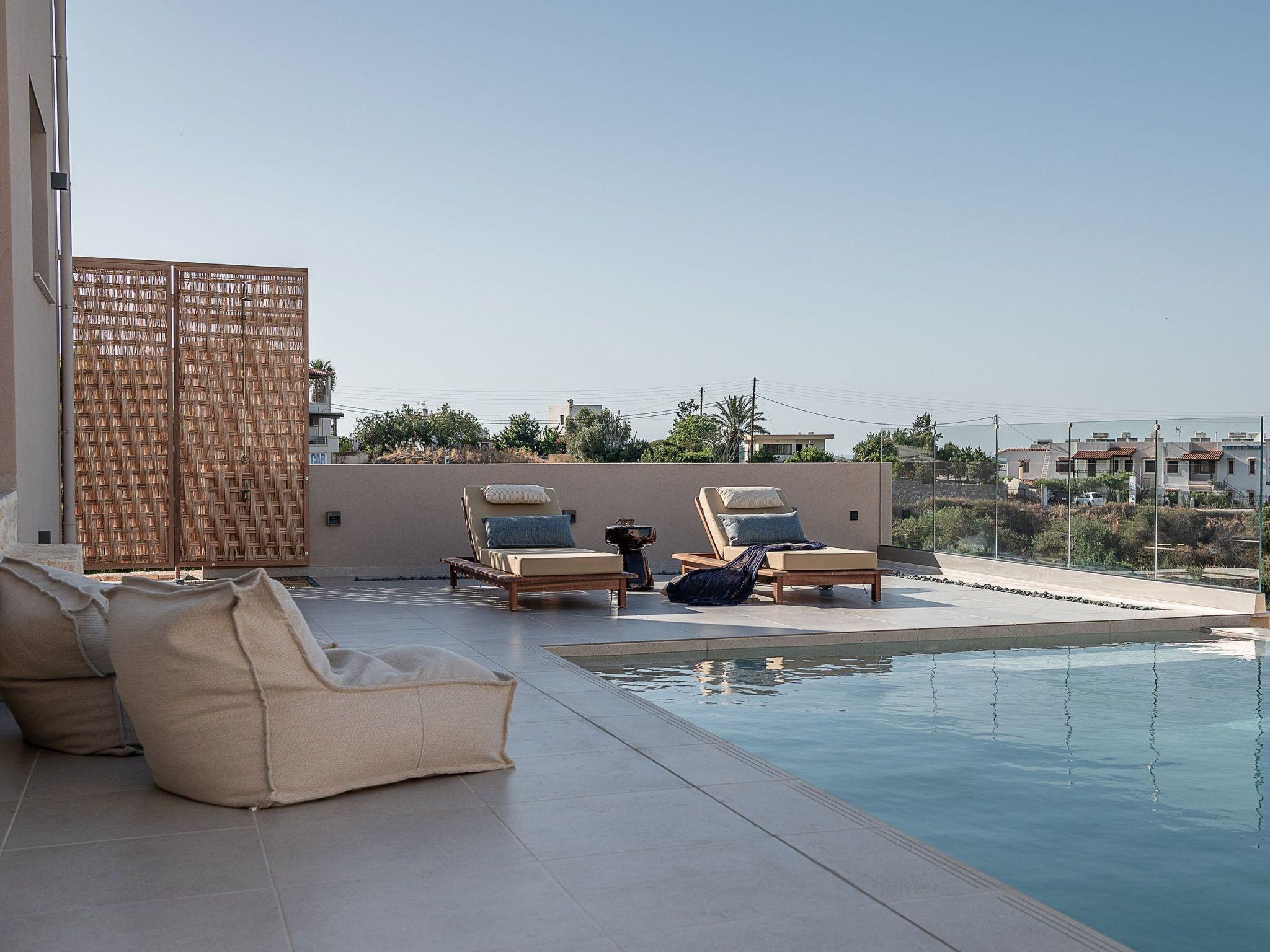Kokomo Villas are located on a hill overlooking the bay of Lygaria in the greater area of Agia Pelagia. It can be reached from Heraklion/Heraklion Airport in about 25 minutes. It is easily accessible from the Highway and ideal as a base for exploring places of interest. Although close to various magnificent beaches, restaurants and supermarkets, it is also perfect for relaxing in privacy.The villa is characterized by high aesthetics and stunning panoramic views of the Cretan Sea. The earthy tones of the spaces merge into the deep blue of the sea and sky, offering an unforgettable sense of harmony and gentleness. Every aspect, material and element has been carefully selected to wrap you in a state of calmness and satisfaction. All you need to do is enjoy.Villa Thea hosts 1 bedroom with king size bed and panoramic sea view as well as directs access to the front veranda. Guests will enjoy the lovely stylish bathroom with double sinks and double showers. The spacious living-room with a gorgeous view of the sea is connected to a fully equipped open kitchen and dining room. The living room also opens out to the front veranda, which offers a dining table and barbeque (gas). Just below the veranda, there is the pool area which has a private swimming pool with sunbeds, an outdoor shower and lounge poufs.Furthermore, Kokomo Villas has solar panels installed to provide some of the energy needed in the property through them. IMPORTANT NOTICE: This property is not suitable for children from 2 to 7 years old, since there is an infinity pool and some not covered areas