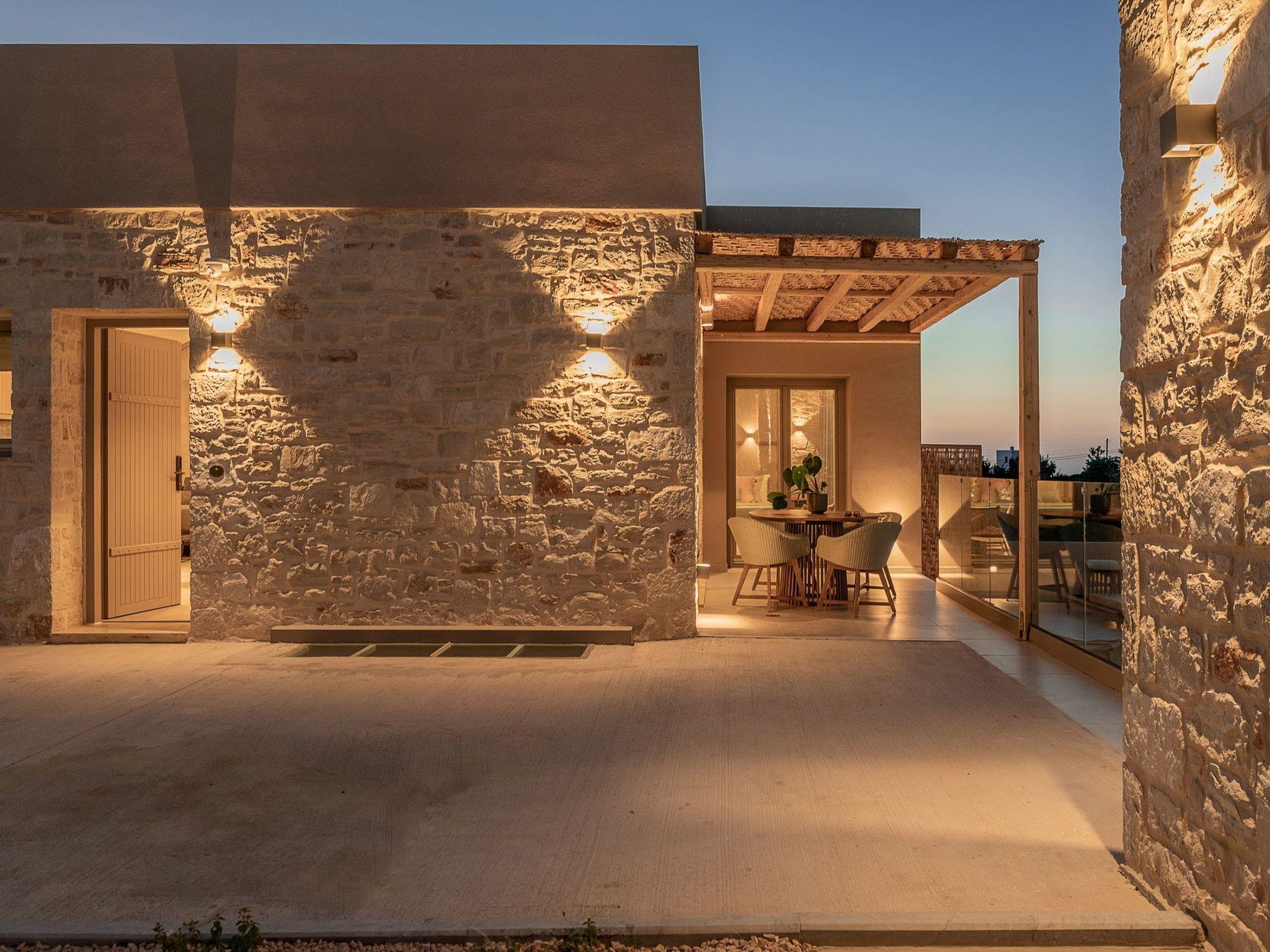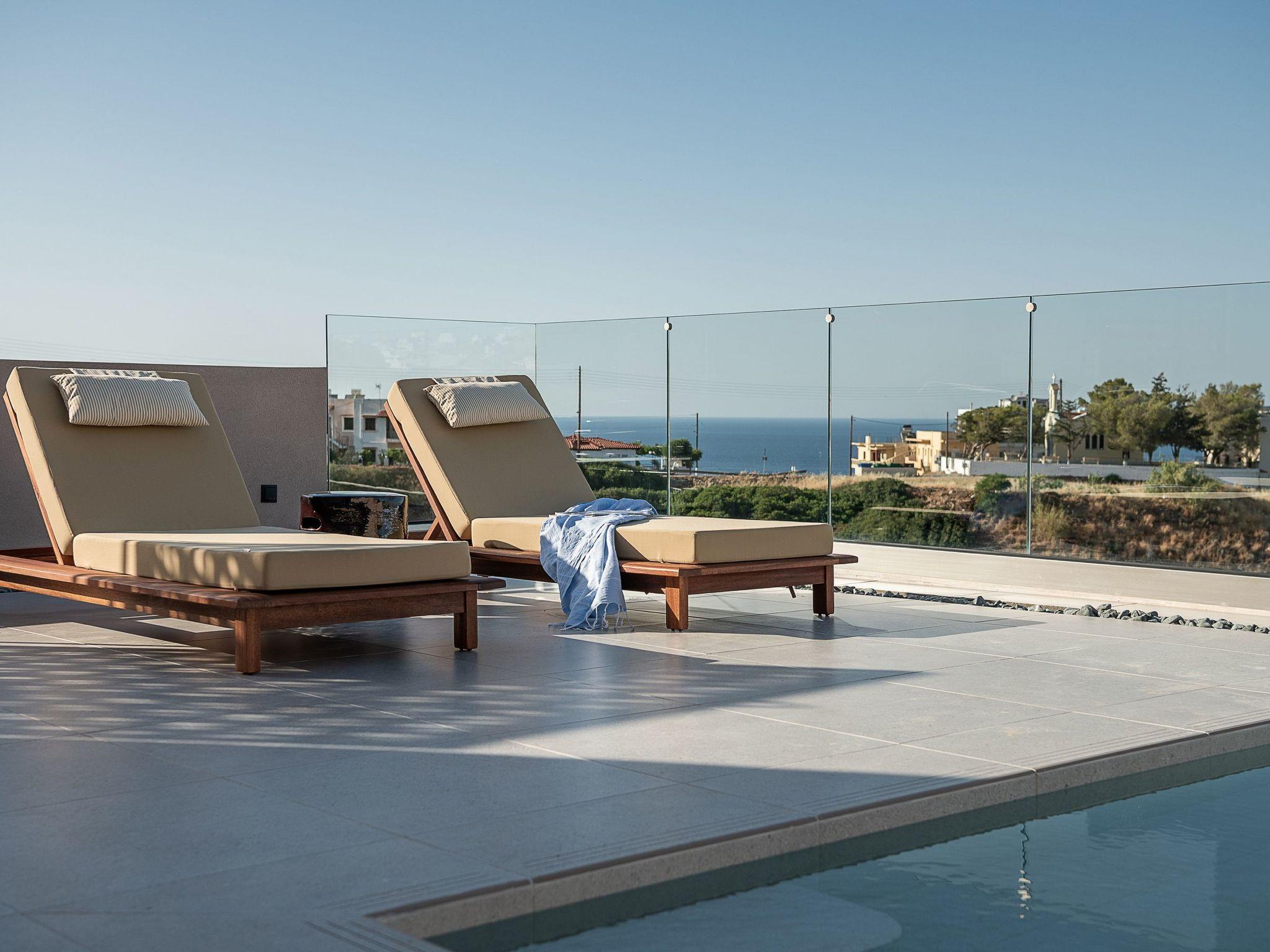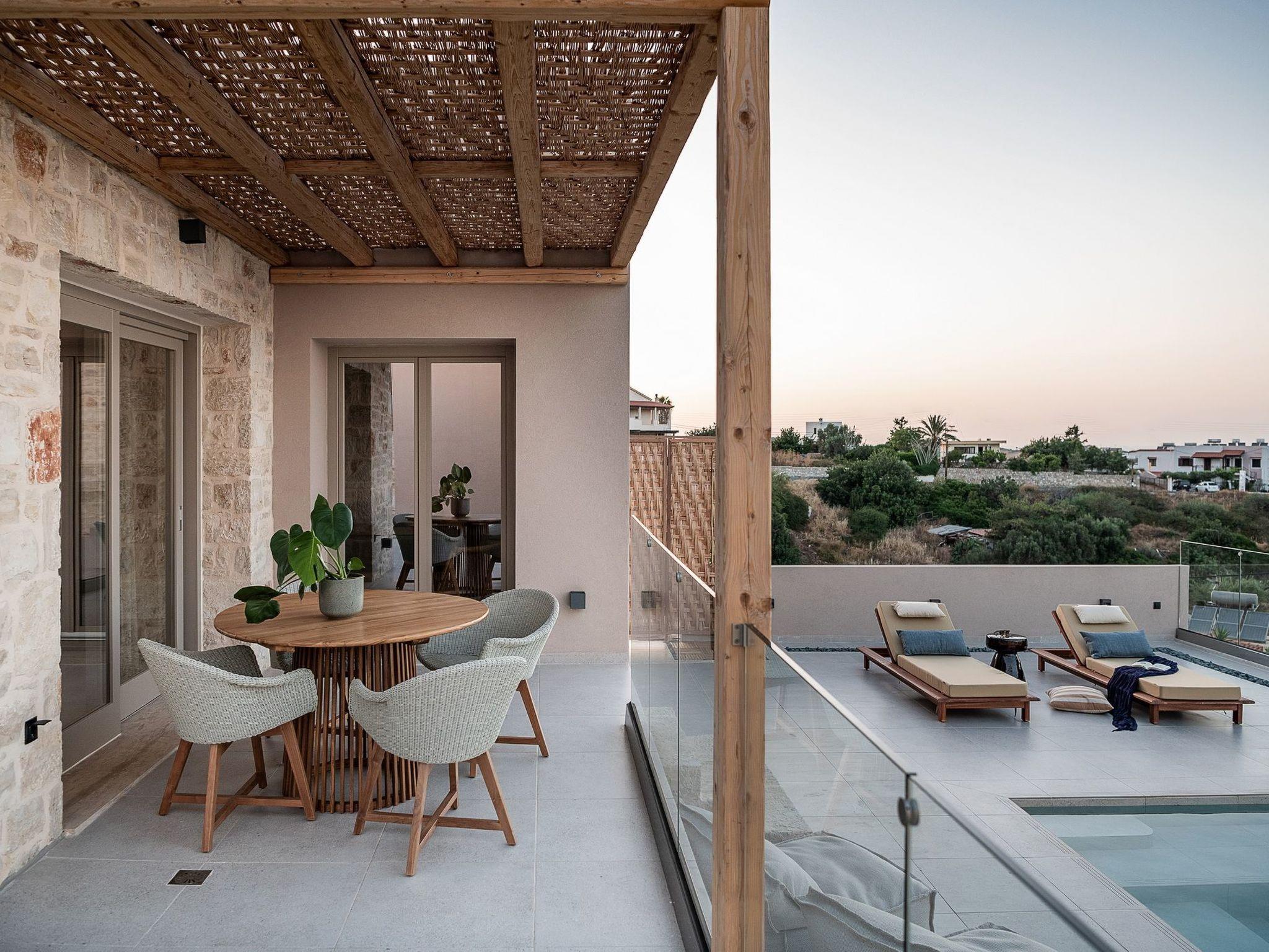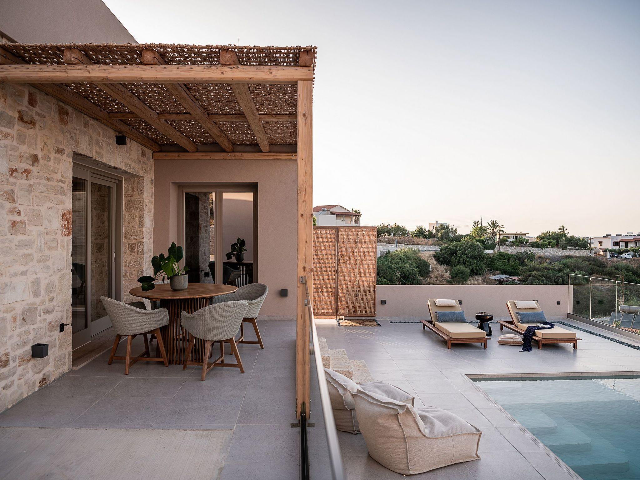 Kokomo Villas consists of 3 luxury villas, located on a hill overlooking the bay of Lygaria in the greater area of Agia Pelagia. It can be reached from Heraklion/Heraklion Airport in about 25 minutes. It is easily accessible from the Highway and ideal as a base for exploring places of interest. Although close to various magnificent beaches, restaurants, and supermarkets, it is also perfect for relaxing in privacy. The villa is characterized by high aesthetics and stunning panoramic views of the Cretan Sea. The earthy tones of the spaces merge into the deep blue of the sea and sky, offering an unforgettable sense of harmony and gentleness. Every aspect, material, and element has been carefully selected to wrap you in a state of calmness and satisfaction. All you need to do is enjoy. Villa Aura hosts 2 bedrooms, both with king-size beds and ensuite bathrooms with showers. The front bedroom offers a panoramic sea view and direct access to the front veranda. The back bedroom offers a tasteful private veranda with views of the garden. The common area consists of a cosy living room, workspace, dining table fully equipped kitchen. This area also has direct access to the front veranda. Just below the veranda, which includes a dining table and a barbeque (gas), there is the pool area, which has a private swimming pool with sunbeds, an outdoor shower, and lounge poufs. Furthermore, Kokomo Villas has solar panels installed to provide some of the energy needed for the property. IMPORTANT NOTICE: This property is not suitable for children from 2 to 7 years old, since there is an infinity pool and some uncovered areas