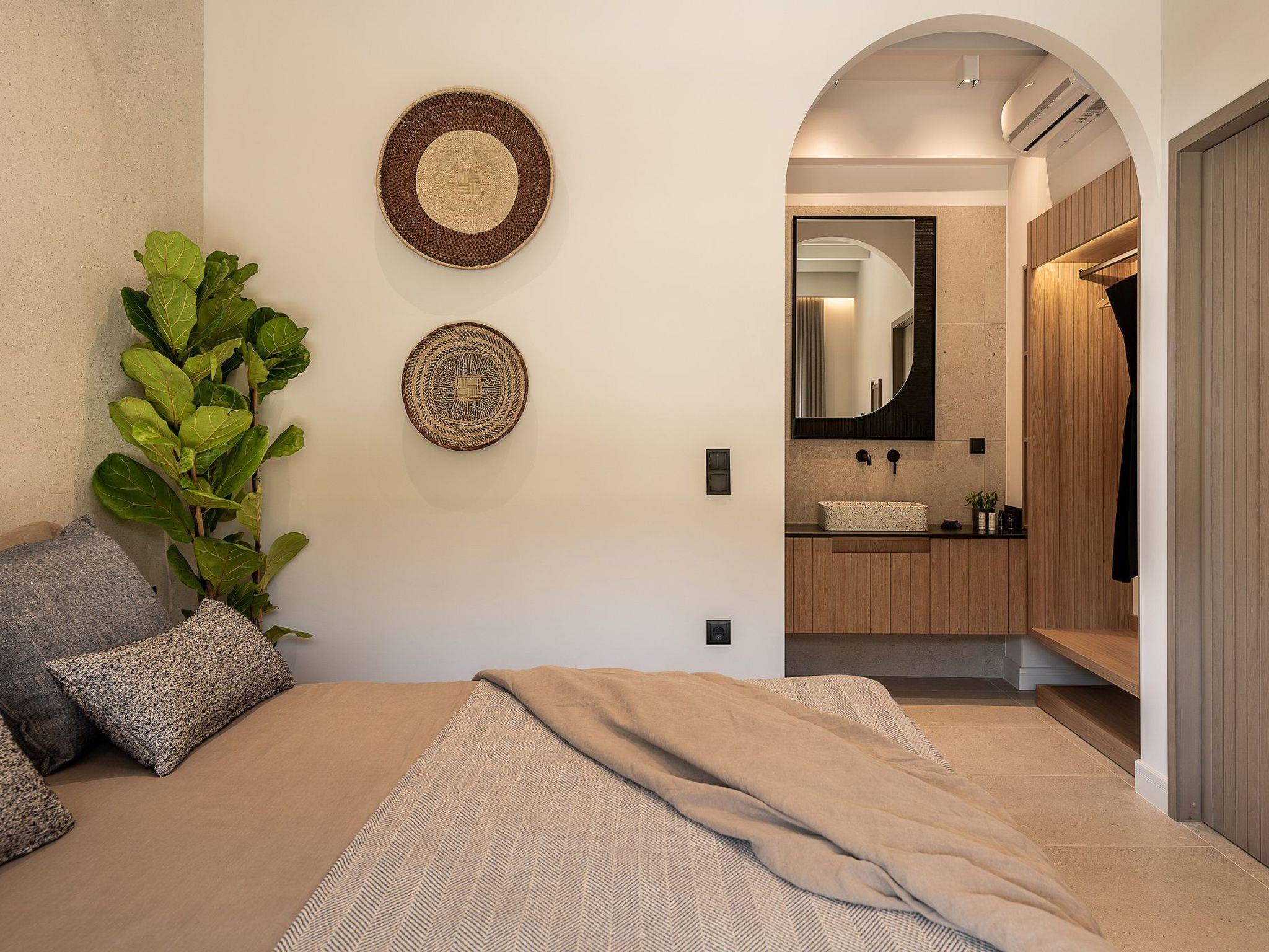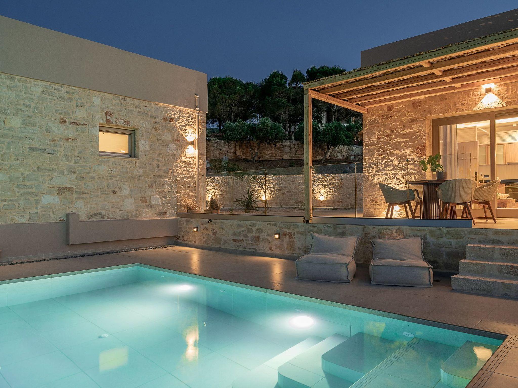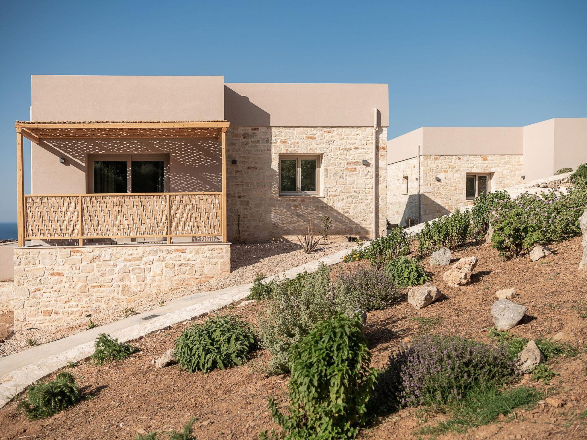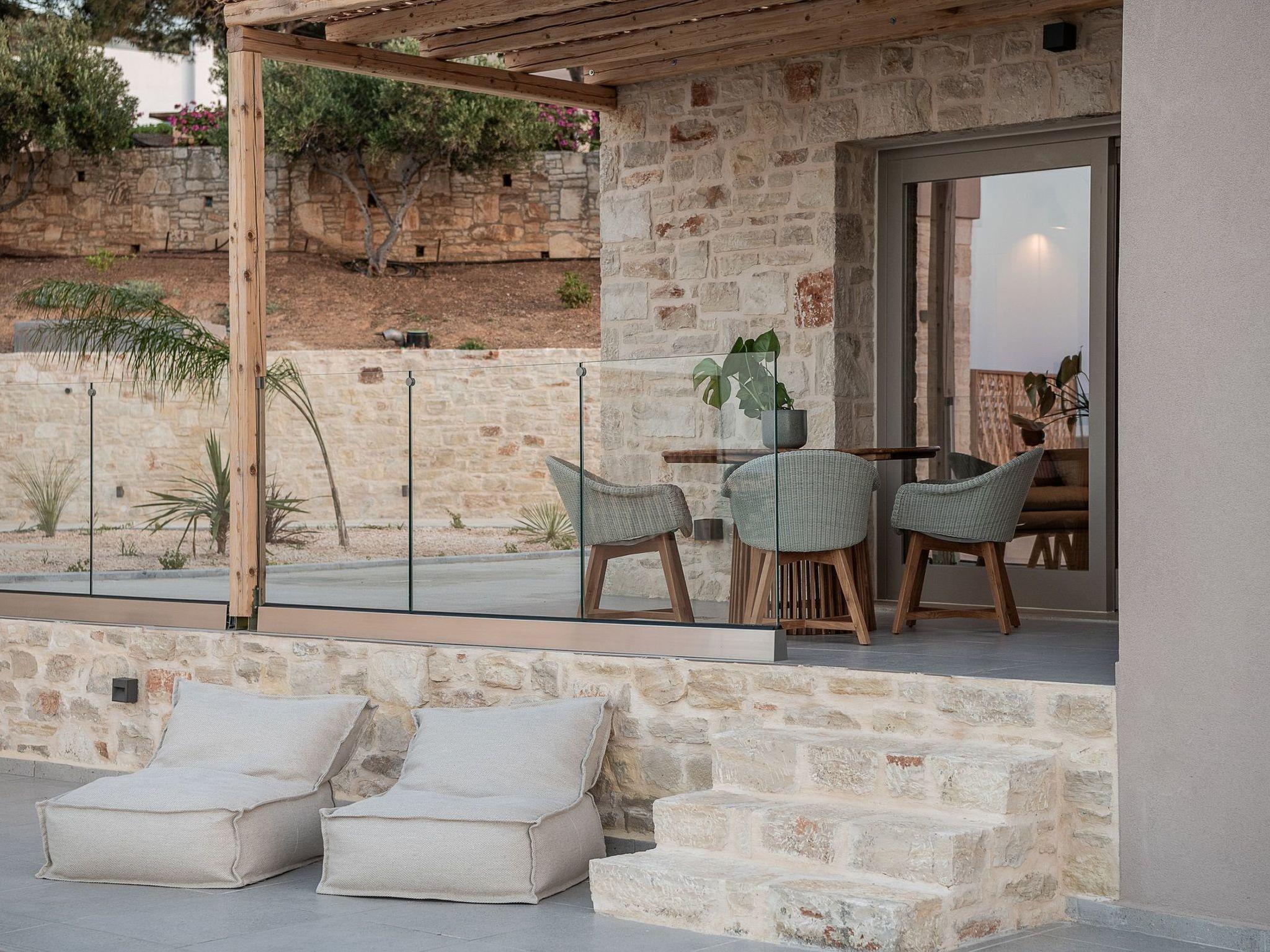 Kokomo Villas consists of 3 luxury villas, located on a hill overlooking the bay of Lygaria in the greater area of Agia Pelagia. It can be reached from Heraklion/Heraklion Airport in about 25 minutes. It is easily accessible from the Highway and ideal as a base for exploring places of interest. Although close to various magnificent beaches, restaurants, and supermarkets, it is also perfect for relaxing in privacy. The villa is characterized by high aesthetics and stunning panoramic views of the Cretan Sea. The earthy tones of the spaces merge into the deep blue of the sea and sky, offering an unforgettable sense of harmony and gentleness. Every aspect, material, and element has been carefully selected to wrap you in a state of calmness and satisfaction. All you need to do is enjoy. Villa Aura hosts 2 bedrooms, both with king-size beds and ensuite bathrooms with showers. The front bedroom offers a panoramic sea view and direct access to the front veranda. The back bedroom offers a tasteful private veranda with views of the garden. The common area consists of a cosy living room, workspace, dining table fully equipped kitchen. This area also has direct access to the front veranda. Just below the veranda, which includes a dining table and a barbeque (gas), there is the pool area, which has a private swimming pool with sunbeds, an outdoor shower, and lounge poufs. Furthermore, Kokomo Villas has solar panels installed to provide some of the energy needed for the property. IMPORTANT NOTICE: This property is not suitable for children from 2 to 7 years old, since there is an infinity pool and some uncovered areas