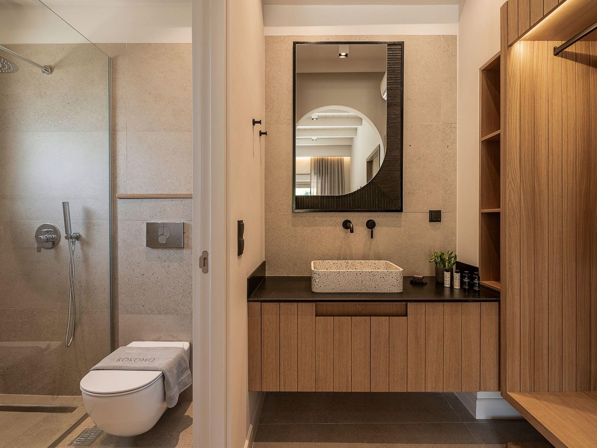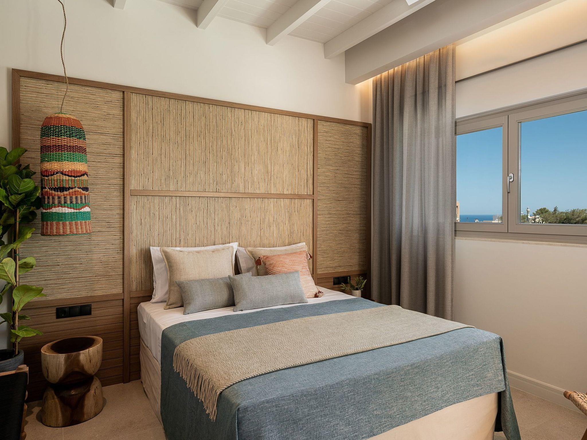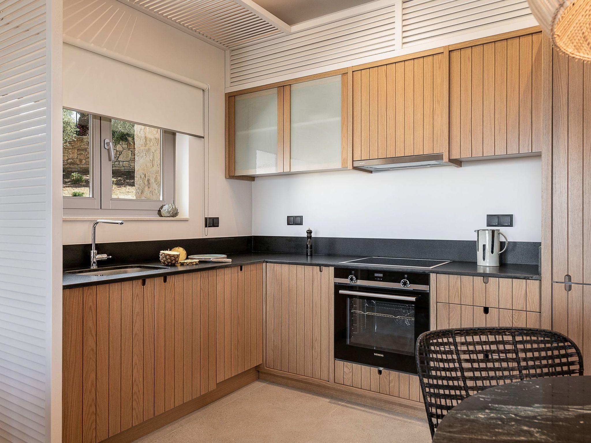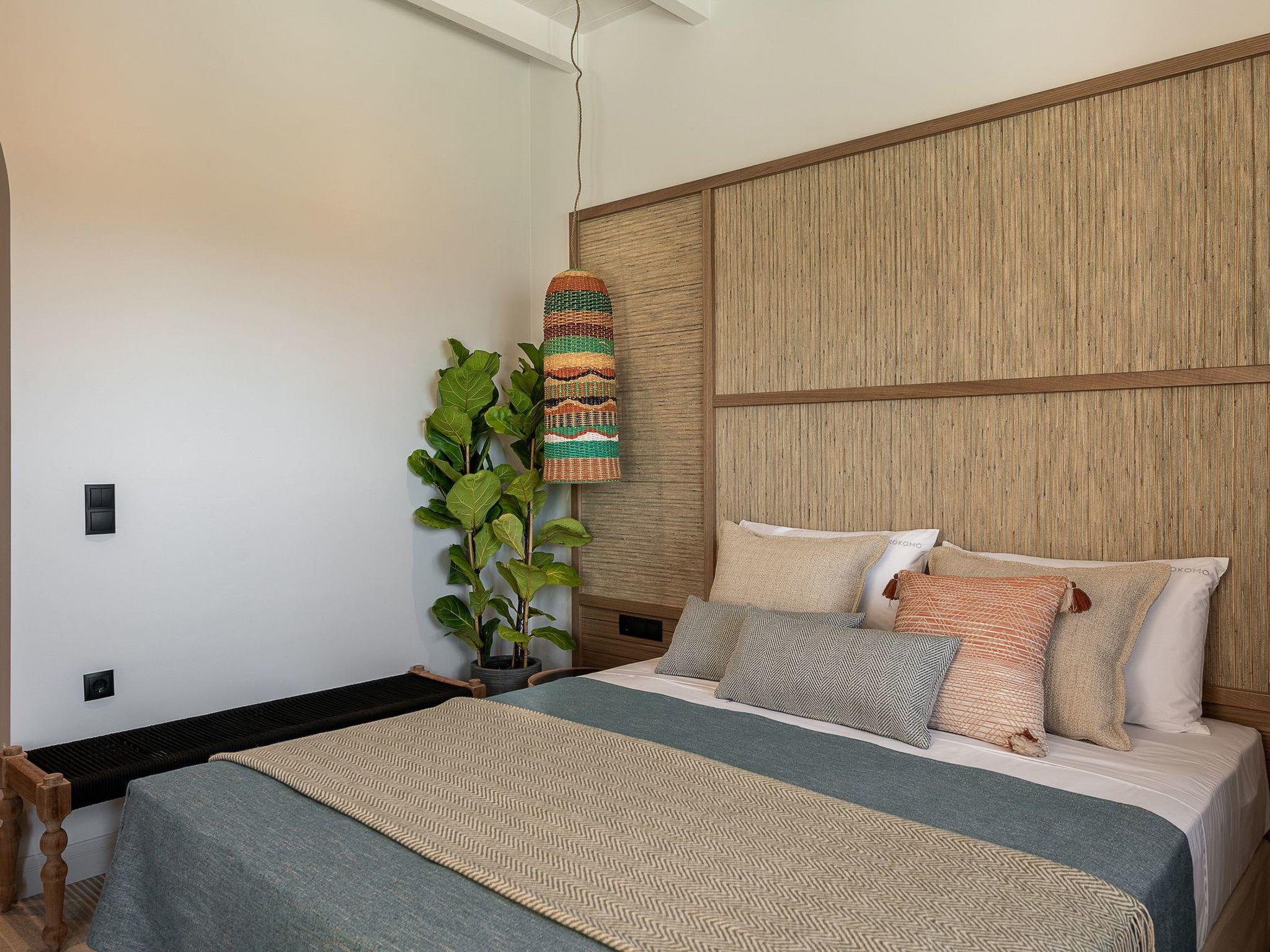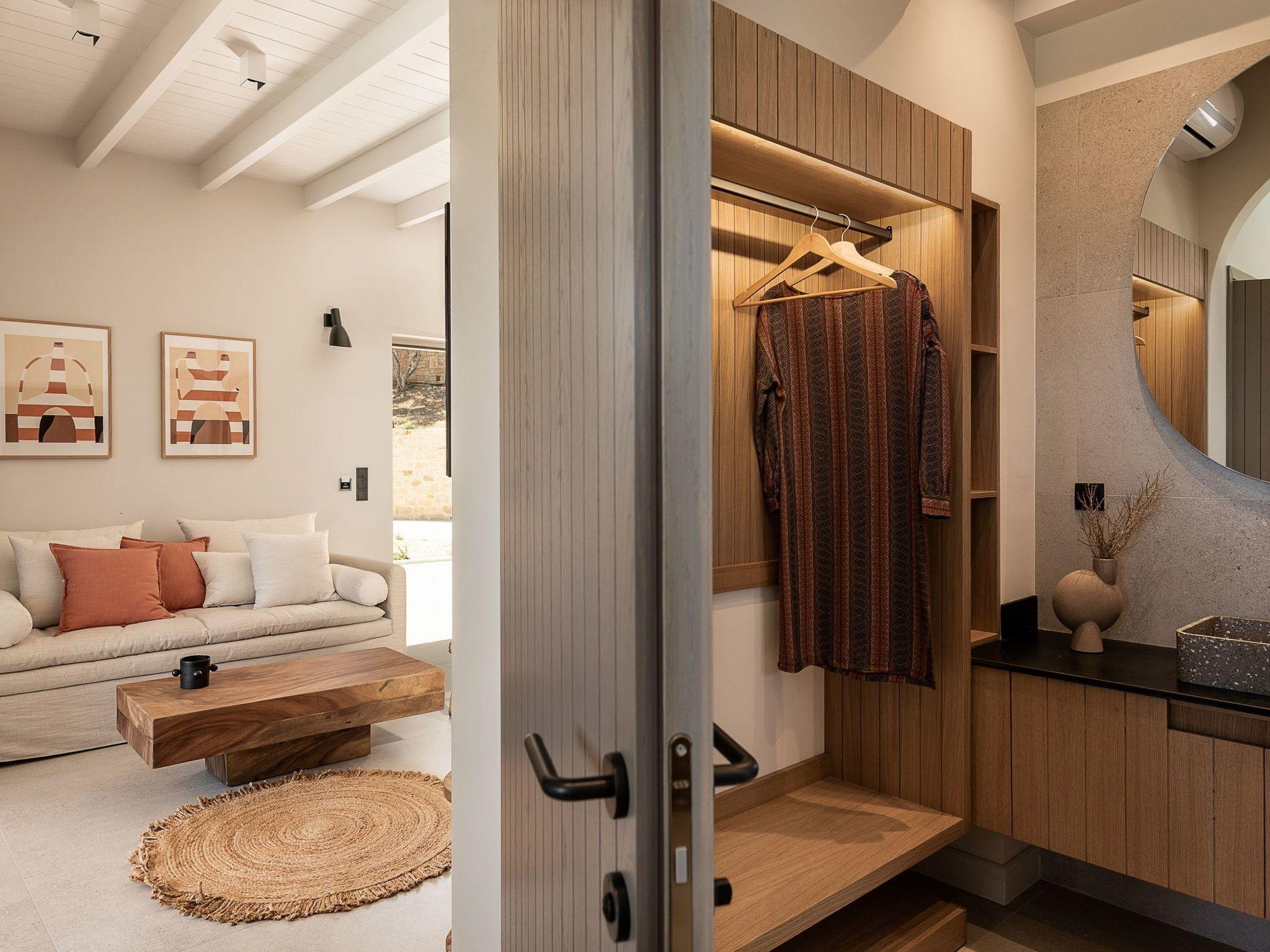 Kokomo Villas consists of 3 luxury villas, located on a hill overlooking the bay of Lygaria in the greater area of Agia Pelagia. It can be reached from Heraklion/Heraklion Airport in about 25 minutes. It is easily accessible from the Highway and ideal as a base for exploring places of interest. Although close to various magnificent beaches, restaurants, and supermarkets, it is also perfect for relaxing in privacy. The villa is characterized by high aesthetics and stunning panoramic views of the Cretan Sea. The earthy tones of the spaces merge into the deep blue of the sea and sky, offering an unforgettable sense of harmony and gentleness. Every aspect, material, and element has been carefully selected to wrap you in a state of calmness and satisfaction. All you need to do is enjoy. Villa Aura hosts 2 bedrooms, both with king-size beds and ensuite bathrooms with showers. The front bedroom offers a panoramic sea view and direct access to the front veranda. The back bedroom offers a tasteful private veranda with views of the garden. The common area consists of a cosy living room, workspace, dining table fully equipped kitchen. This area also has direct access to the front veranda. Just below the veranda, which includes a dining table and a barbeque (gas), there is the pool area, which has a private swimming pool with sunbeds, an outdoor shower, and lounge poufs. Furthermore, Kokomo Villas has solar panels installed to provide some of the energy needed for the property. IMPORTANT NOTICE: This property is not suitable for children from 2 to 7 years old, since there is an infinity pool and some uncovered areas