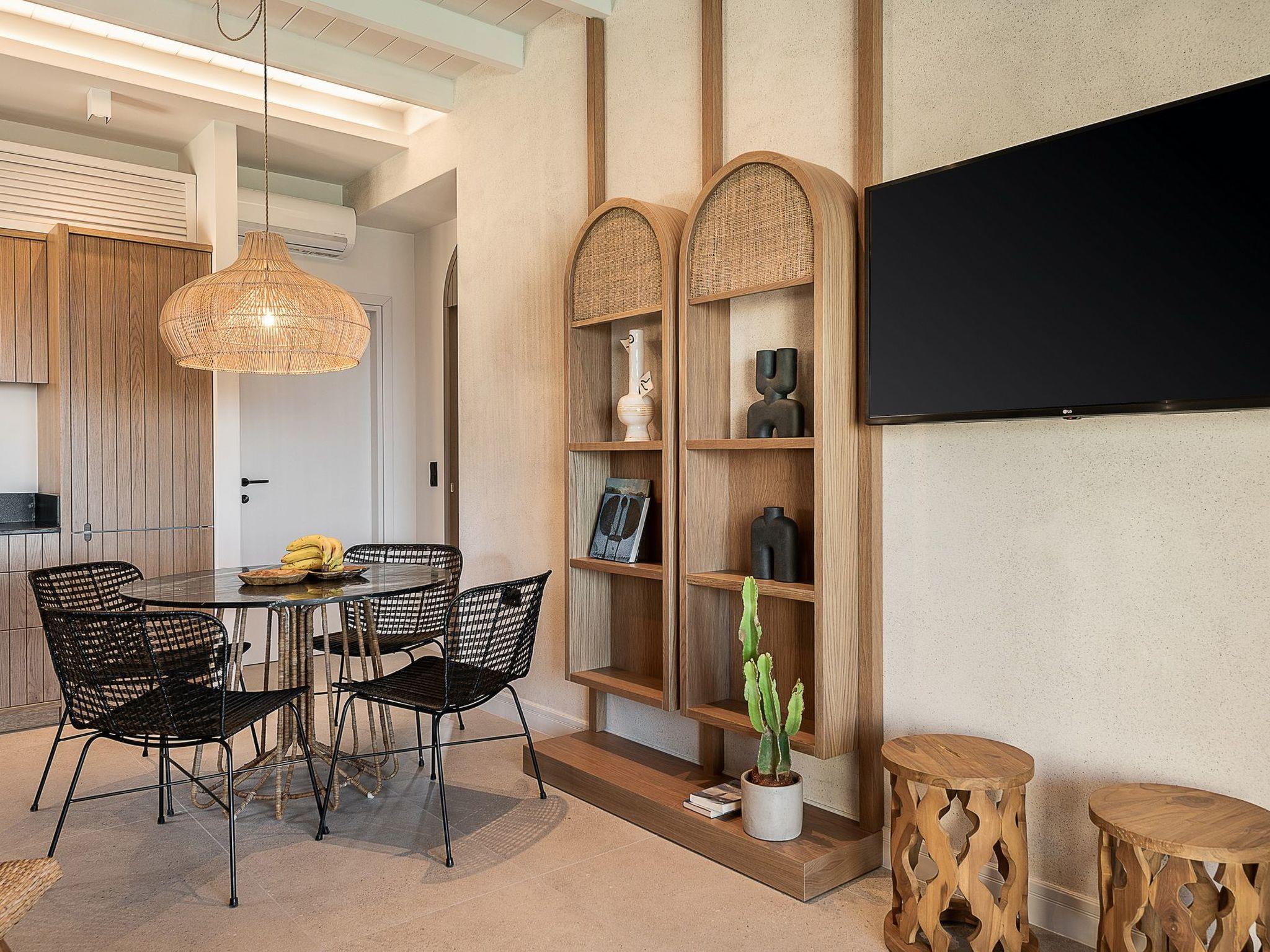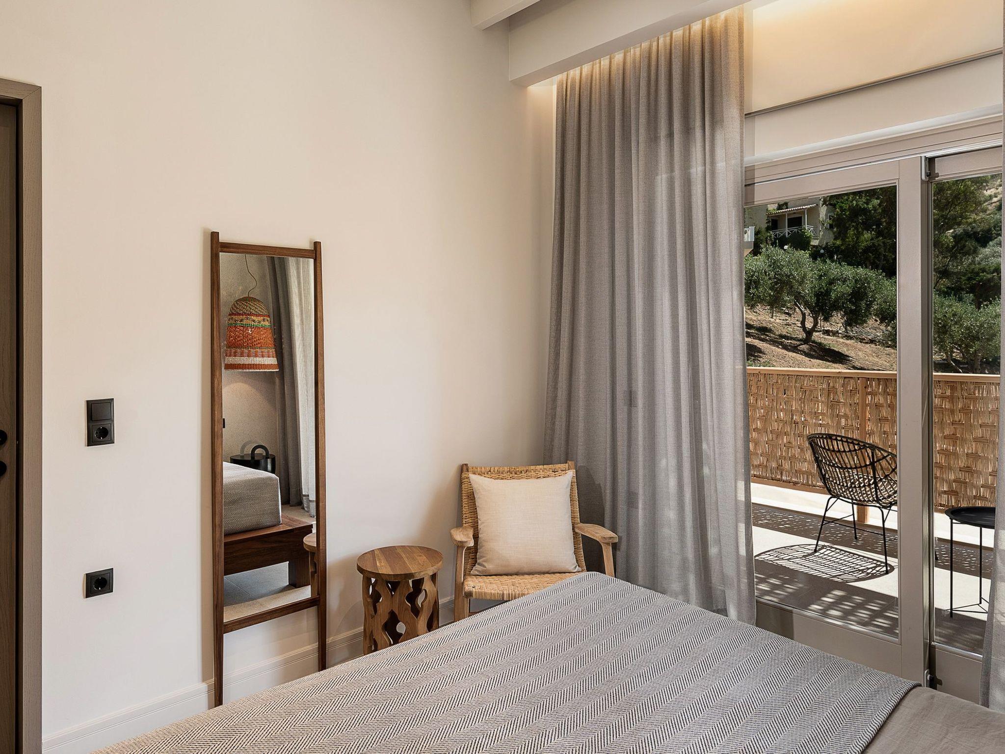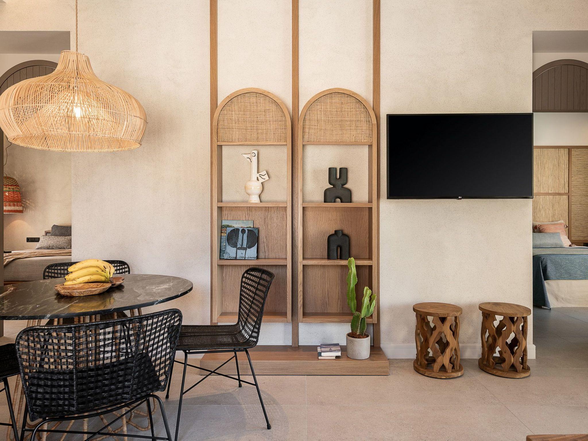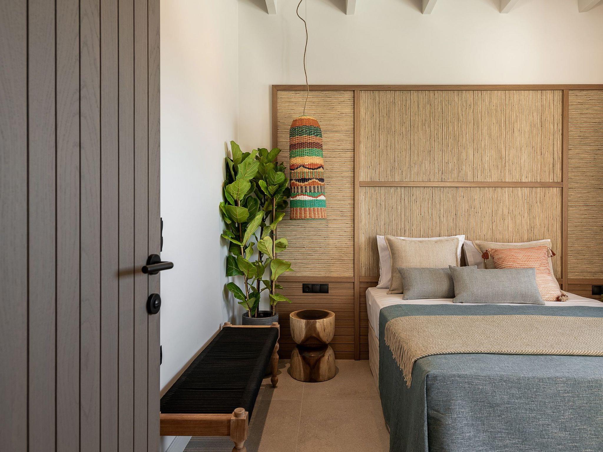 Kokomo Villas consists of 3 luxury villas, located on a hill overlooking the bay of Lygaria in the greater area of Agia Pelagia. It can be reached from Heraklion/Heraklion Airport in about 25 minutes. It is easily accessible from the Highway and ideal as a base for exploring places of interest. Although close to various magnificent beaches, restaurants, and supermarkets, it is also perfect for relaxing in privacy. The villa is characterized by high aesthetics and stunning panoramic views of the Cretan Sea. The earthy tones of the spaces merge into the deep blue of the sea and sky, offering an unforgettable sense of harmony and gentleness. Every aspect, material, and element has been carefully selected to wrap you in a state of calmness and satisfaction. All you need to do is enjoy. Villa Aura hosts 2 bedrooms, both with king-size beds and ensuite bathrooms with showers. The front bedroom offers a panoramic sea view and direct access to the front veranda. The back bedroom offers a tasteful private veranda with views of the garden. The common area consists of a cosy living room, workspace, dining table fully equipped kitchen. This area also has direct access to the front veranda. Just below the veranda, which includes a dining table and a barbeque (gas), there is the pool area, which has a private swimming pool with sunbeds, an outdoor shower, and lounge poufs. Furthermore, Kokomo Villas has solar panels installed to provide some of the energy needed for the property. IMPORTANT NOTICE: This property is not suitable for children from 2 to 7 years old, since there is an infinity pool and some uncovered areas