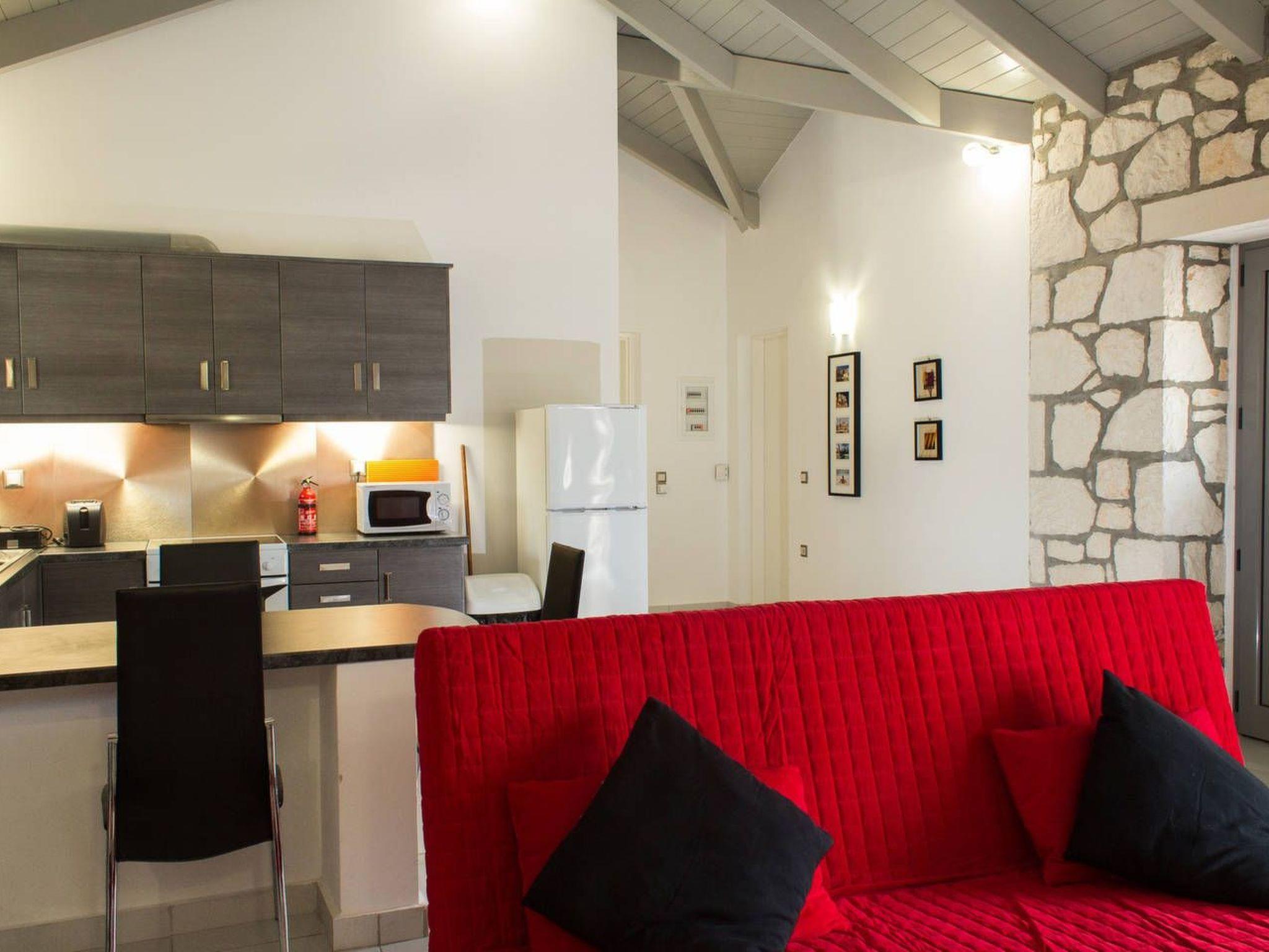 The villa boasts a thoughtful layout, including two cozy bedrooms and a vast, open-concept living area that combines the kitchen and living room into one seamless space. The master bedroom is a peaceful sanctuary, featuring a comfortable double bed and a large built-in cupboard, complemented by French double windows that ensure security and serenity. The second bedroom, ideal for additional guests or children, offers two single beds and a smaller cupboard, maintaining the same high standard of safety with secured windows. The heart of the villa, the open kitchen, is fully equipped with modern amenities such as a fridge, ceramic hob, oven, microwave, toaster, coffee machine, and kettle, ensuring a delightful culinary experience. The living room area is spacious, featuring a cozy double sofa bed, an LCD TV with over 300 satellite channels, a DVD, and an MP3 player, making it the perfect spot for entertainment and relaxation.