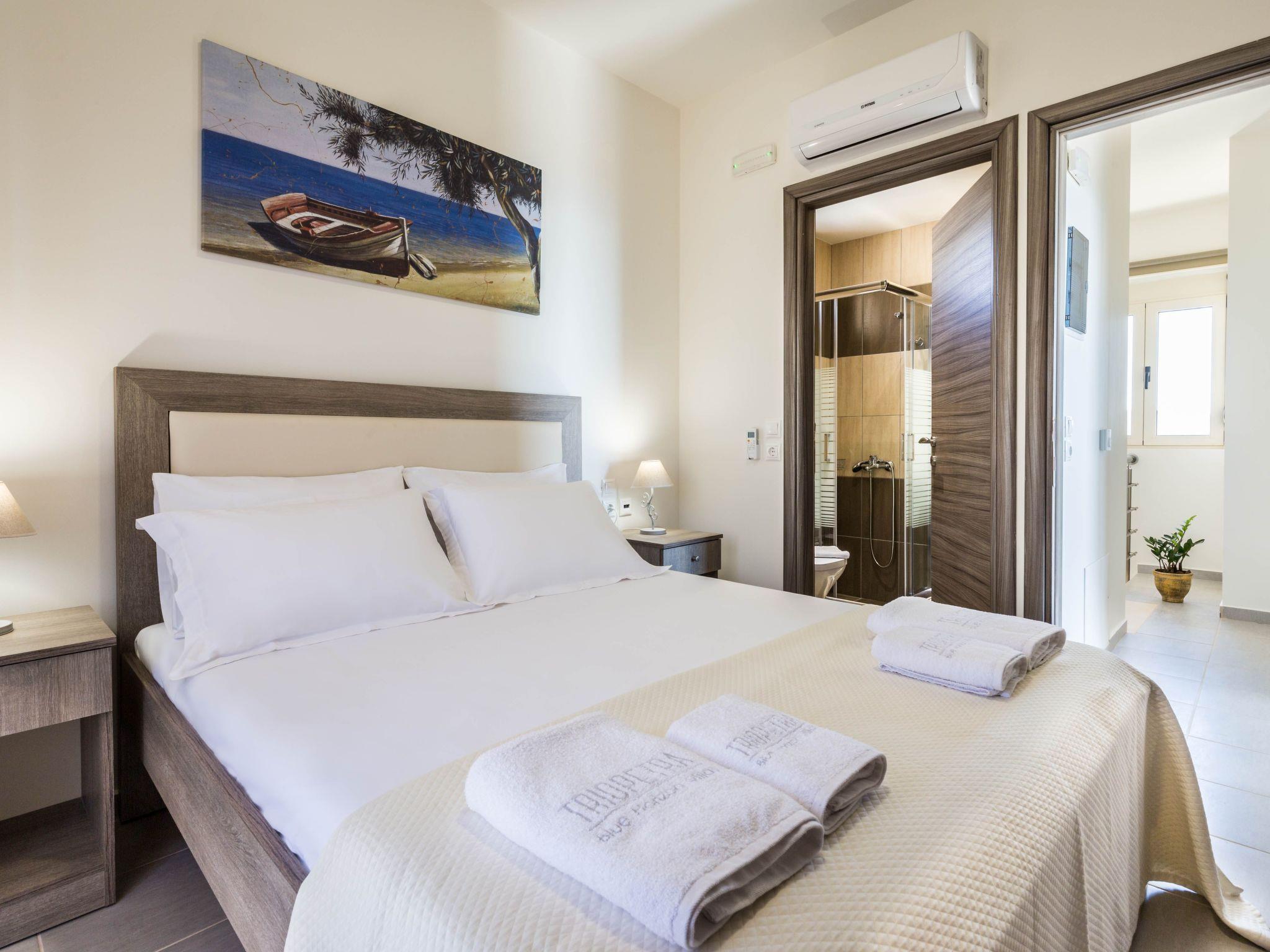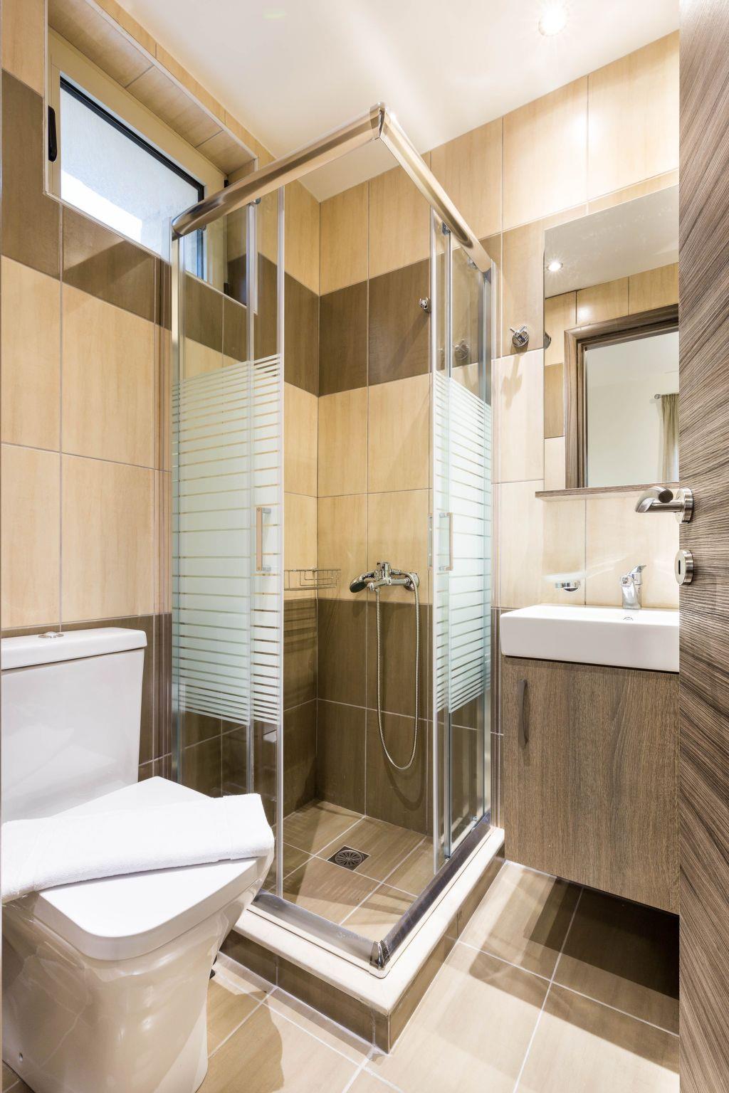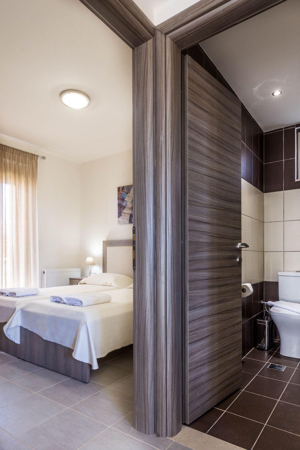 Floors LayoutGround floor: Ground floor: One bedroom with two single beds, Living room: sofa-bed + single bed sliding under sofa, kitchen with dining area, 1 communal wc- shower with closed glass cabinFirst floor:Two bedrooms with a double bed each, 2 ensuite bathrooms (an interior in each bedroom - shower with closed glass cabin, each)