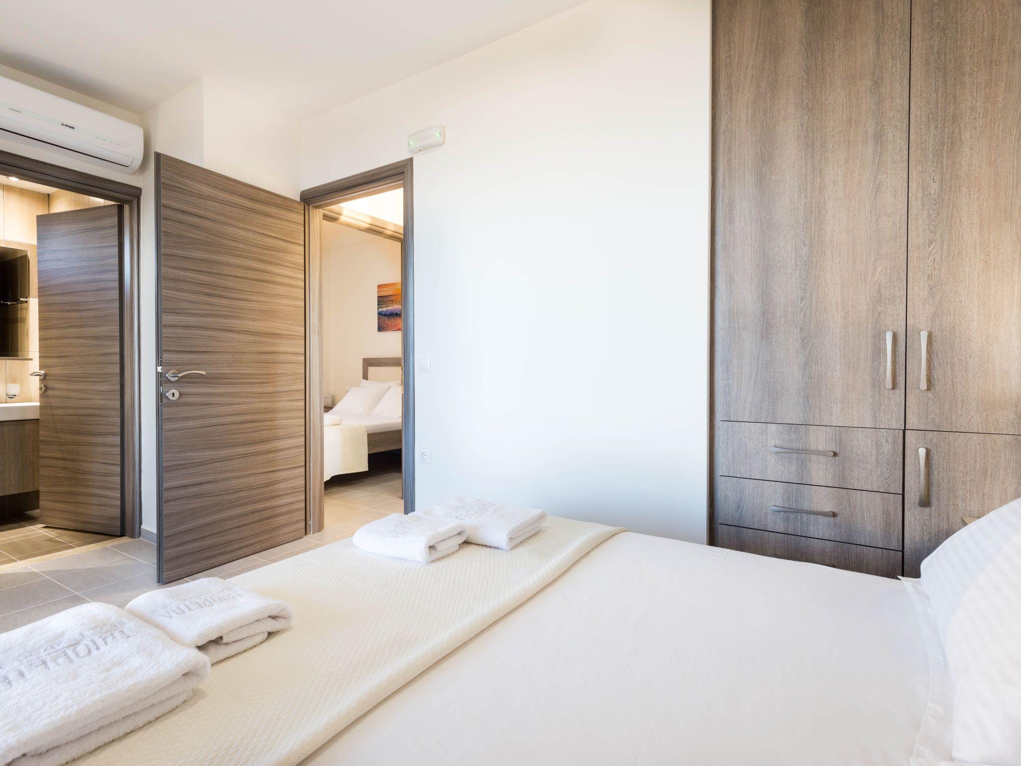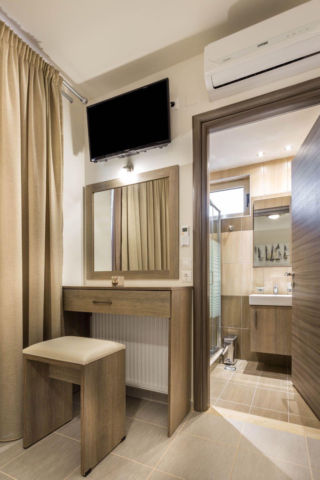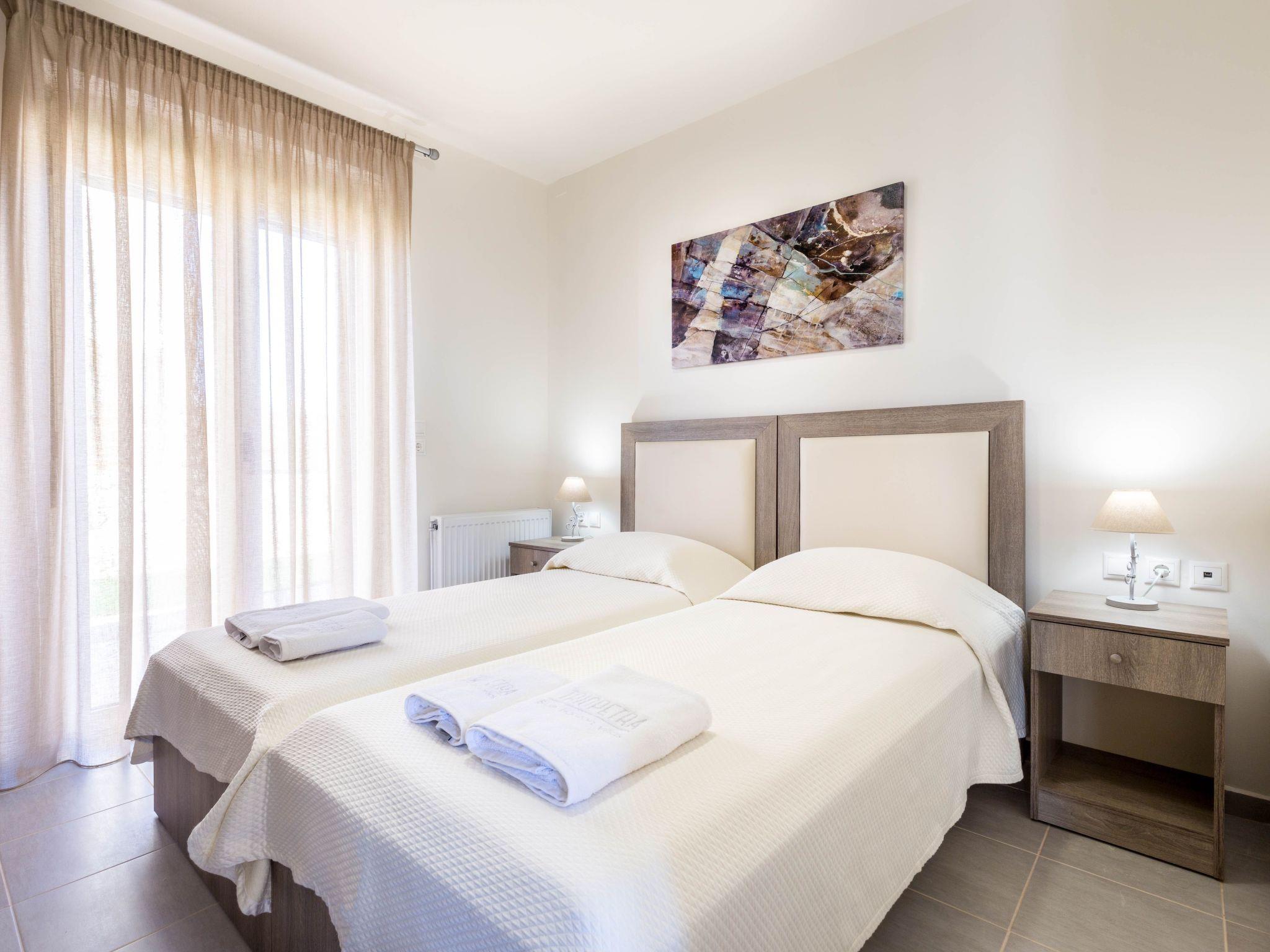 Floors LayoutGround floor: Ground floor: One bedroom with two single beds, Living room: sofa-bed + single bed sliding under sofa, kitchen with dining area, 1 communal wc- shower with closed glass cabinFirst floor:Two bedrooms with a double bed each, 2 ensuite bathrooms (an interior in each bedroom - shower with closed glass cabin, each)
