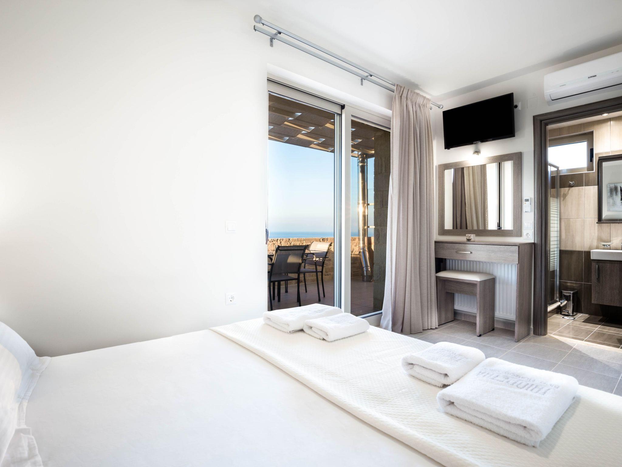 The villa is at the heart of this complex. It is a two-story house with an internal staircase (maisonette), offering unforgettable accommodation for 8 people. On the ground floor is a bedroom with twin beds, and a fully equipped kitchen with a dining area, living room, and WC. The double glazed door gives access to the veranda and swimming pool area. On the 1st level, two comfortable bedrooms with a double bed, WC, and verandas with endless views. The rooms are fully furnished and decorated with exceptional and stylish designs with an emphasis on luxury and functionality. Amenities such as fast VDSL WI-FI internet, air conditioning, heating, and full HD Satellite smart TV will make your accommodation feel more like home. Every bedroom has a double bed and two bedside tables, a dressing table, and wardrobes. The kitchenware is fully equipped with all modern appliances such as a coffee maker (Nespresso machine is also included), kettle, toaster, juicer, mini chopper, mixer, dishwasher, refrigerator with freezer, washer/dryer and oven with ceramic hob. The large dining tables with comfortable chairs are perfect for a family or convivial dinner. The stylish living area offers a lounge, dining area, fireplace, TV, micro stereo system, WI-FI internet access, and telephone. There is also a corner sofa bed and coffee table. Steamers, vacuum cleaners, and strollers are also available. In all bathrooms, there is a feel-good shower with a glass cabin, a hair dryer, a full set of toiletries, and storage spaces to store away your belongings. Stone-built Villa Triopetra BlueHorizon Lefkopetra with adults & kids private pool, close to all the famous beaches in South Rethymnon