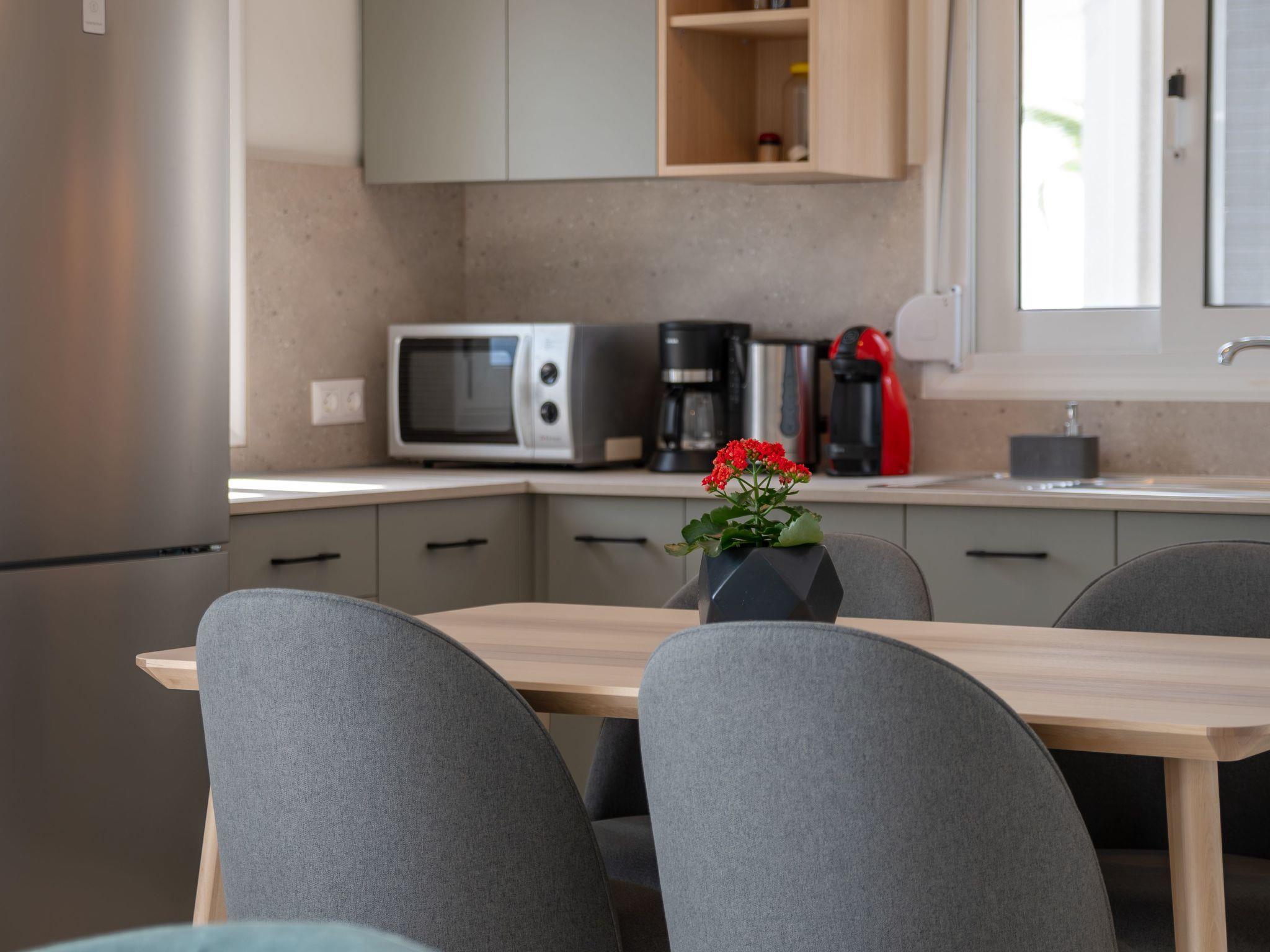 The kitchen is fully equipped with everything you need, from an oven and microwave to a dishwasher. Also on the ground floor is a bathroom with a walk-in shower and washing machine.