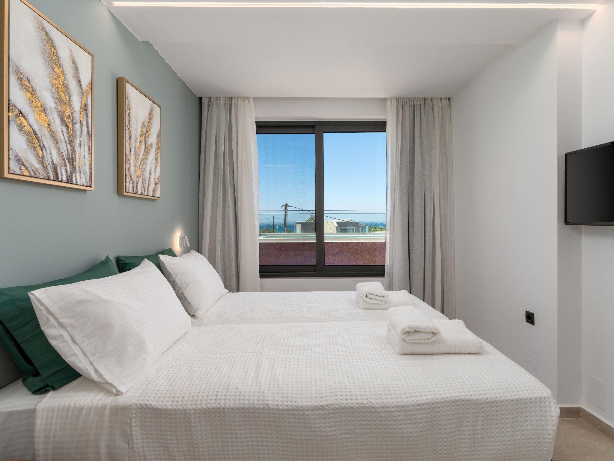 Upstairs, the master bedroom offers a double bed, a private balcony with sea views, an ensuite bathroom, and a satellite TV. The second bedroom has twin beds, its own ensuite, and satellite TV, making it ideal for friends or children. Additionally, foldable beds provide flexibility for larger groups or families.