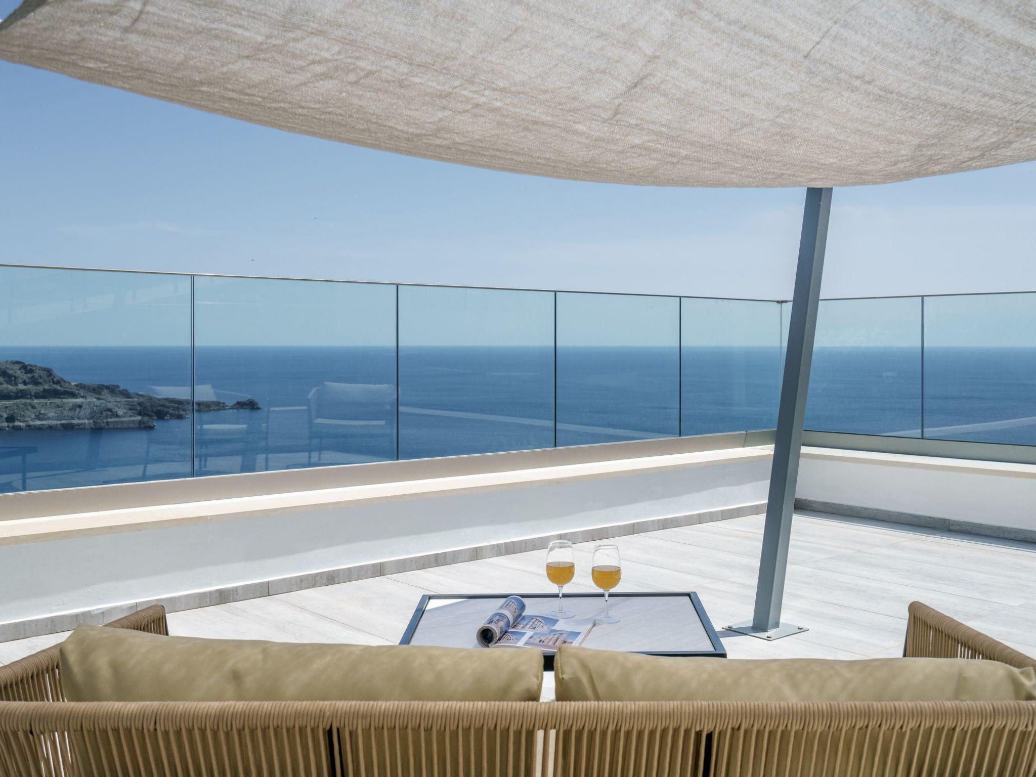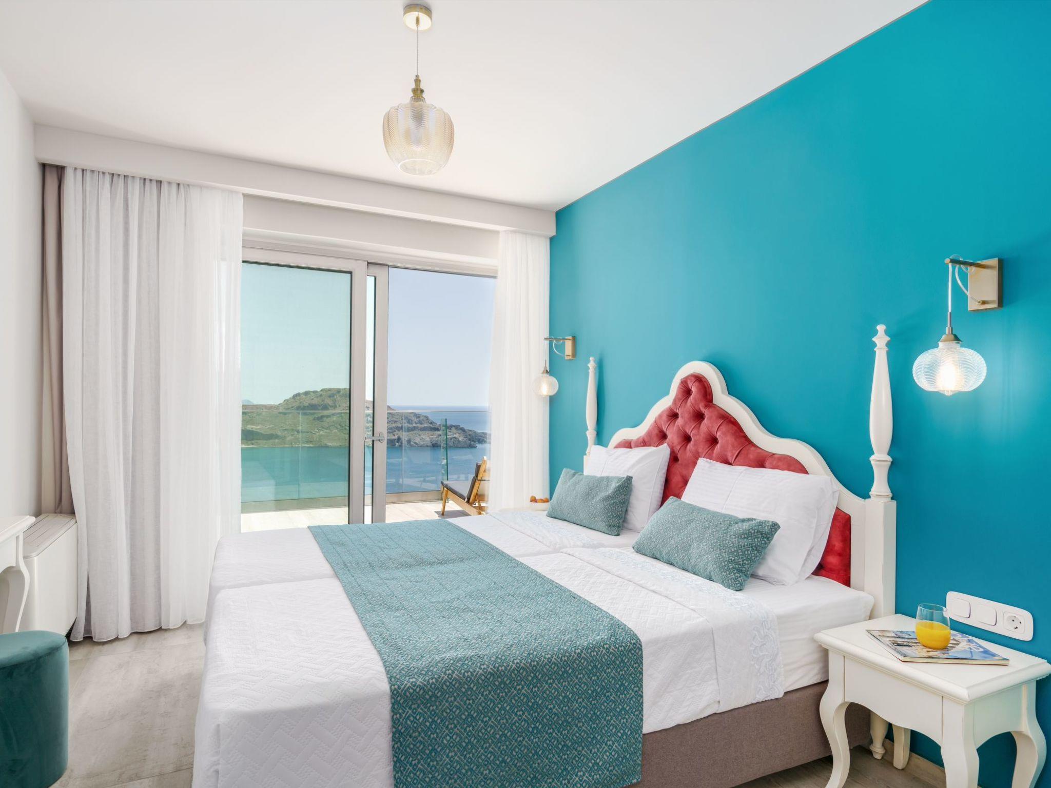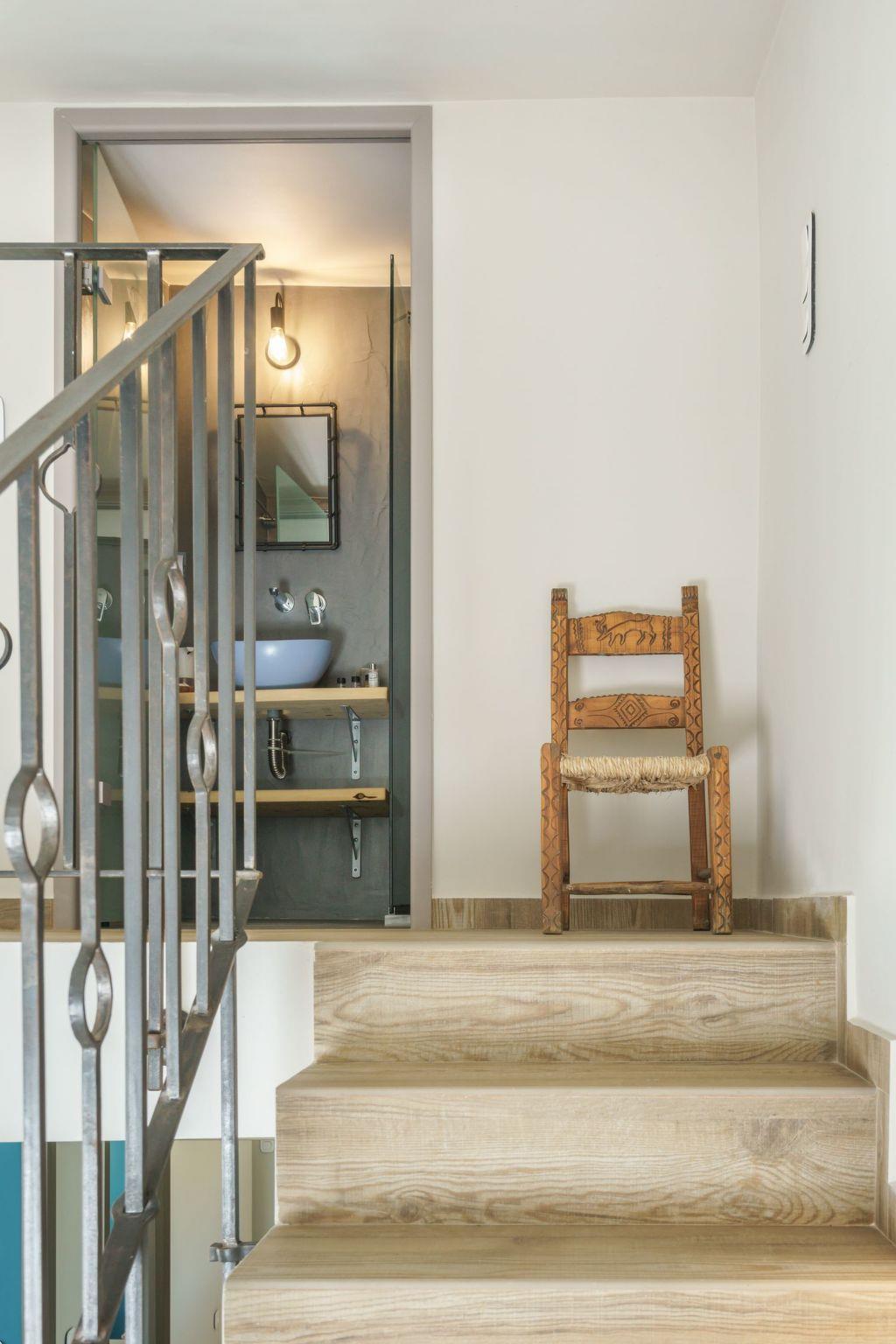 The villa includes two beautifully furnished double bedrooms, each with satellite TV and terrace access that offers breathtaking sea views. Modern bathrooms are equipped with hair dryers, toiletries, and plush towels for added comfort. The 2nd-floor loft houses the villa's second bathroom and additional bedding for a fifth guest, while modern heat pumps provide eco-friendly temperature control.
