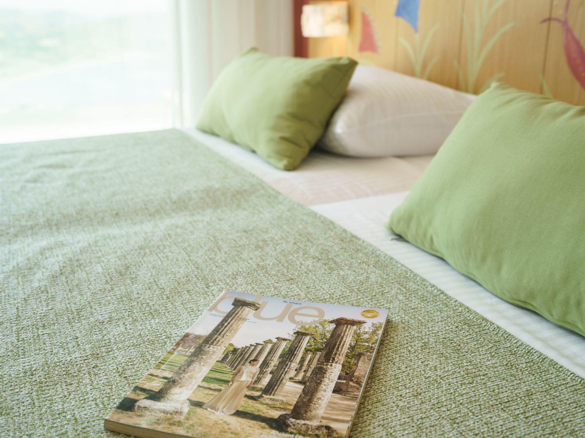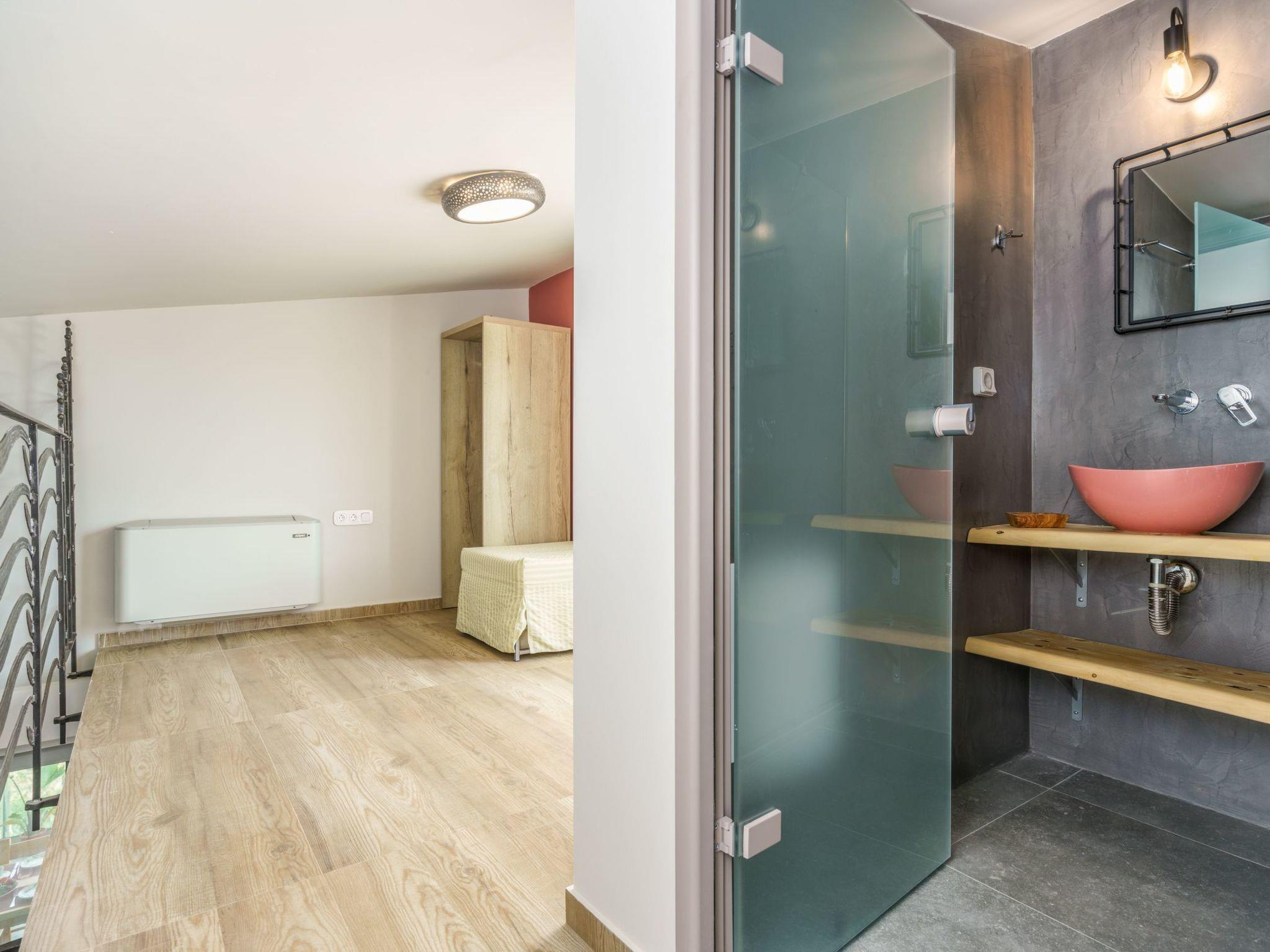 The villa includes two beautifully designed double bedrooms, each equipped with satellite TV. An additional sleeping space and bedding for a fifth guest are available in the loft, where the second bathroom is located. Both bathrooms are well-appointed with amenities such as hair dryers, toiletries, and ample towels. The villa is equipped with heat pumps instead of air-conditioning, ensuring environmentally friendly temperature control.
