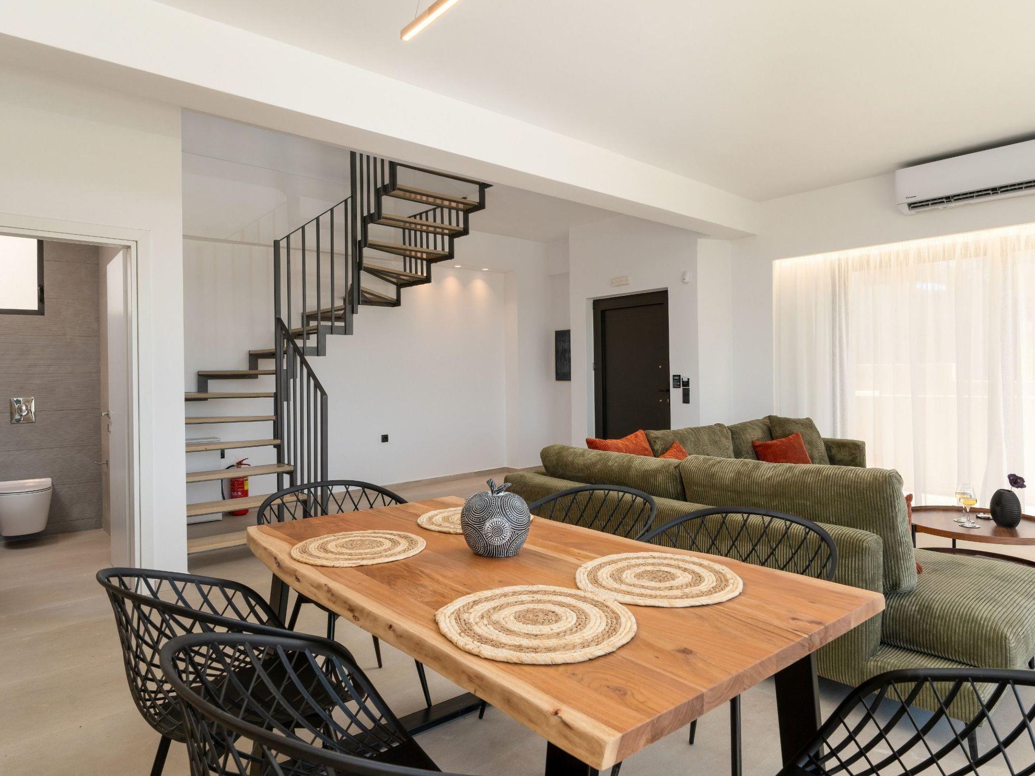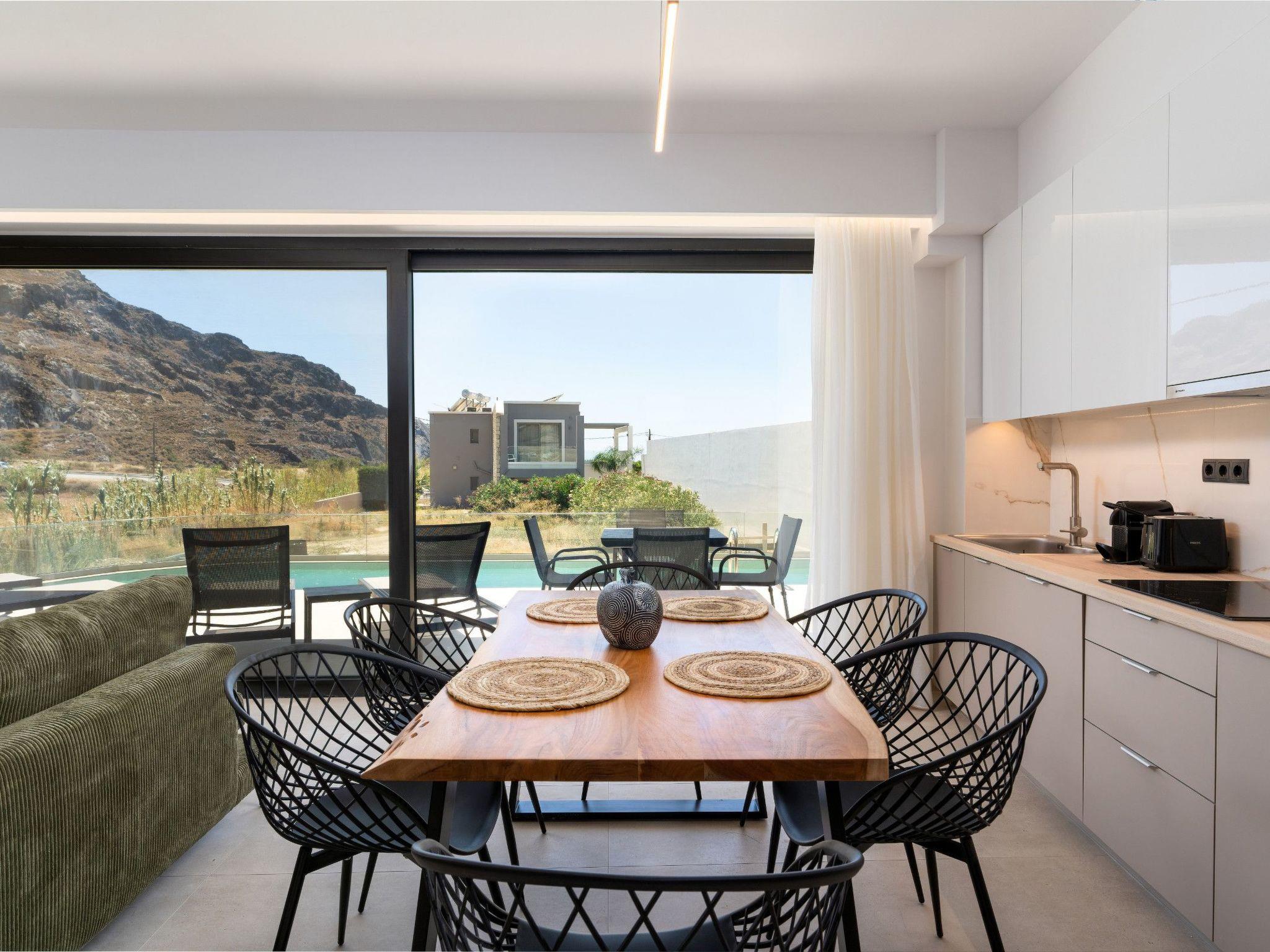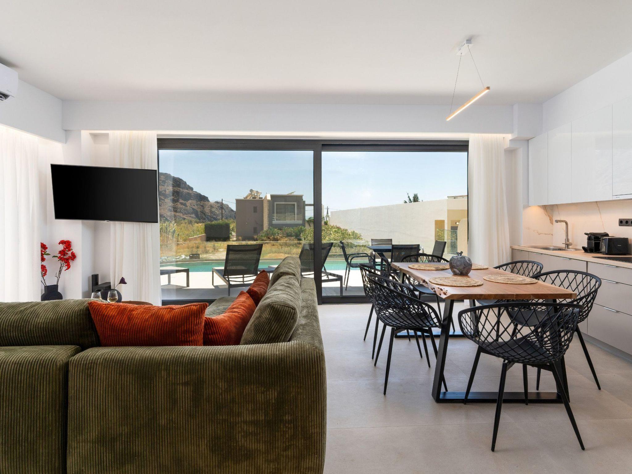 Inside, the villa offers an open-plan living area with plush seating, air conditioning, a 55" Smart HDTV with satellite channels, and a Bluetooth stereo for music lovers. The modern, fully equipped kitchen includes everything needed for a self-catered stay, from morning coffee to evening feasts enjoyed on the terrace under the Cretan stars.