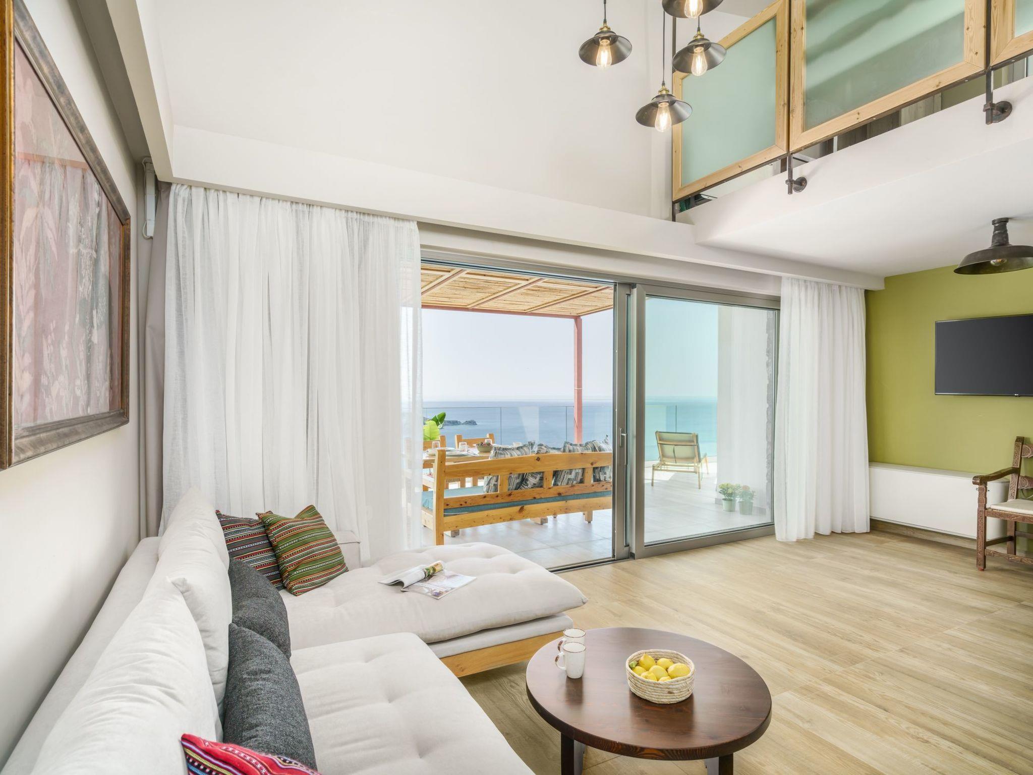 Part of the Ikones Kritis ("Vistas of Crete") three-building complex, Paradosiako ("Traditional") boasts a spacious living room with elegant furnishings and a cozy ambiance, perfect for unwinding after a day of exploration. The adjacent fully equipped kitchen features modern appliances like a stove, oven, dishwasher, and espresso machine, ideal for preparing gourmet meals to enjoy in the welcoming dining area. Guests are greeted with a thoughtful welcome pack, and cleaning and laundry services ensure a hassle-free stay.