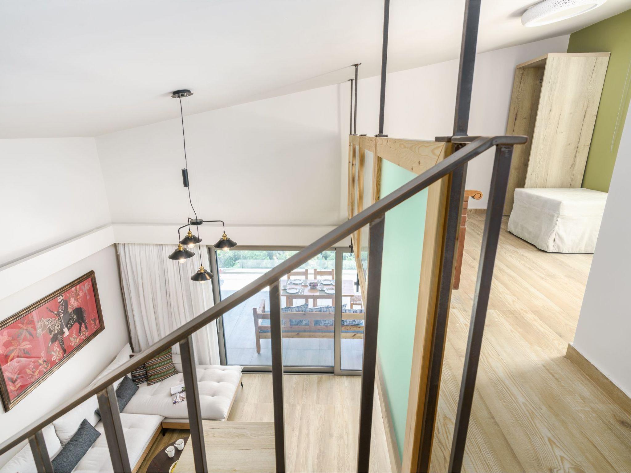 The villa offers two beautifully appointed double bedrooms, each with satellite TV and terrace access, providing tranquil views of the sea and surrounding landscape. Modern bathrooms come with hair dryers, toiletries, and plush towels for added comfort. The second-floor loft space includes the second bathroom and can accommodate extra bedding for a fifth guest if necessary. The villa uses heat pumps to sustainably regulate temperatures.
