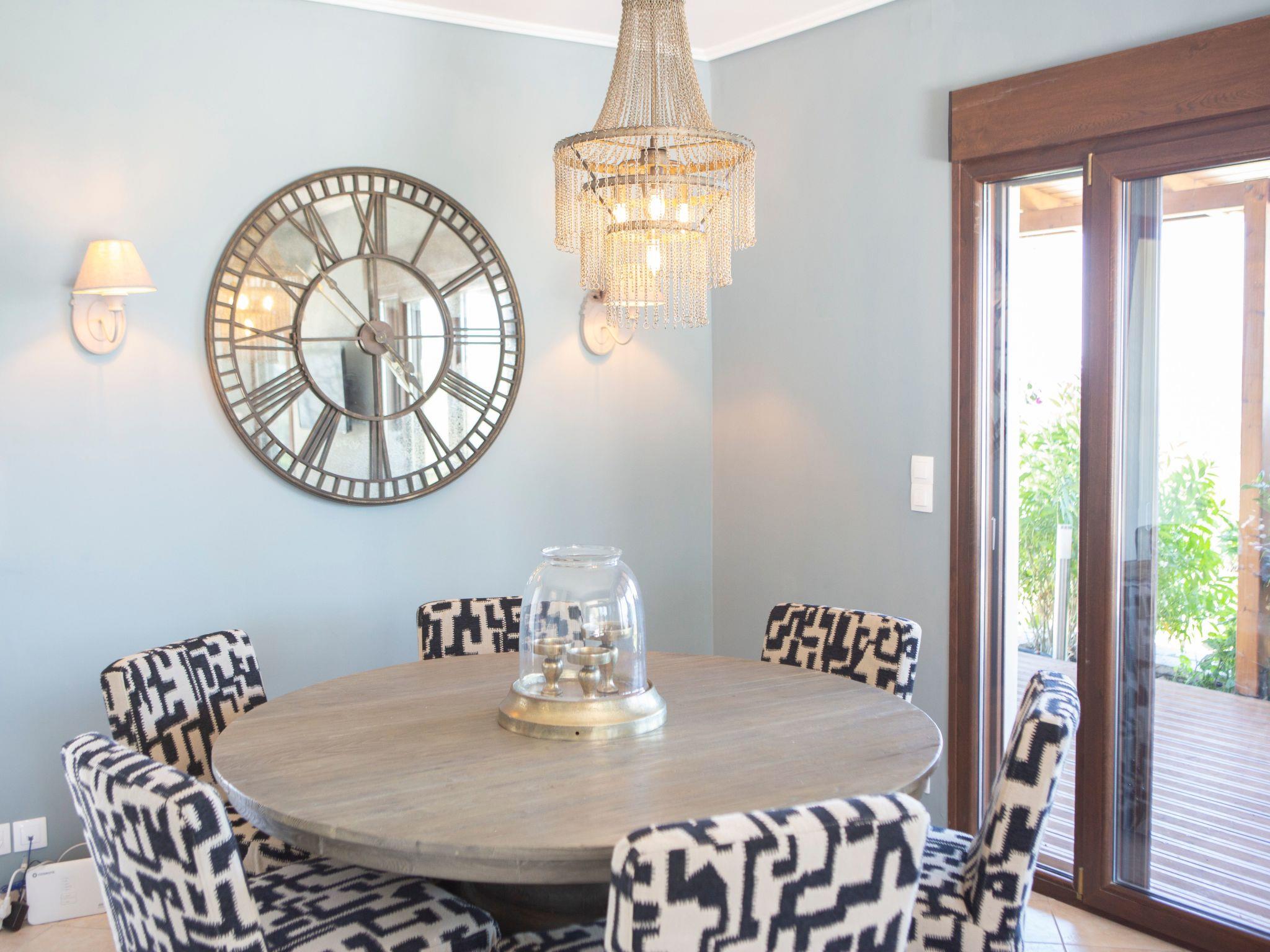 The exterior of Villa Artemis is as impressive as its interior, sprawling across one acre of lush land. A shady terrace invites guests to unwind, while the beautiful lawn and BBQ area are perfect for alfresco dining and socializing under the Greek sun. The kiosk and outdoor furniture complete the setting, creating an idyllic outdoor living space that encourages relaxation and communion with nature.