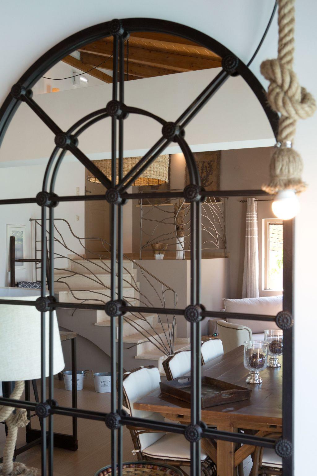 A few steps, adorned with ornate railings, lead into a spacious open plan dining room and fully equipped kitchen area. The combination of metal and wood of the furnishing, the impressive light fittings made out of thick ship rope along with the light floaty curtains bring the Mediterranean feeling into the villa.