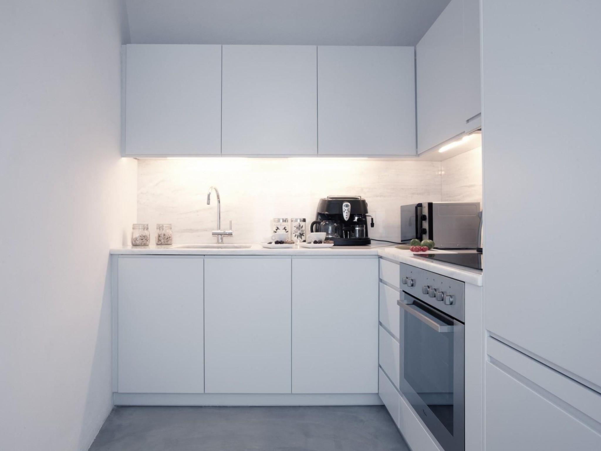 The generously proportioned 120m² villa was originally built in the year 1900 and was completely renovated in 2013, ensuring that authentic features of the cubed form of Cycladian architecture were combined with modern amenities carefully and tastefully. In the interior of the ground-level, fully air-conditioning (cooling and heating) holiday villa, modern furniture enhances the elegant, sleek and cool style. It has a living room flooded with daylight, a very modern, white and glossy built-in kitchen, two bedrooms and two spacious bathrooms. The living room provides two comfortable designer sofas, wooden coffee tables, a wide LED 3D Smart flatscreen TV set into the wall, with cable and satellite channels, a USB port, a DVD and BluRay player, as well as a safe for your valuables. Next to it, the separate kitchen has only the latest appliances, including a ceramic hob and extractor fan, an electric oven, a fridge with a freezer compartment, microwave, toaster, kettle and coffee machine. One of the two bedrooms has a double bed measuring 160 x 200cm and a desk corner, while the second bedroom has a double bed measuring 140 x 200cm. The beds provide eco-mattresses that adapt optimally to the body and both bedrooms also have bedside tables with reading lamps and wardrobes with ample storage space for your clothing and luggage. The two sofas in the living room can be converted into two additional single beds (each 80 x 200cm, also with anatomical eco-mattresses) for two further people. Of the two very spacious bathrooms, one has a bath with a shower attachment and one has a walk-in shower, while both have washbasins with wide wall mirrors, hairdryers, free toiletries and toilets. A cot is available (children under 5 years of age stay free of charge) and plenty of bed linen and towels are provided. The rooms are cleaned daily and the reliable wireless Internet connection in the villa can be used free of charge.