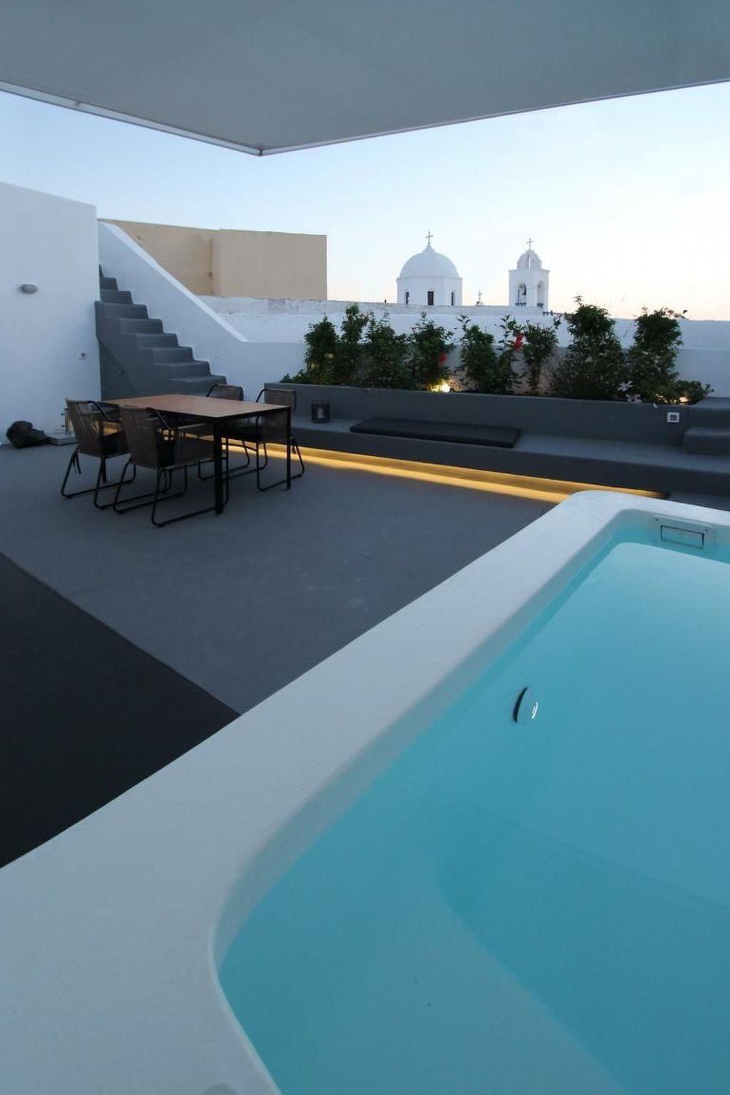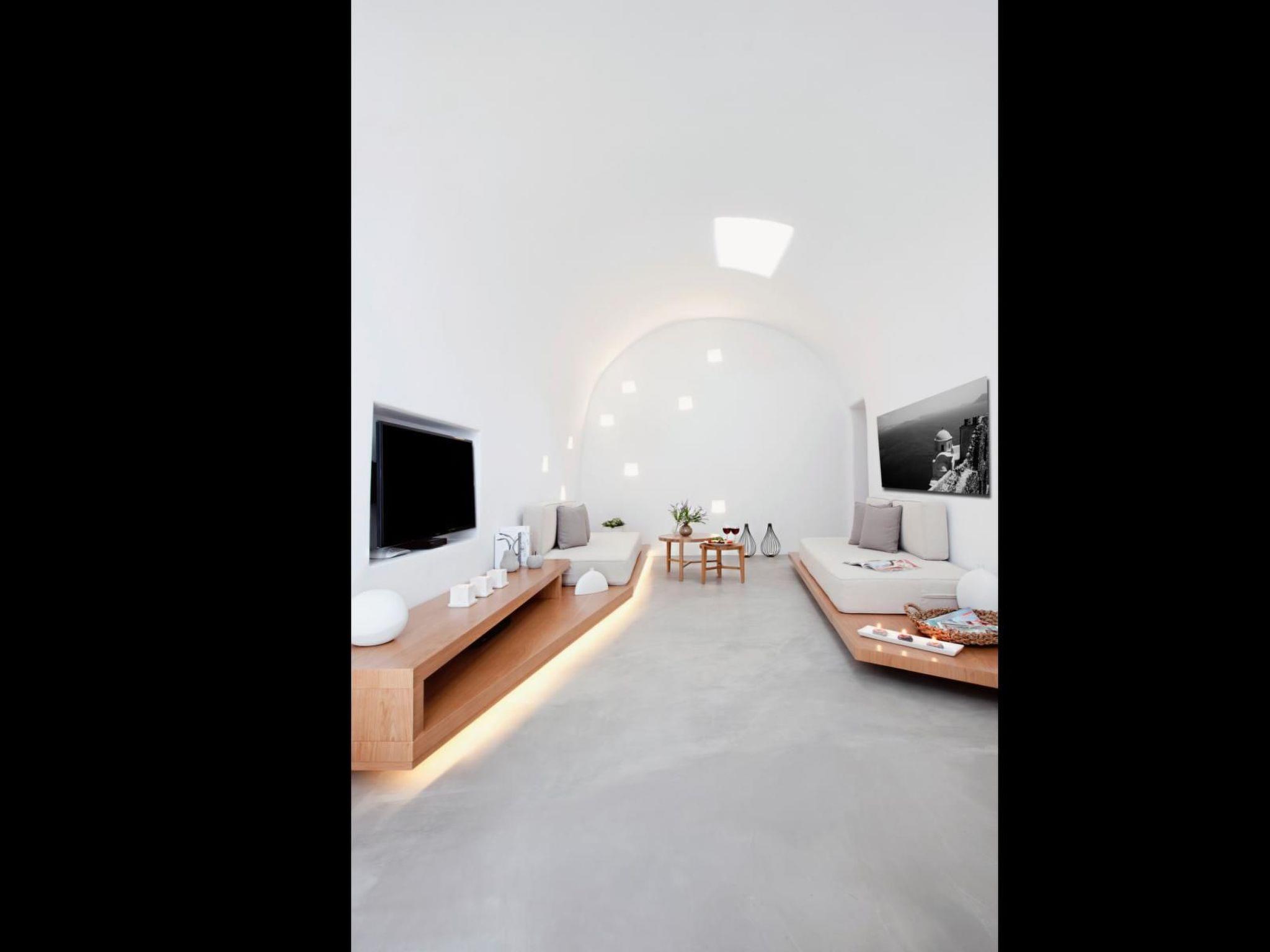 This brilliantly white, newly renovated holiday villa is in the peaceful, picturesque little village of Megalochori in the south of the rocky, sunny island of Santorini in the Greek Aegean and invites you to relax in luxurious surroundings and in absolute privacy, enjoying plenty of sun, sea and Greek hospitality.White luxury holiday villa, newly renovated in 2013, enclosed and very modern, with a private, illuminated outdoor Jacuzzi and an extensive panoramic view from the generous roof terrace