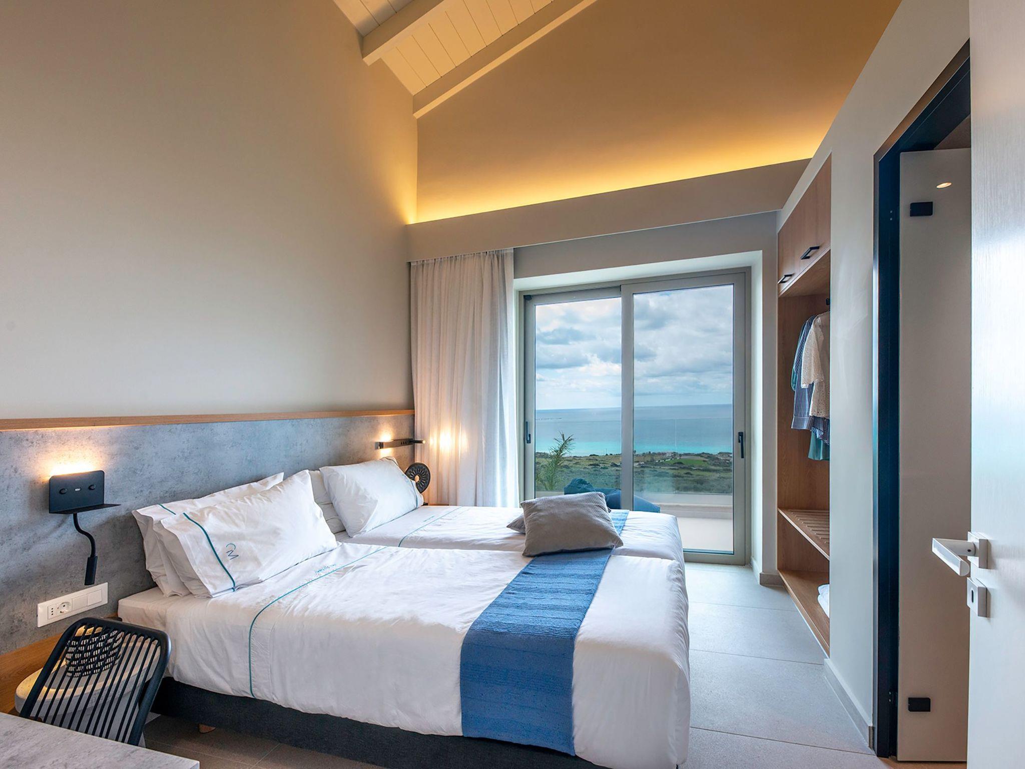 Villa Cielo is a two-story villa consisting of three bedrooms, two of them on the first floor one with twin beds with a sea view, and another double bed. The third bedroom on the ground floor has a king-size bed with a sea view. On the ground floor, there is a shared WC with a shower suitable for all the guests, and on the first floor 2 ensuite bathrooms with a shower. Luxury and modern design complete the scenery of contemporary architecture and high-quality products. Entering the villa on the ground floor you will find a spacious open area with a fully equipped contemporary kitchen that has branded appliances and facilities, making holiday cooking a most pleasurable experience. The area is completed with a dining room and a living room with a big flat-screen smart TV with satellite channels and an energy fireplace. The large windows create the illusion of transparency and provide a seamless transition between the indoor and outdoor areas.