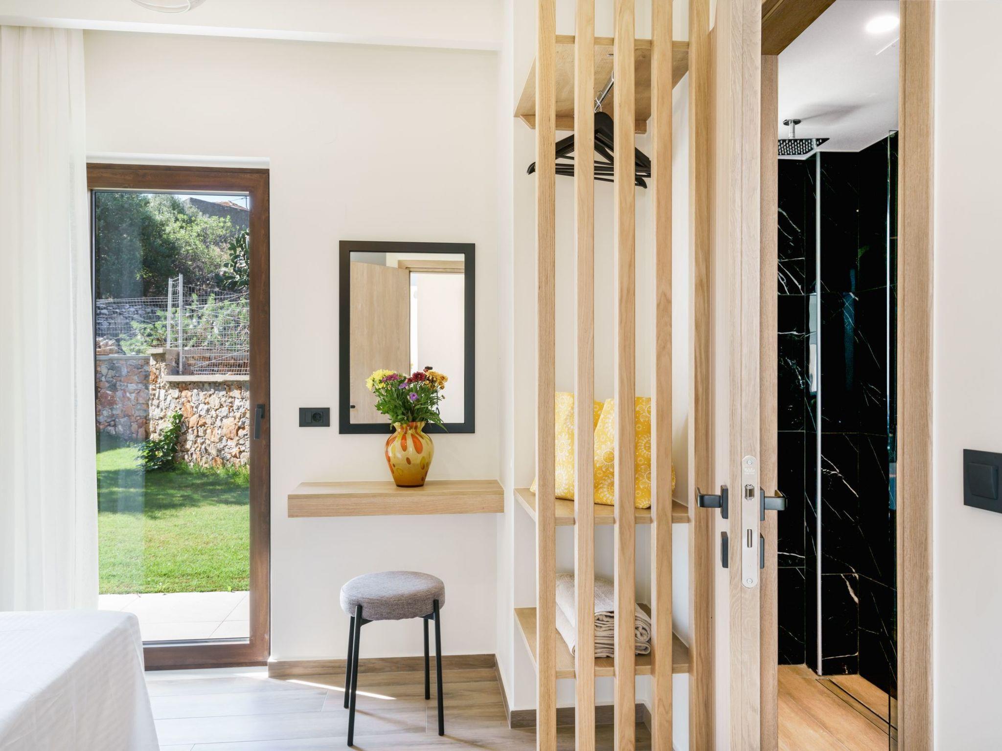 The ground level of Villa Alya features an open-plan living area, where guests can relax on a comfortable sofa while enjoying the 40’’ Smart TV with satellite channels or soaking in the sea view. Large sliding doors provide direct access to the pool terrace, making it easy to transition between indoor and outdoor living. The fully equipped kitchen is perfect for preparing meals, while the dining area for four offers an intimate setting for enjoying your creations.
