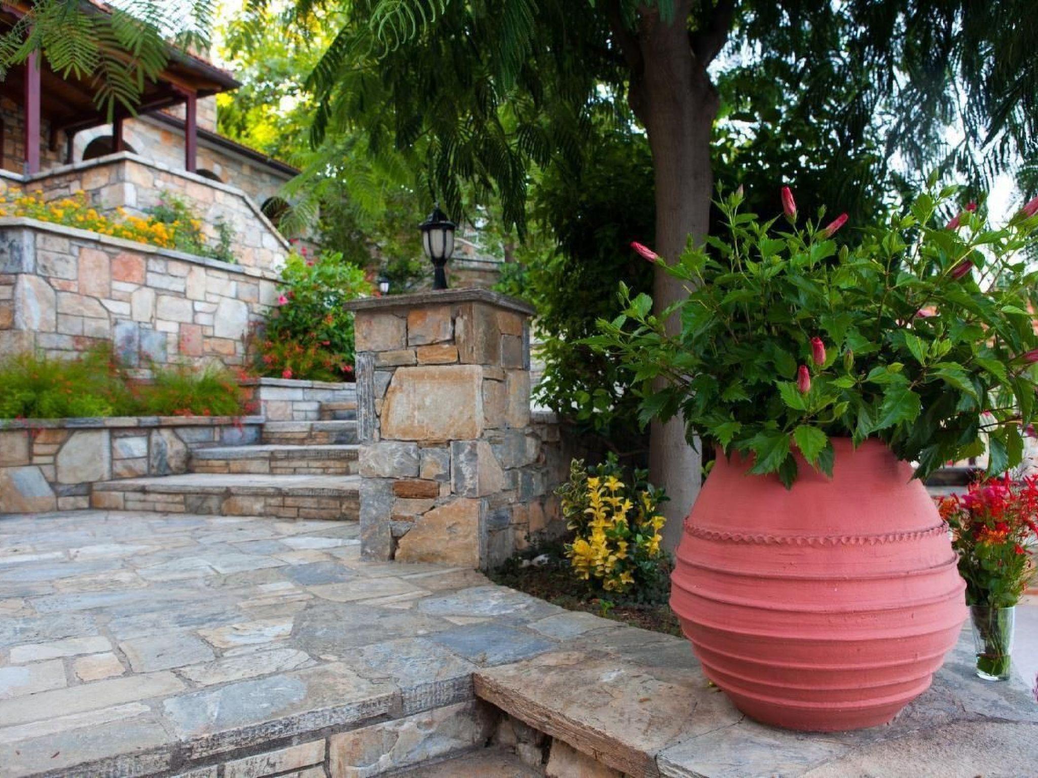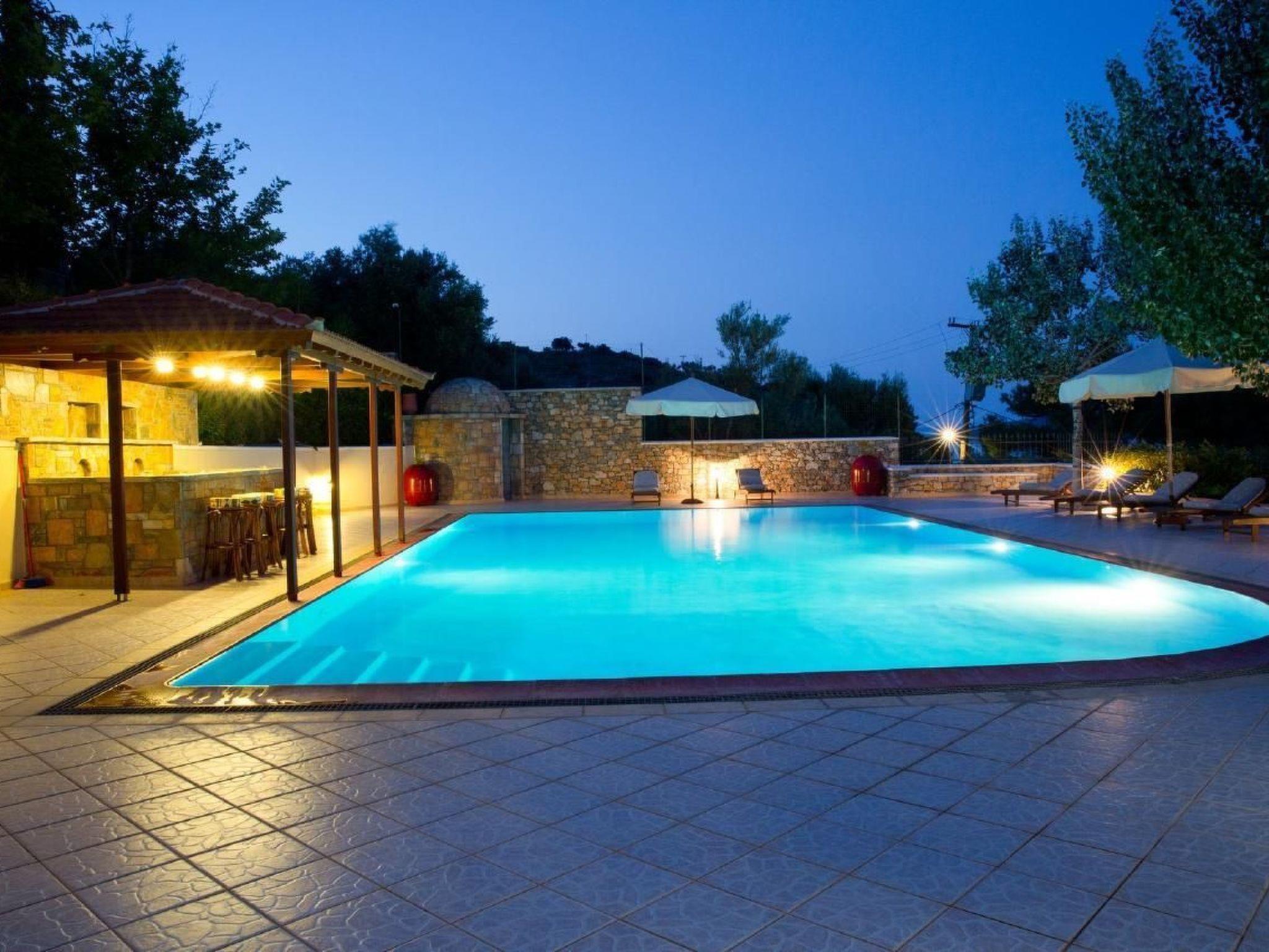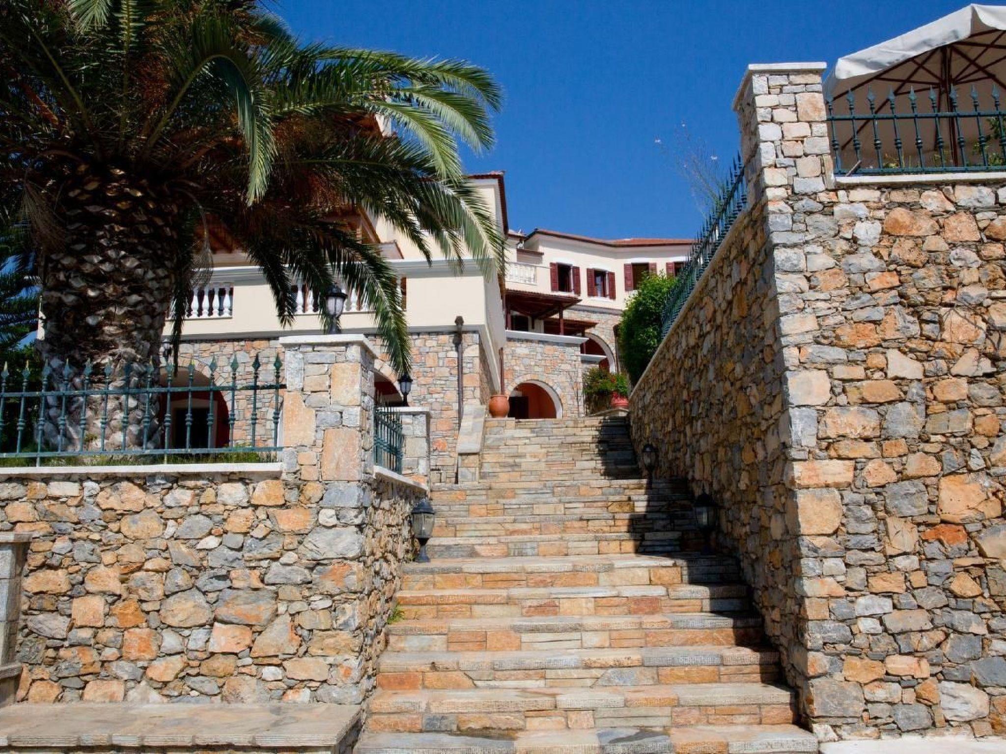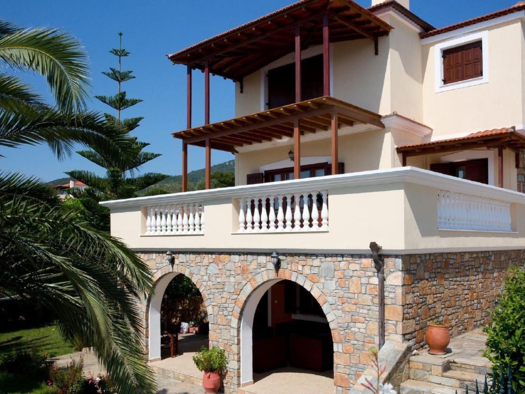 Arrive, swim, eat, swim again, relax, sleep and enjoy true vacations! Away from the noisy stressful city life, one's vacations are valuable, that's why we do our best to make you feel comfy and excited!120 sq.m of living area plus garden in front, can accommodate up to 6 adults in 3 separate double bedrooms. The villa offers: Fully equipped kitchen Living room area with dining table for 6 people A/C in every room and in common areas Daily cleaning service Swimming pool Pool bar Beach is in front of you, less than 1min on foot Private parking and BBQ area Free WiFi Once we meet in the port of Alonissos (Patitiri), we drive together to your villa Provide all necessary information regarding places of interest Bike/Car/Boat rental upon request Baby cot available upon request Ferry boat ticket issuance (roundtrip) upon request Ideal for those who seek peaceful vacations in a beautiful surrounding with olive and pine trees, away from the noisy city life. Stunning day rise views for families, couples, or groups of friends who will enjoy relaxing holidays in an unspoiled natural environment with direct access to the beach (1 min away) or its large swimming pool. The villa has 2 floors. The first floor where the main entrance of the villa is, consists of a large living room with sofas and a large dining table for 6 adults. The fireplace in the corner and the satellite TV with more than 100 international channels provide moments of relaxation and briefing. The same floor hosts a fully equipped kitchen with all the necessary amenities, from a hi-tech BOSCH oven & stove, microwaves, dishwasher, toaster, fridge to coffee appliances, cupboards and any kitchenware needed for the guests. The second floor comprises of 3 individual double king size bedrooms with 2 fully equipped bathrooms, with bathrobes, towels and hairdryers. Each bedroom has a private balcony offering view to the natural surrounding.Short descriptionOther : Non-smoking houseShort description 1Number of kitchens : 1SurroundingNearby sports facilities : Canoeing, Diving, Fishing, SurfingRental Facilities : Boat rental serviceGarden and outdoorGarden facilities : Garden furniture provided, GrillOn-site leisure facilities : Outdoor swimming pool shared use, Swimming poolService benefitsService facilities (may incur additional costs) : Cleaning service during your stay, Drinks service, House personnel