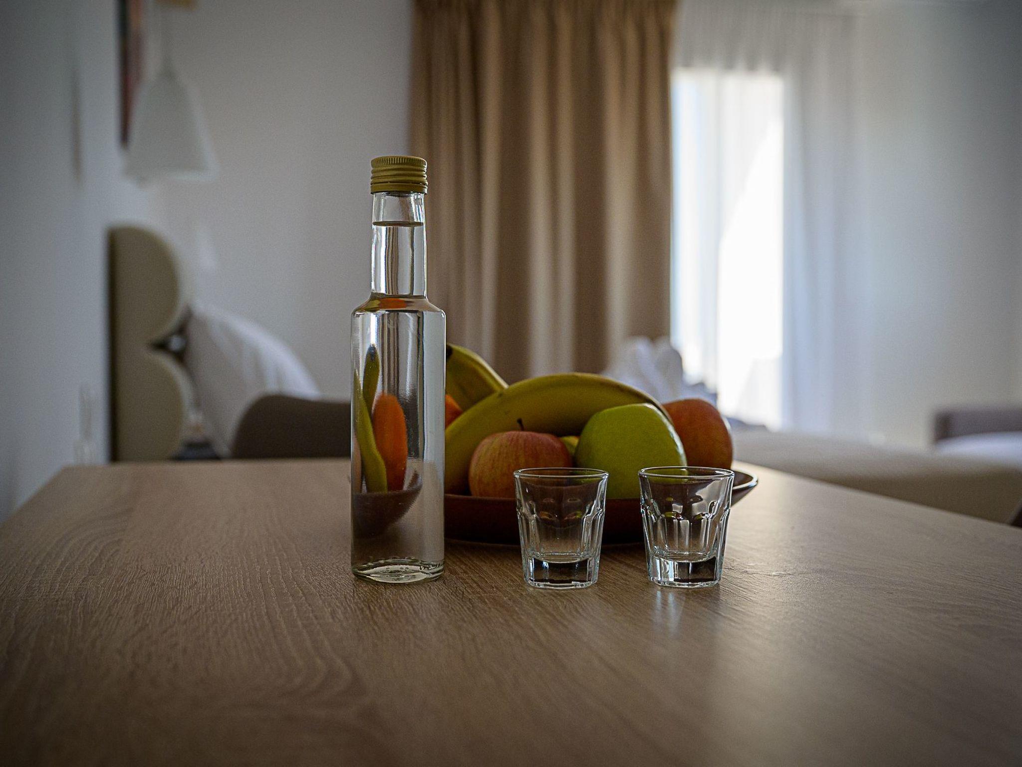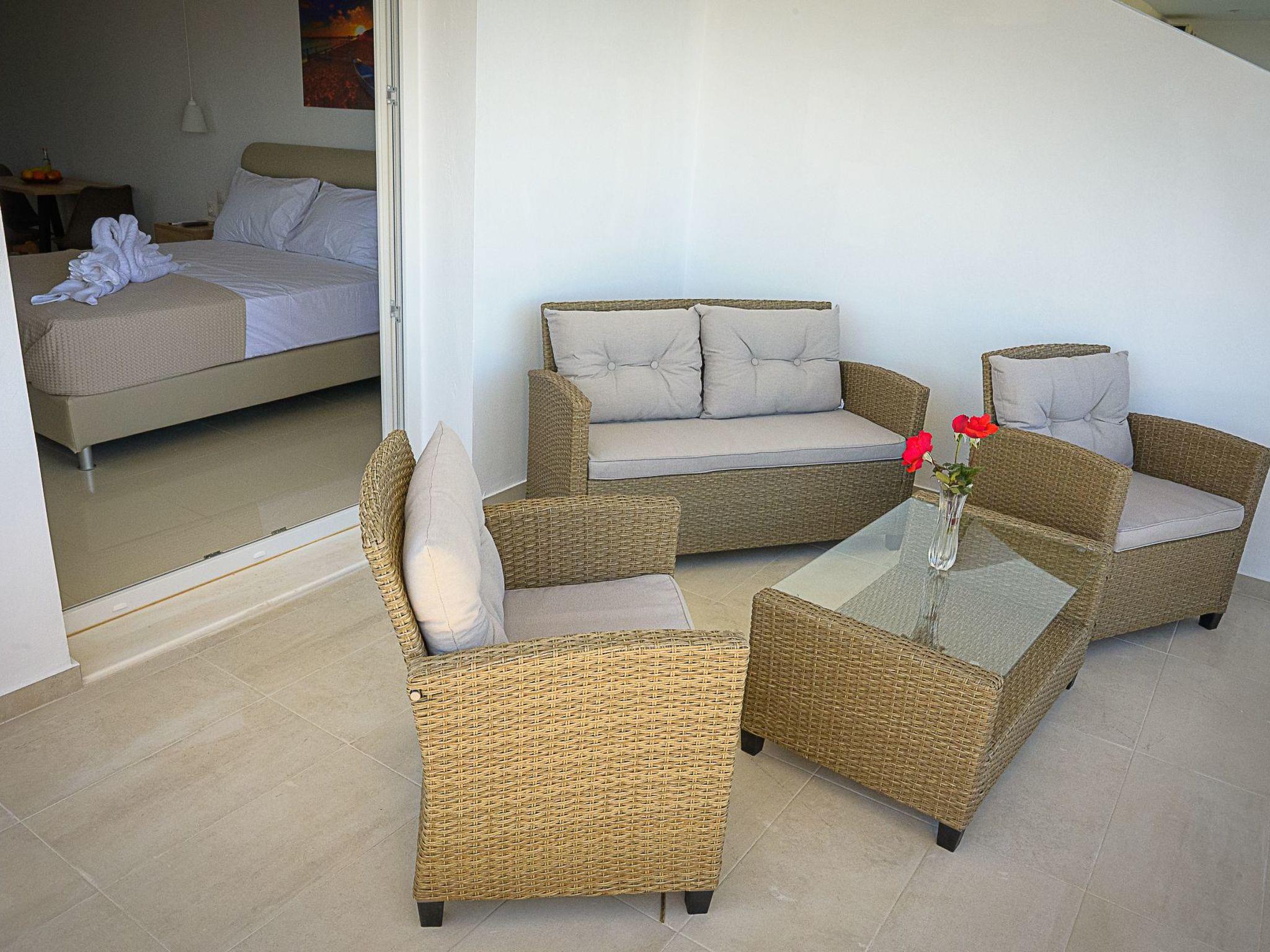 Stepping outside, guests are greeted with a private balcony or terrace, creating the perfect spot to relax and admire the stunning sea views or enjoy a quiet moment in the fresh air. Despite the focus on tranquility and privacy, guests are never too far from a refreshing swim, as they have access to the pool at the Blue Sky hotel, located approximately 700 meters away, available from the 1st of May.