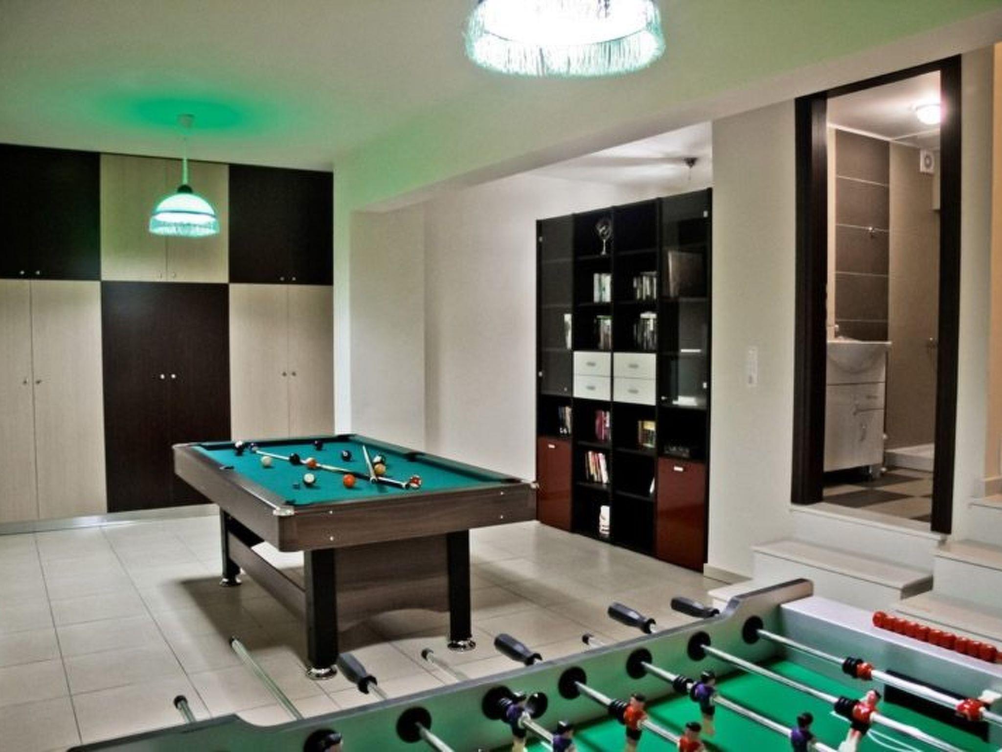Lower ground floor from the windows: table football and Billiards, library, safety Deposit box, one bedroom, WC with shower, washing machine and Ironing room.
