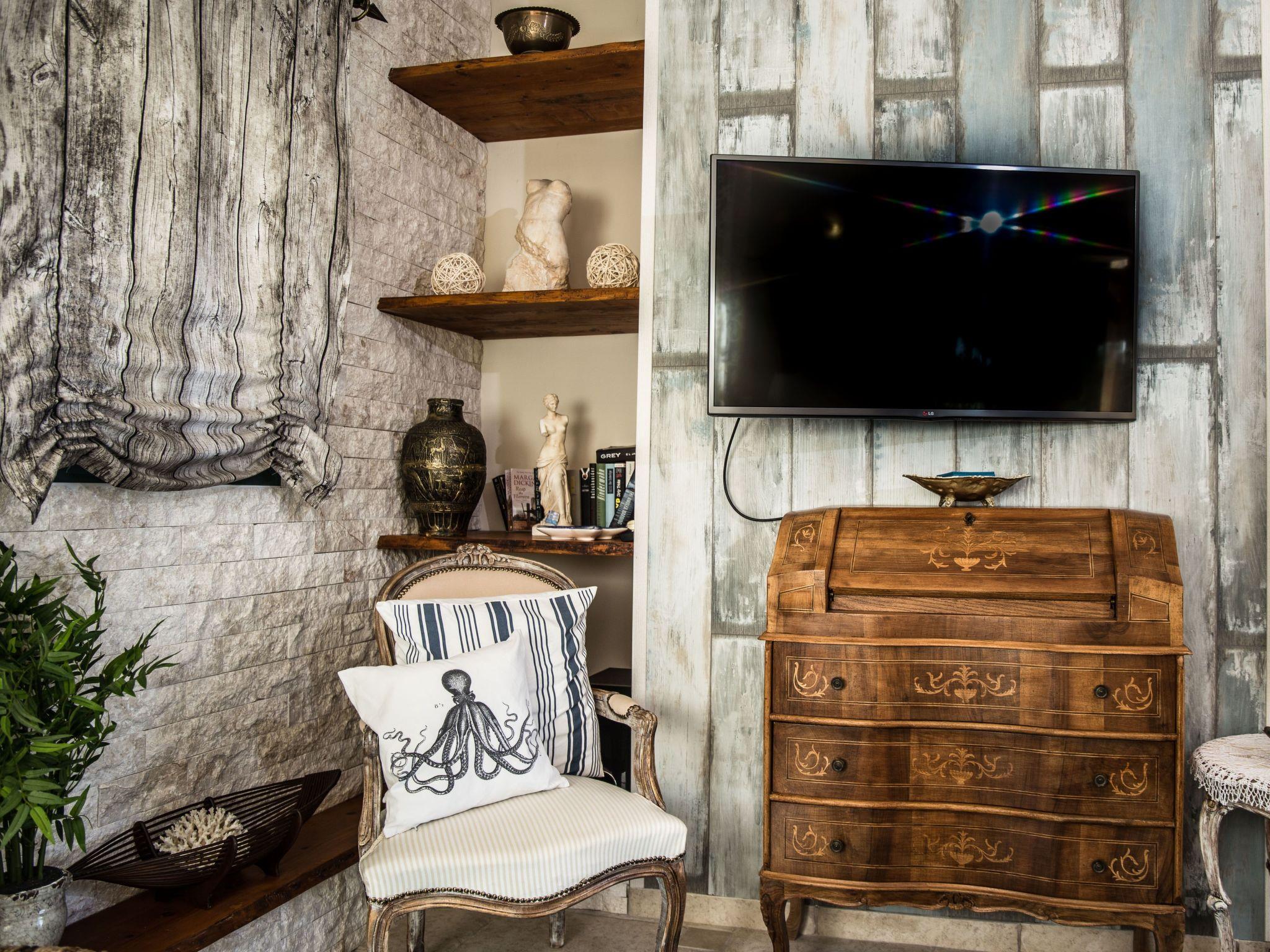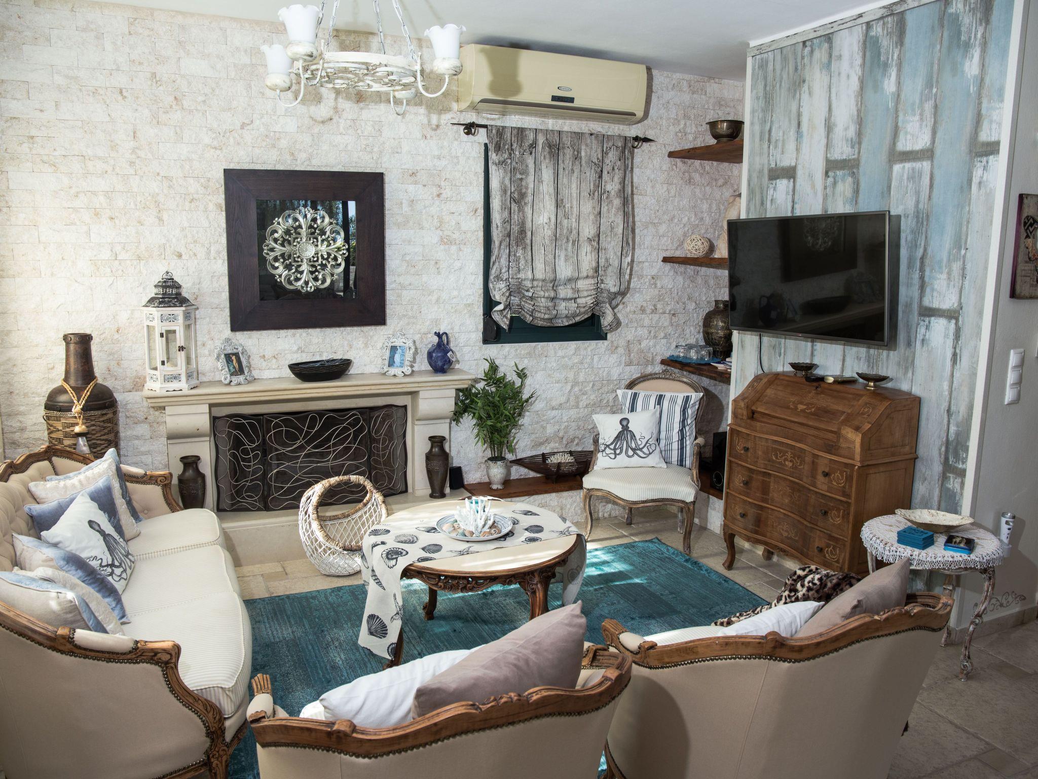 The house has two storeys and a basement. There are three bedrooms and a bathroom on the upper floor. On the ground floor there is a living room with an open-plan kitchen and fireplace as well as a shower room. The furnishings are bright and in a rustic vintage style. The kitchen is fully equipped and practical, with Smart TVs with satellite reception in the living room for the evening programme. Each bedroom and the living/dining room have air conditioning. Additional ceiling fans in the bedrooms ensure a pleasant climate.