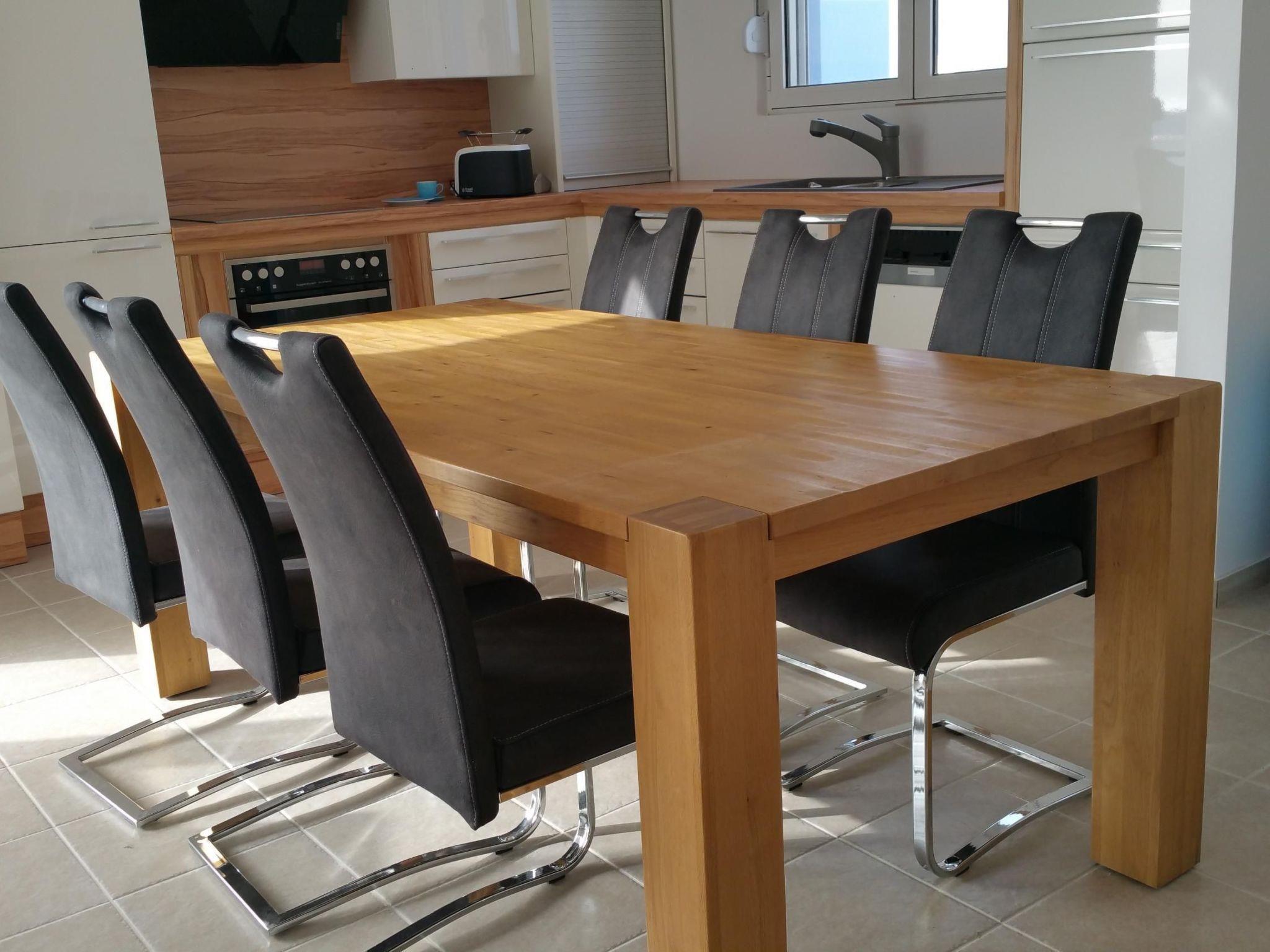 Inside, the house offers a comprehensive range of facilities. Two cosy bedrooms, each equipped with a double bed (180x200 cm) and independently adjustable air conditioning, promise restful nights. The house has two bathrooms, one with a WC and bathtub and the other with a WC and shower, providing comfort for all guests. The spacious kitchen not only offers modern appliances such as a large fridge/freezer, oven, ceramic hob, microwave, toaster, coffee machine, kettle and dishwasher, but also a dining table that seats up to six people. Relax in the living area with a cosy sofa and satellite TV.
