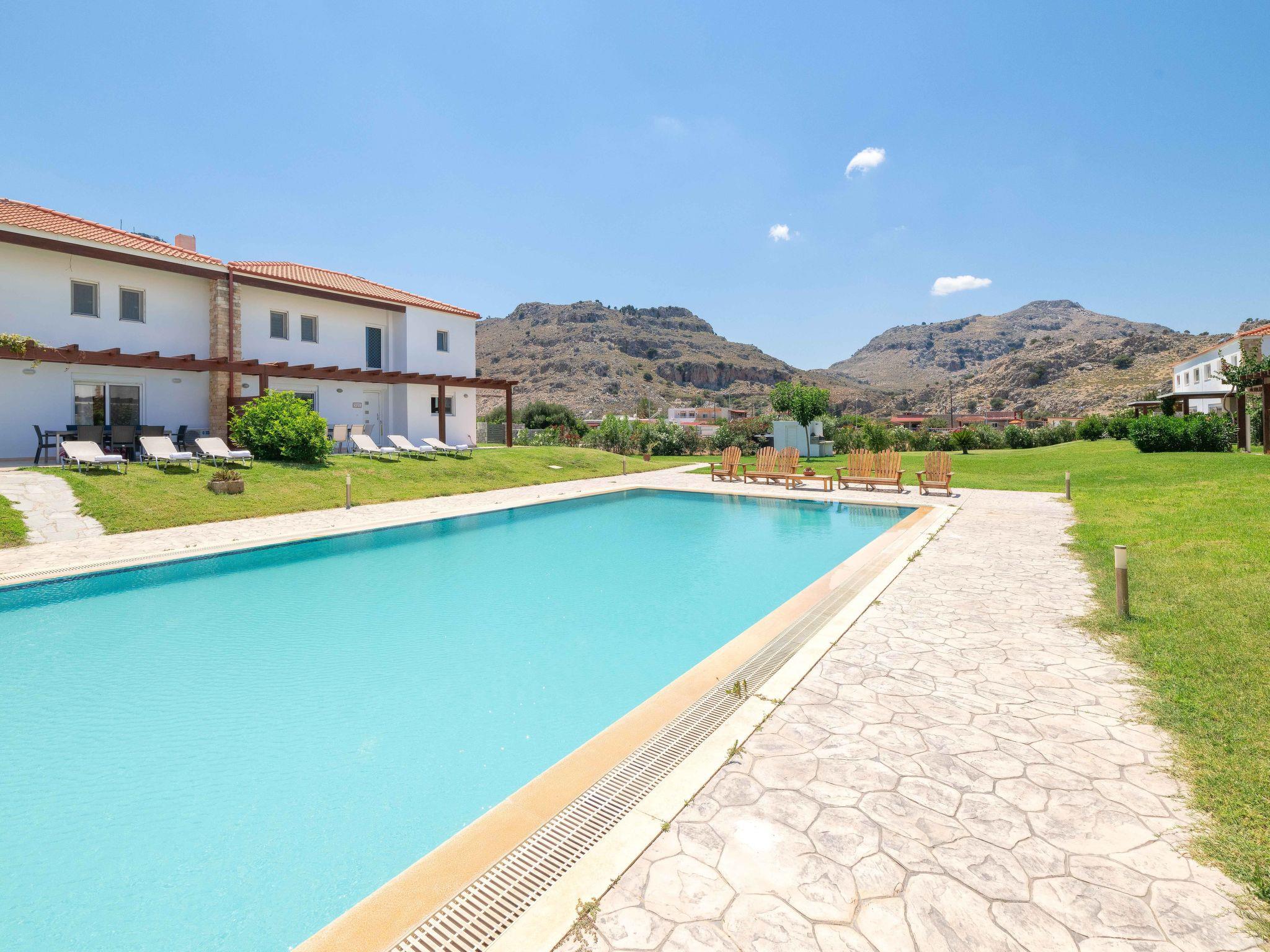 Is covered with grass, BBQ area, big common swimming pool and wonderful scenery over the mountains which are next to the sea!