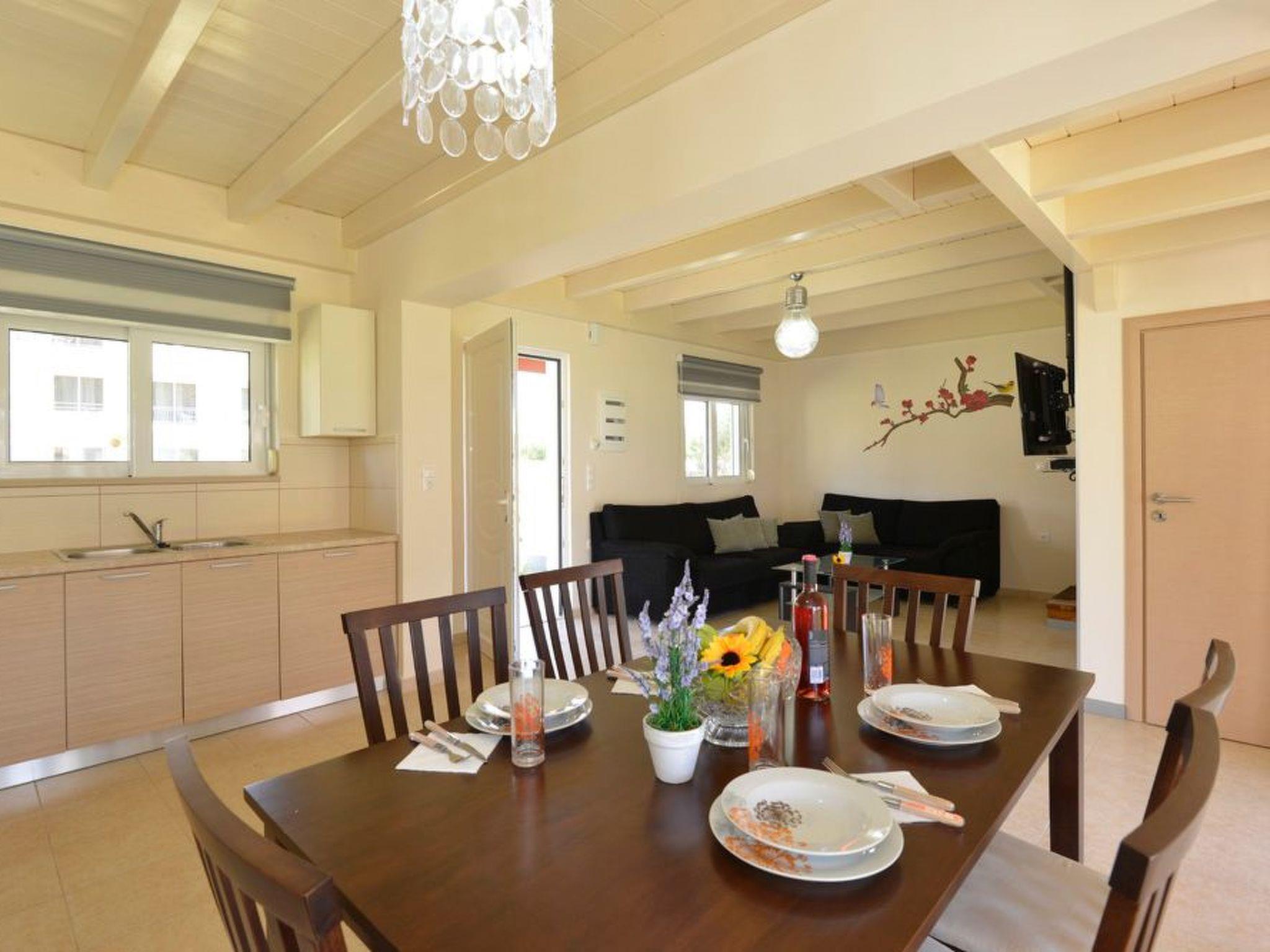 These modern Greek-style house is only 300m from the beach and with a beautiful view of the surrounding mountains. Cozy semi-detached house with modern comforts and a big common swimming pool. Everything you need is on a walking distance!