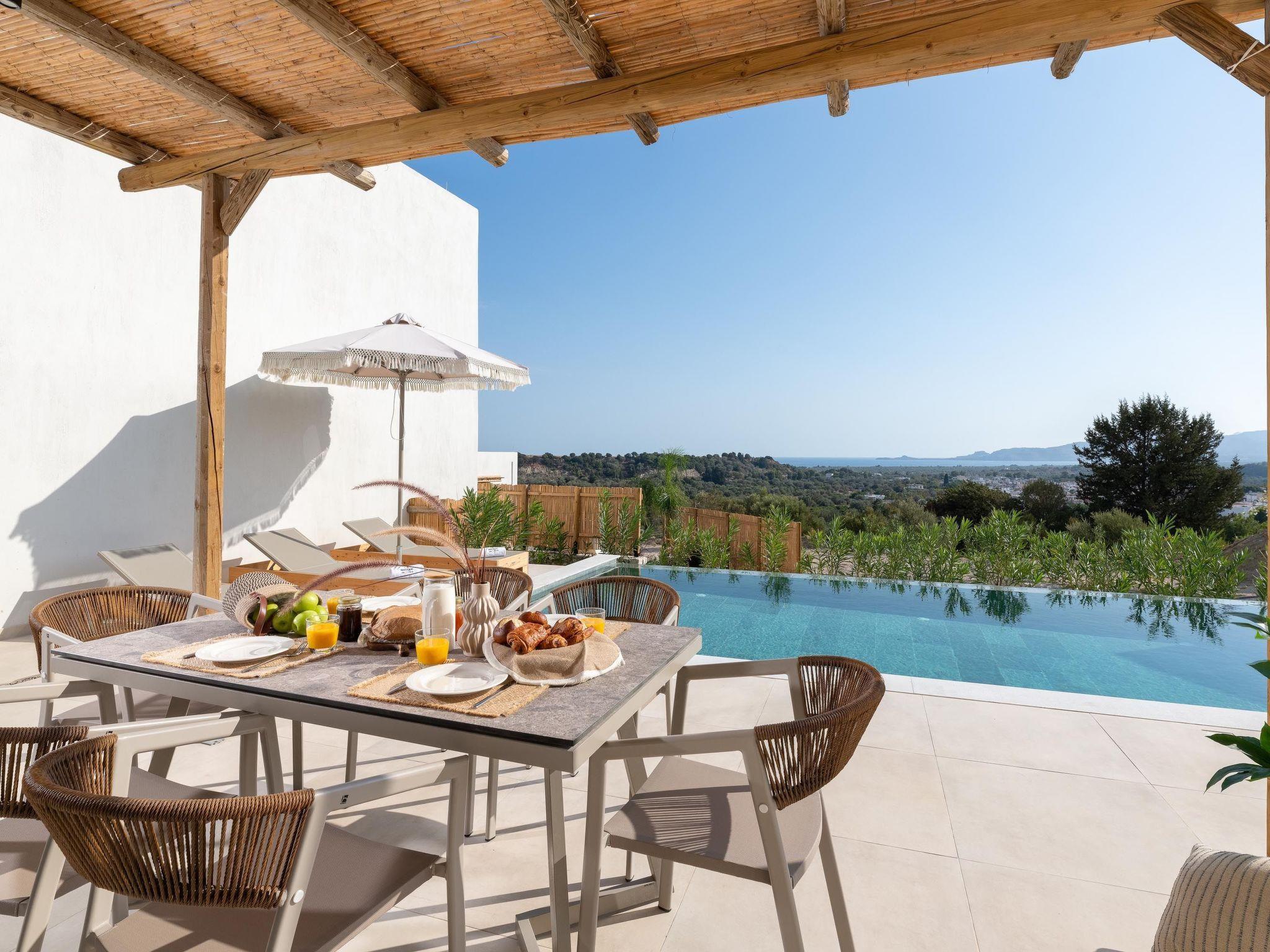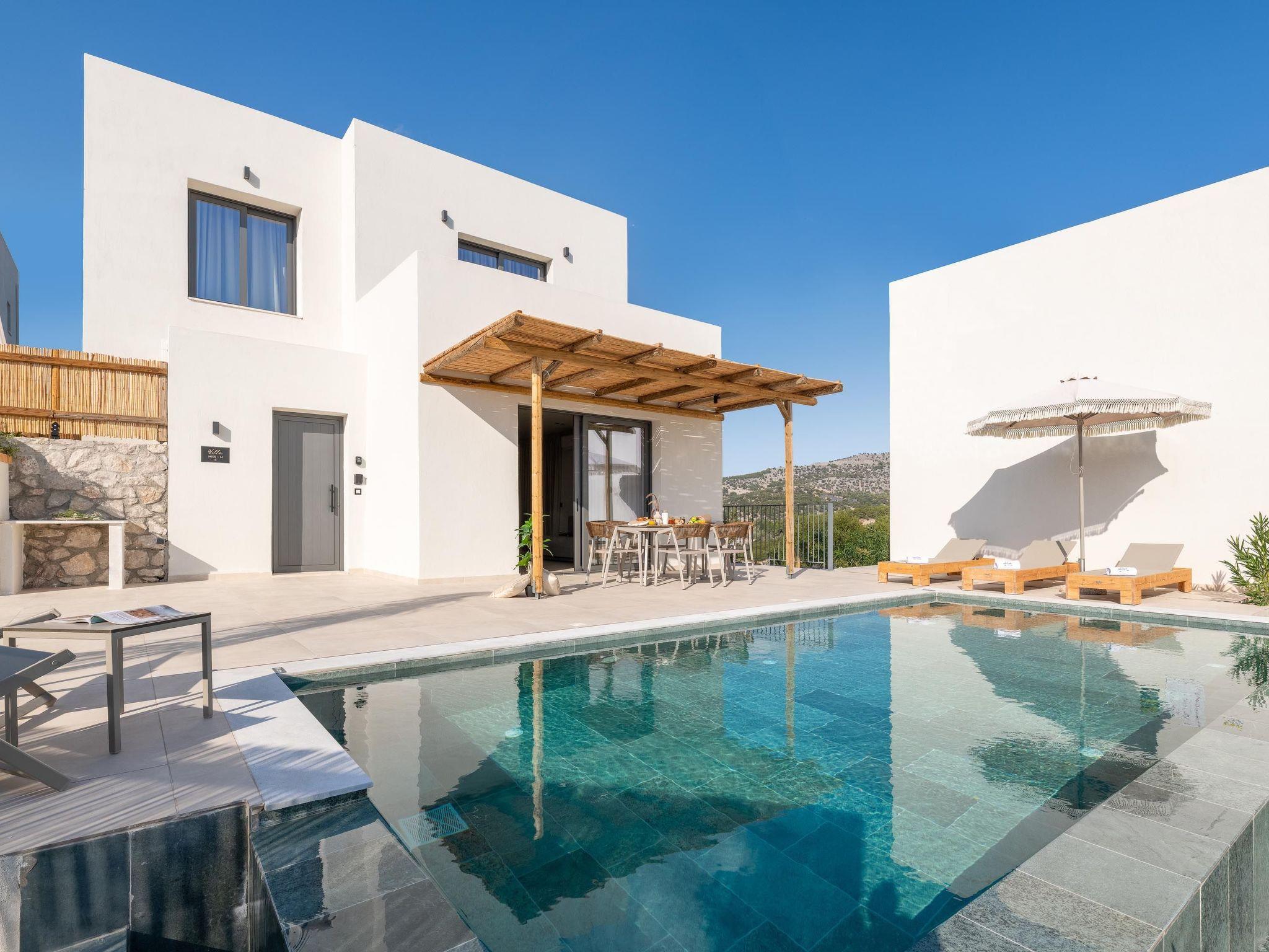 Massari Hills Luxury Living are 15 fantastic brand-new properties designed in unique minimal architecture with unique warm-colored details. They are located in Massari, only a 5-minute drive from Charaki beach. All of the modern villas provide you with all comforts, private swimming pools and patios in a unique design. There is an outdoor sharing gym and each villa offers a BBQ installation. Each property accommodates up to 8 guests.