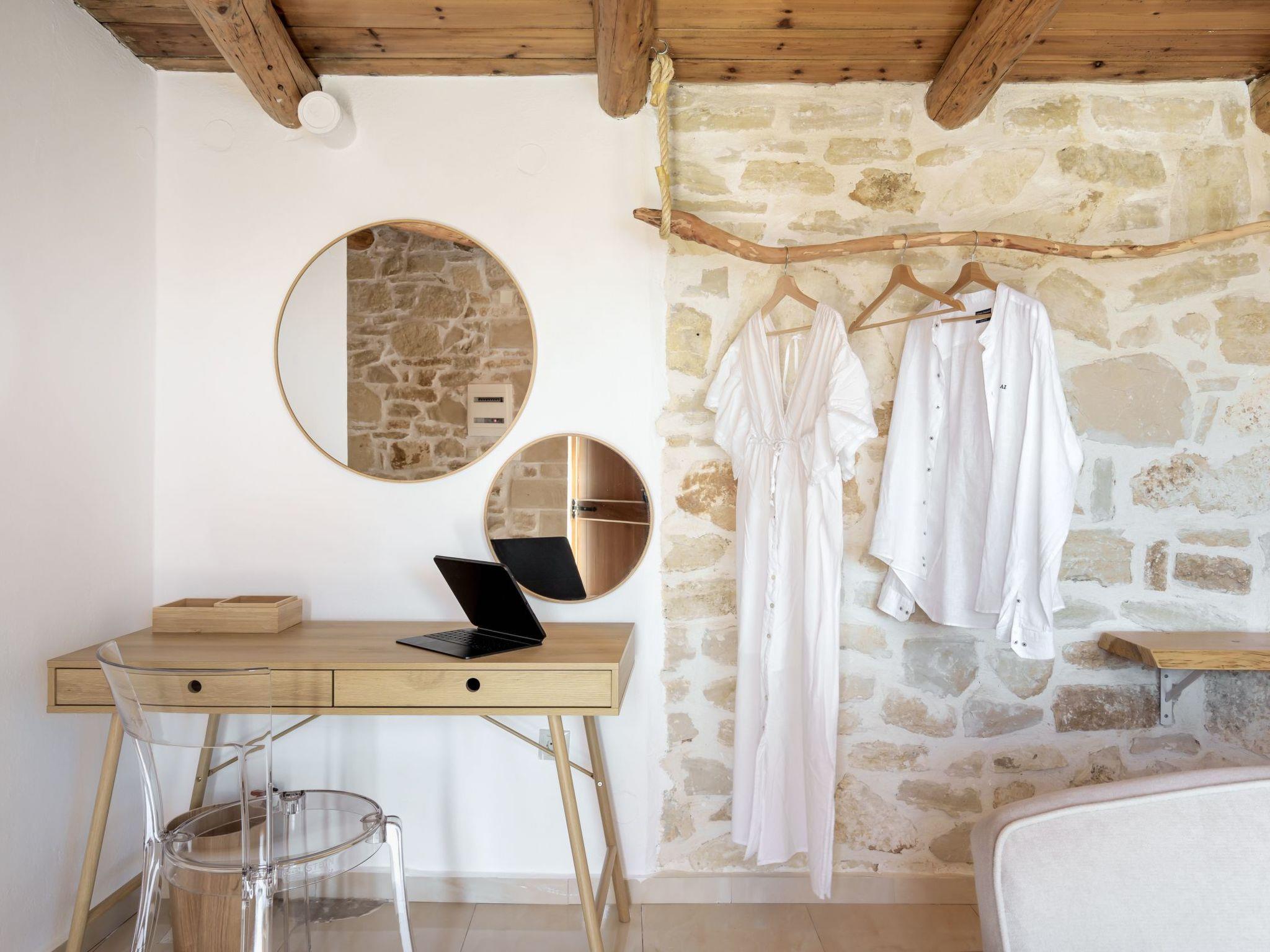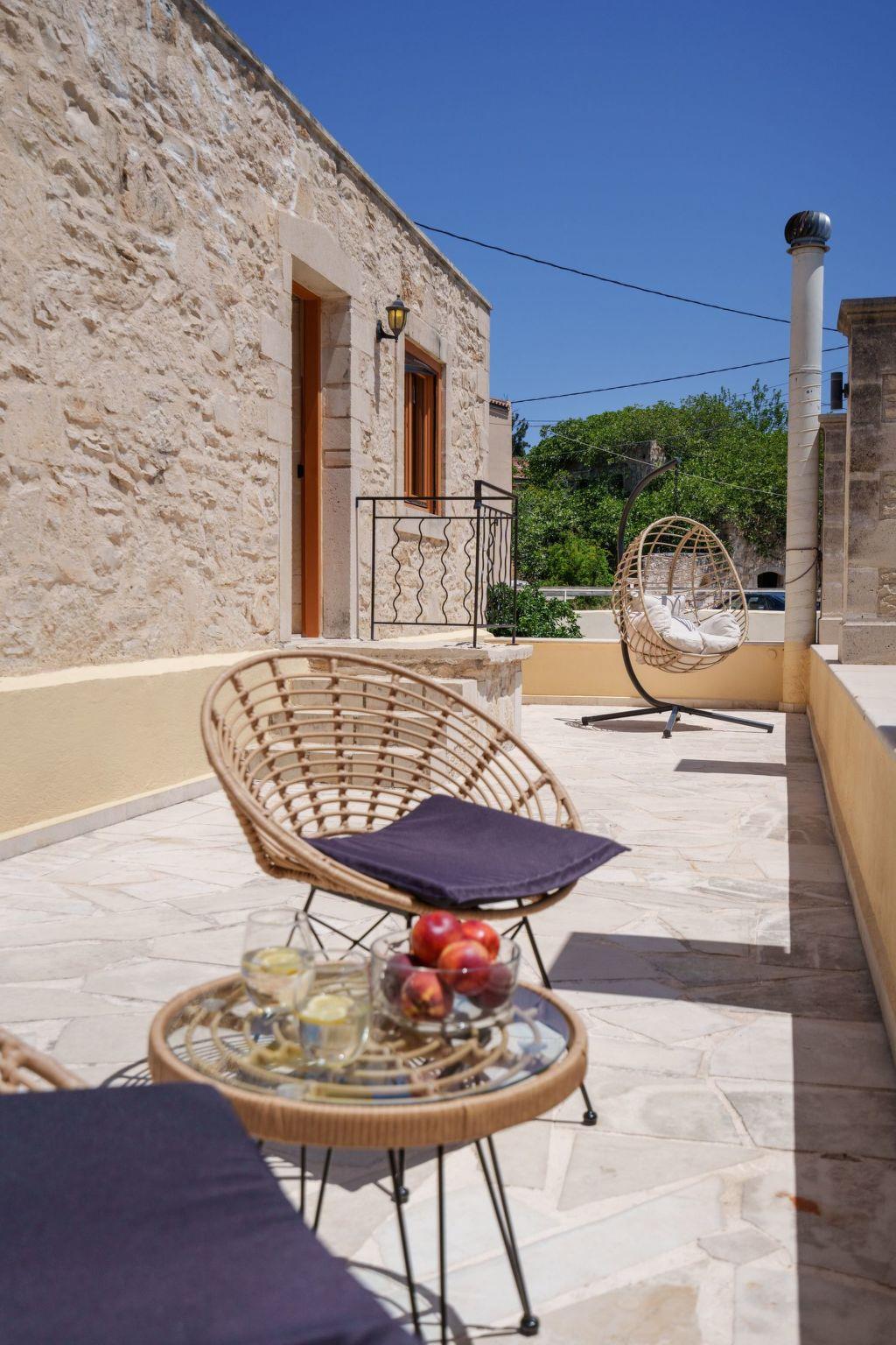 The highlight of the outdoor area is the private swimming pool, surrounded by comfortable sunbeds and umbrellas, offering an ideal space for lounging in the Cretan sun. For families with children, there is a separate children’s pool, ensuring a safe and fun place for younger guests to splash around.